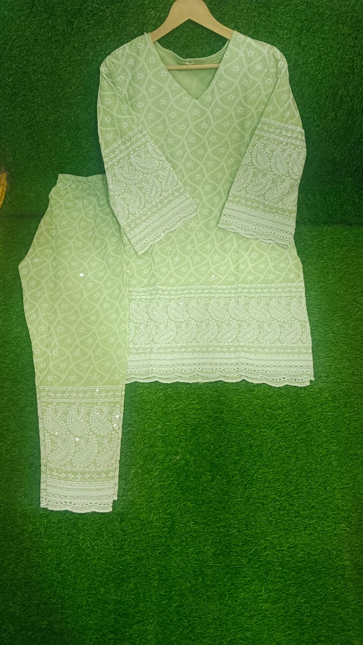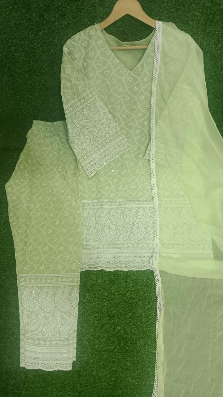 Celebrate effortless femininity with this Green Chikankari Embroidered Kurta Set with Dupatta. Designed to reflect refined charm, this ensemble is adorned with intricate all-over embroidery work, making it a versatile pick for festive occasions, casual gatherings, or elegant daywear.
