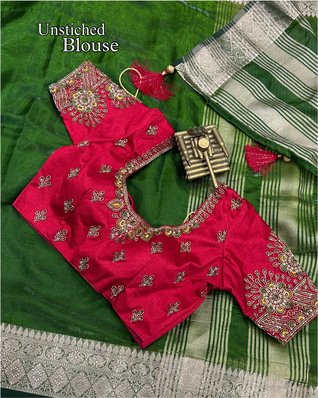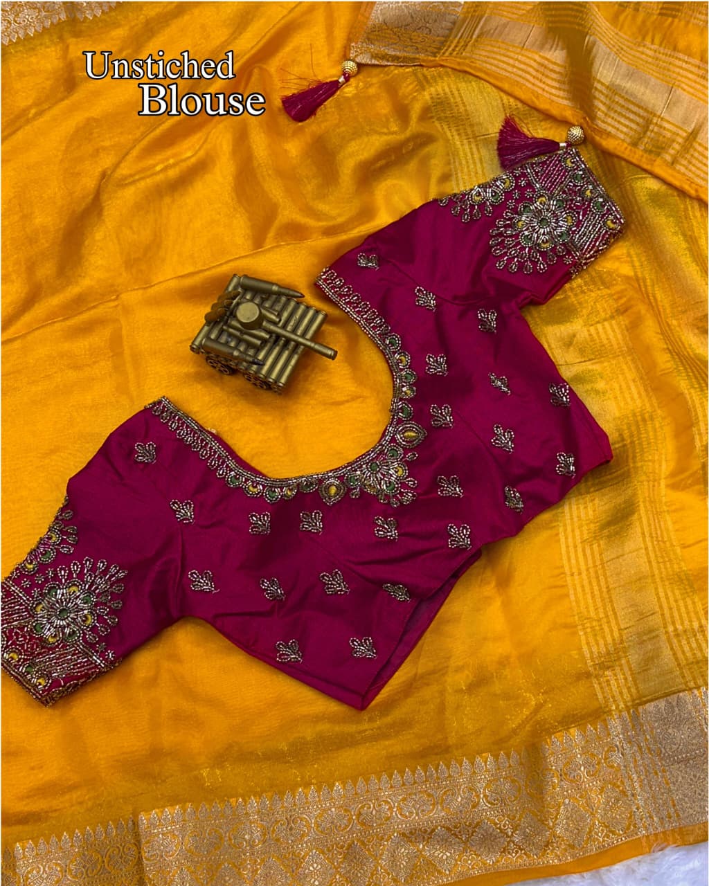 The blouse is a masterpiece of intricate handwork, featuring floral and geometric motifs crafted with shimmering beads, stones, and fine thread embroidery. The ornate detailing on the sleeves adds a luxurious touch, while the saree flows gracefully in lustrous fandy satin, enhanced with a beautifully woven border and tasseled pallu. Together, this combination radiates sophistication, making it perfect for weddings, festive celebrations, and grand occasions.