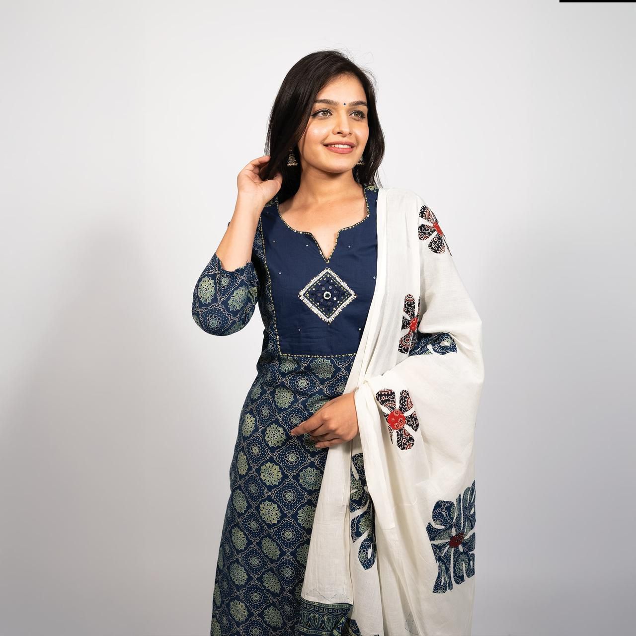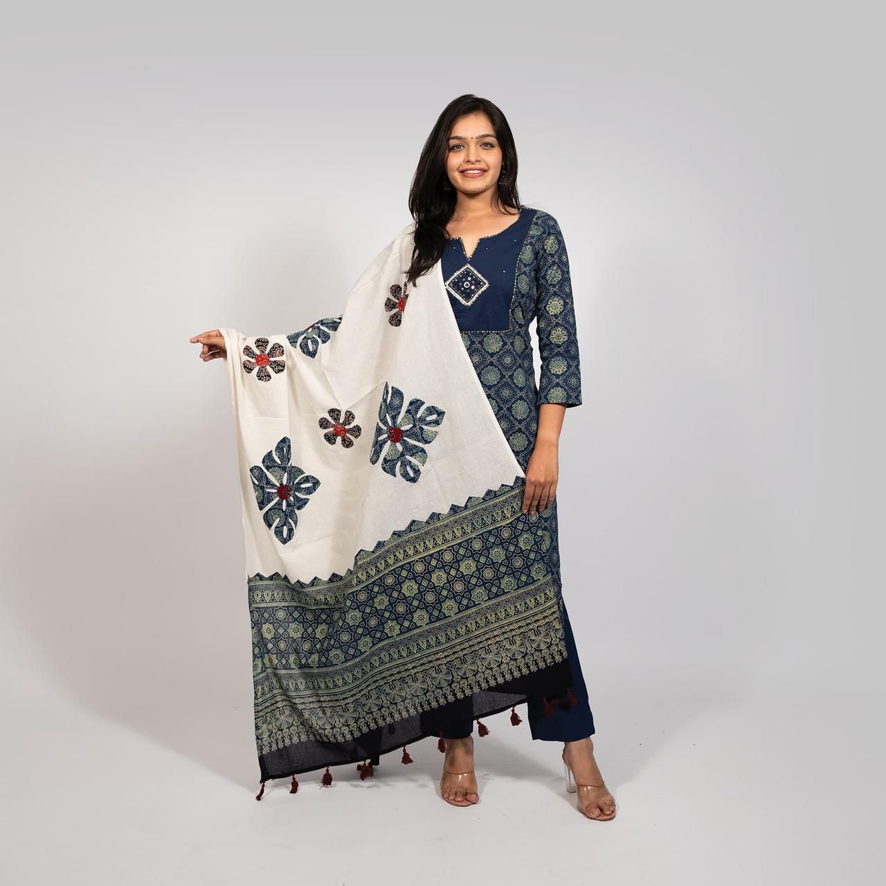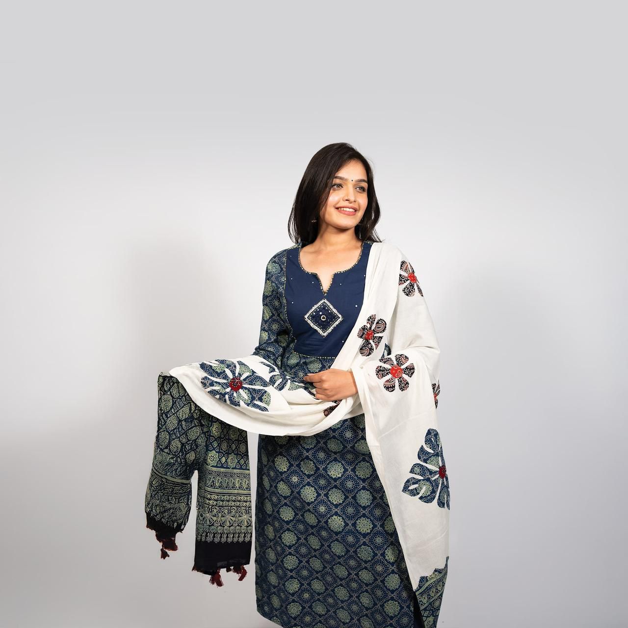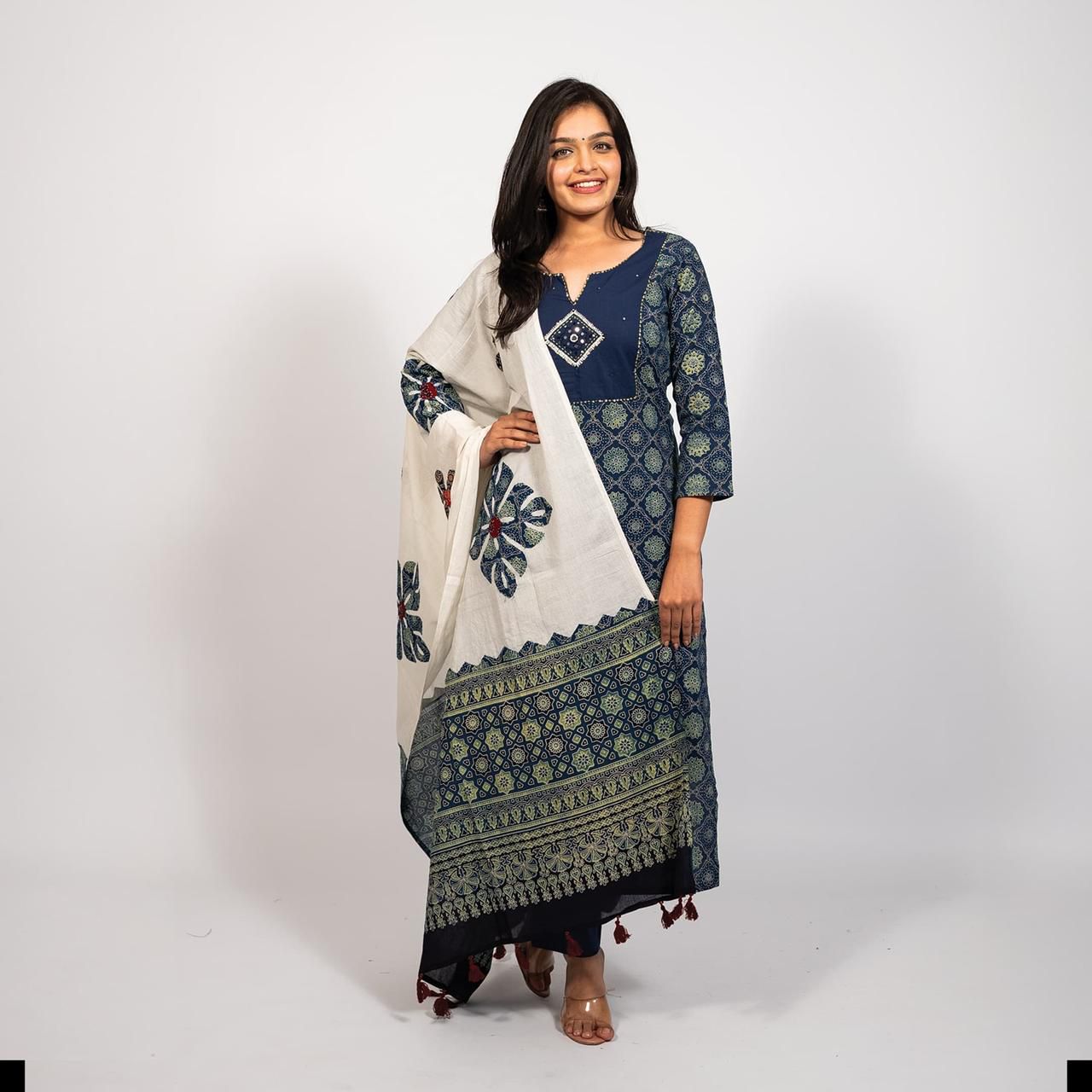 Ajrakh Print Cotton Straight Kurti Set with Dupatta.