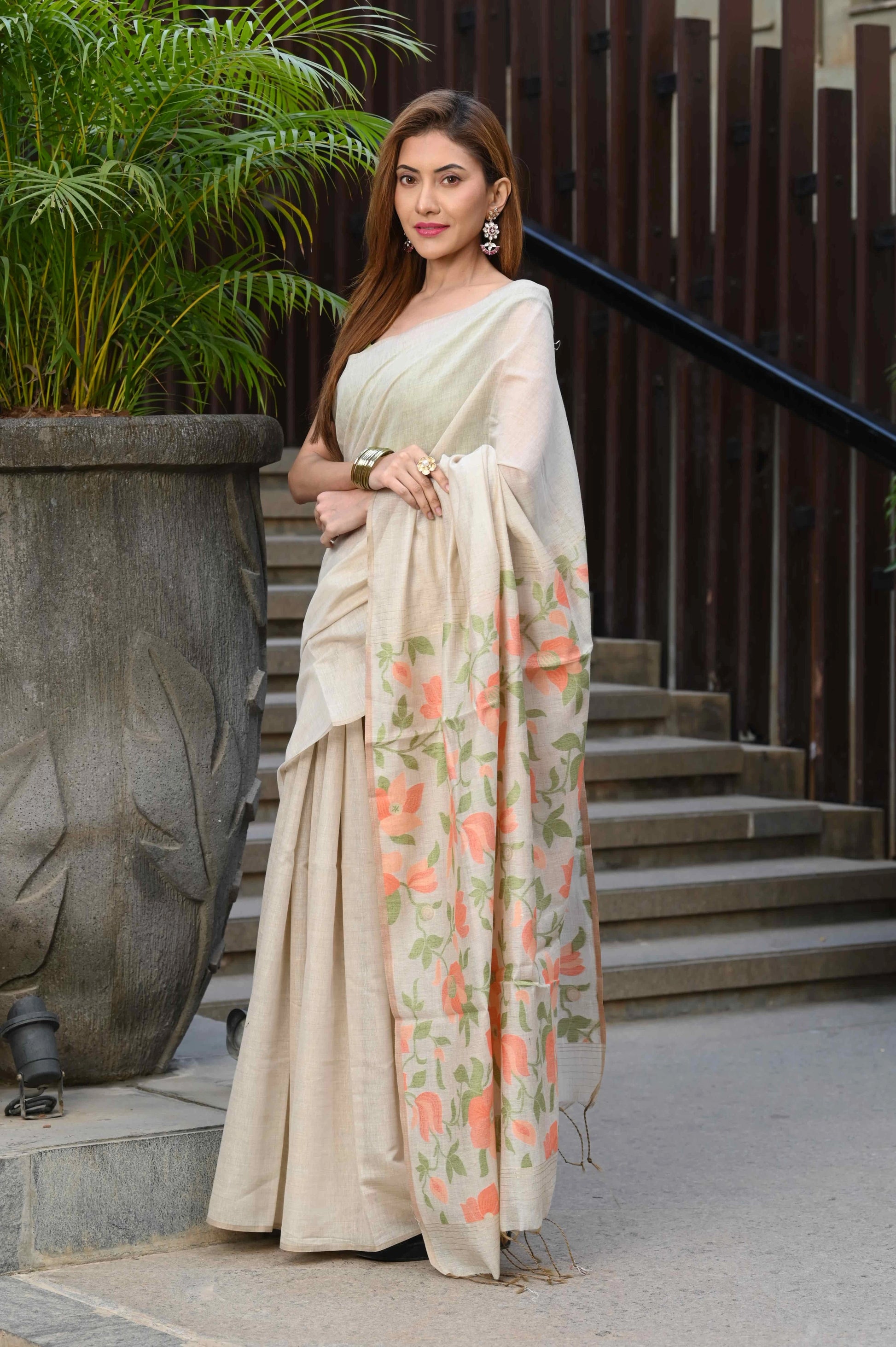 Beige Mul Muga Cotton Sunflower JAMDANI Saree