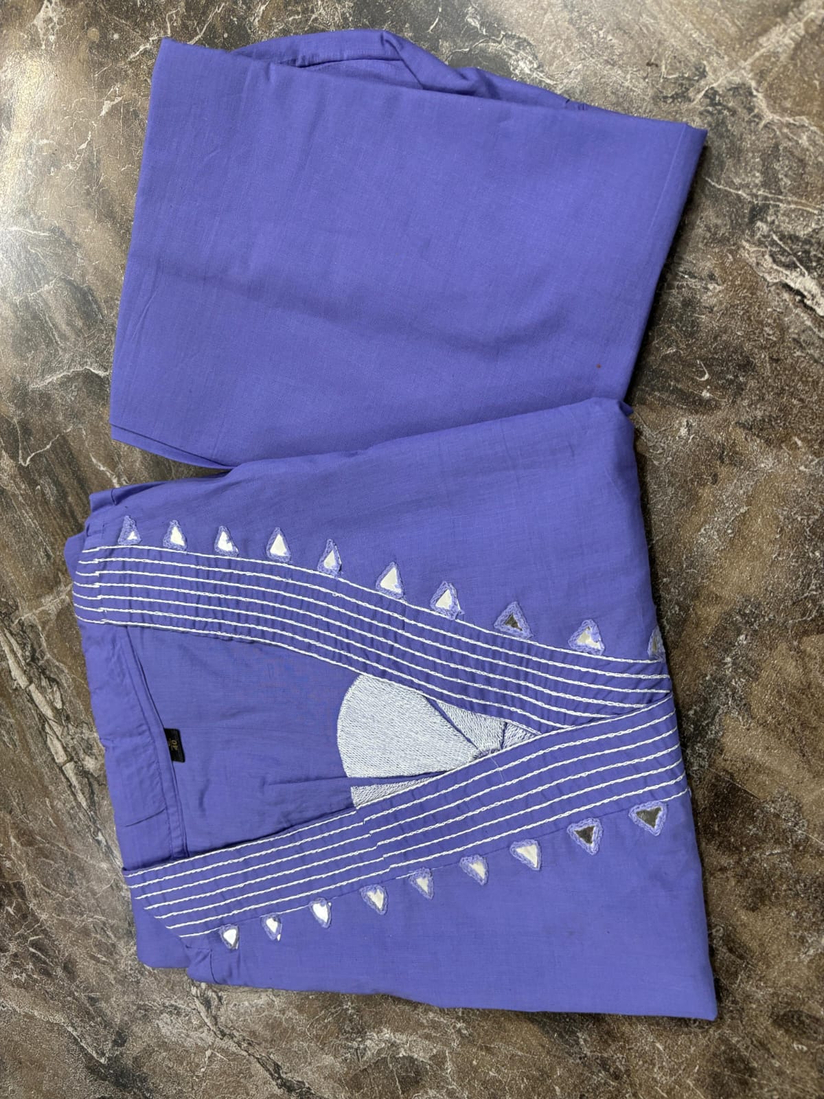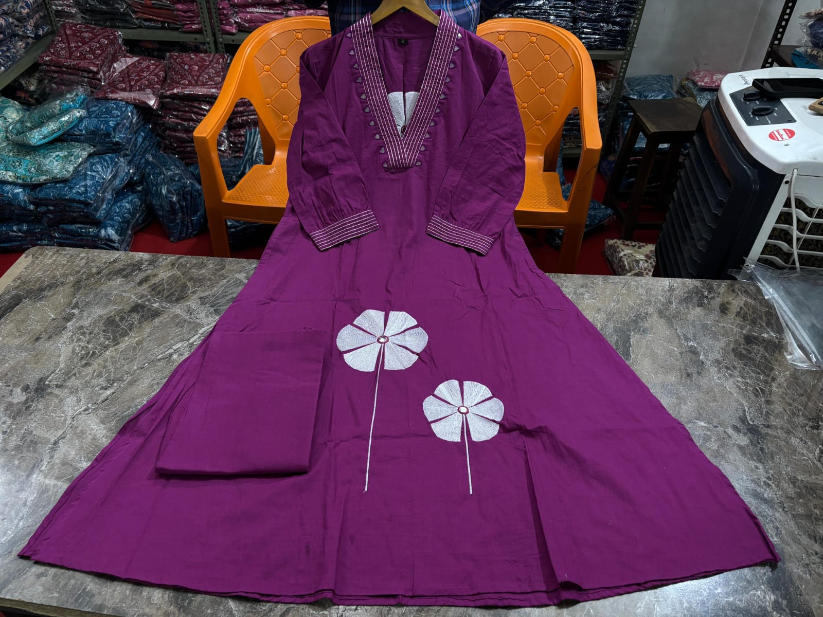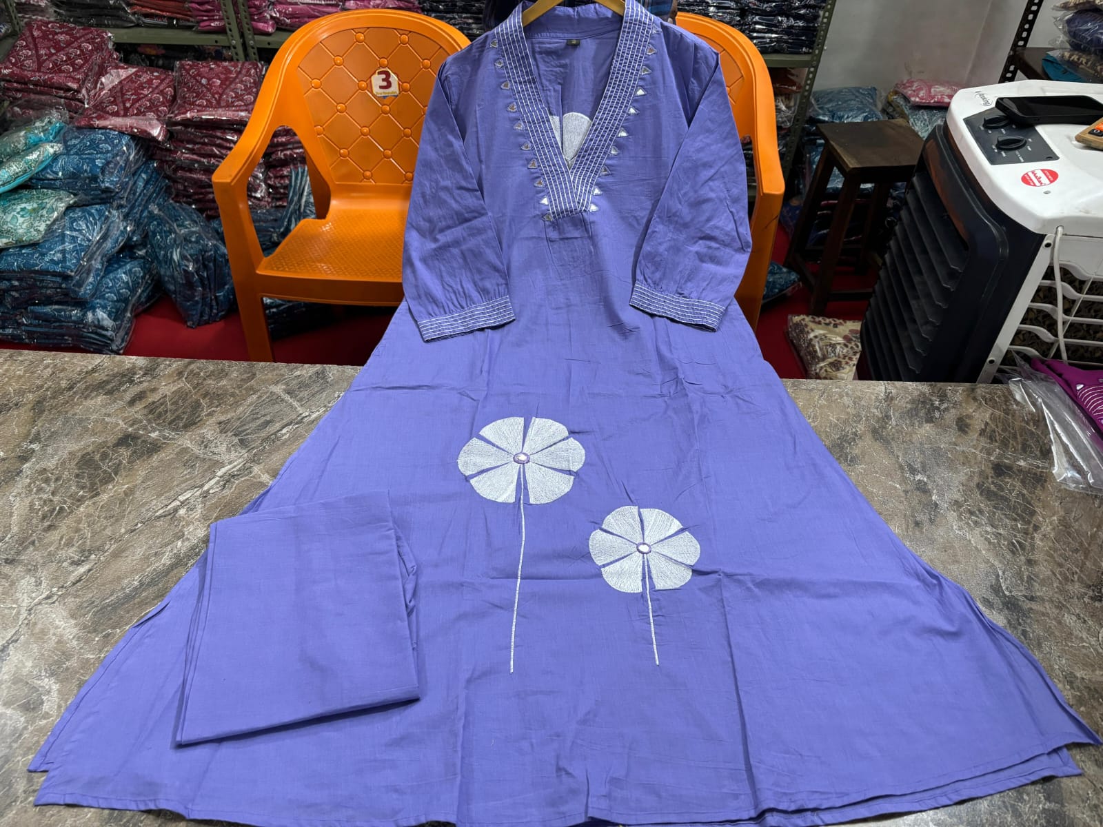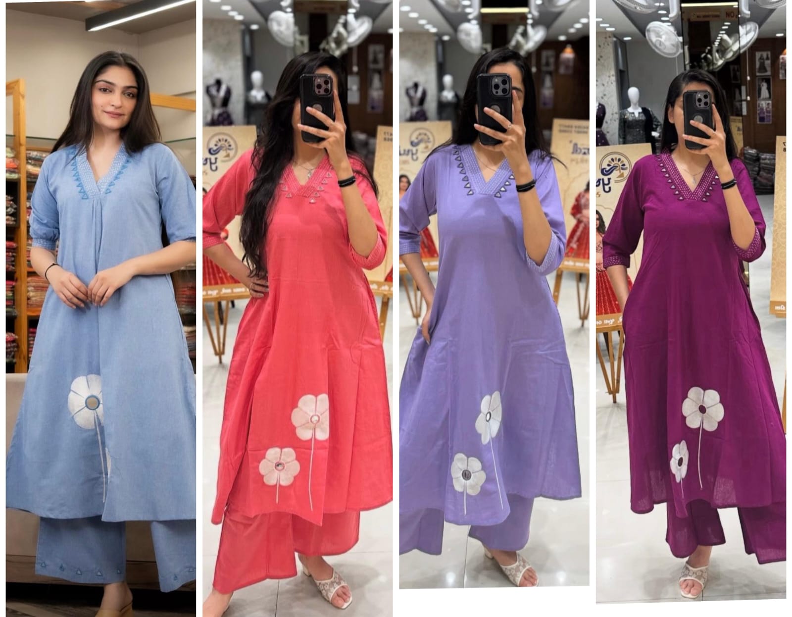 Step into timeless charm with this graceful lavender kurti set, featuring delicate white floral appliqué for a touch of freshness. The soft fabric drapes beautifully, while the V-neck with intricate detailing adds a hint of sophistication. Perfect for casual outings or light festive gatherings, this ensemble blends comfort with chic minimalism.
