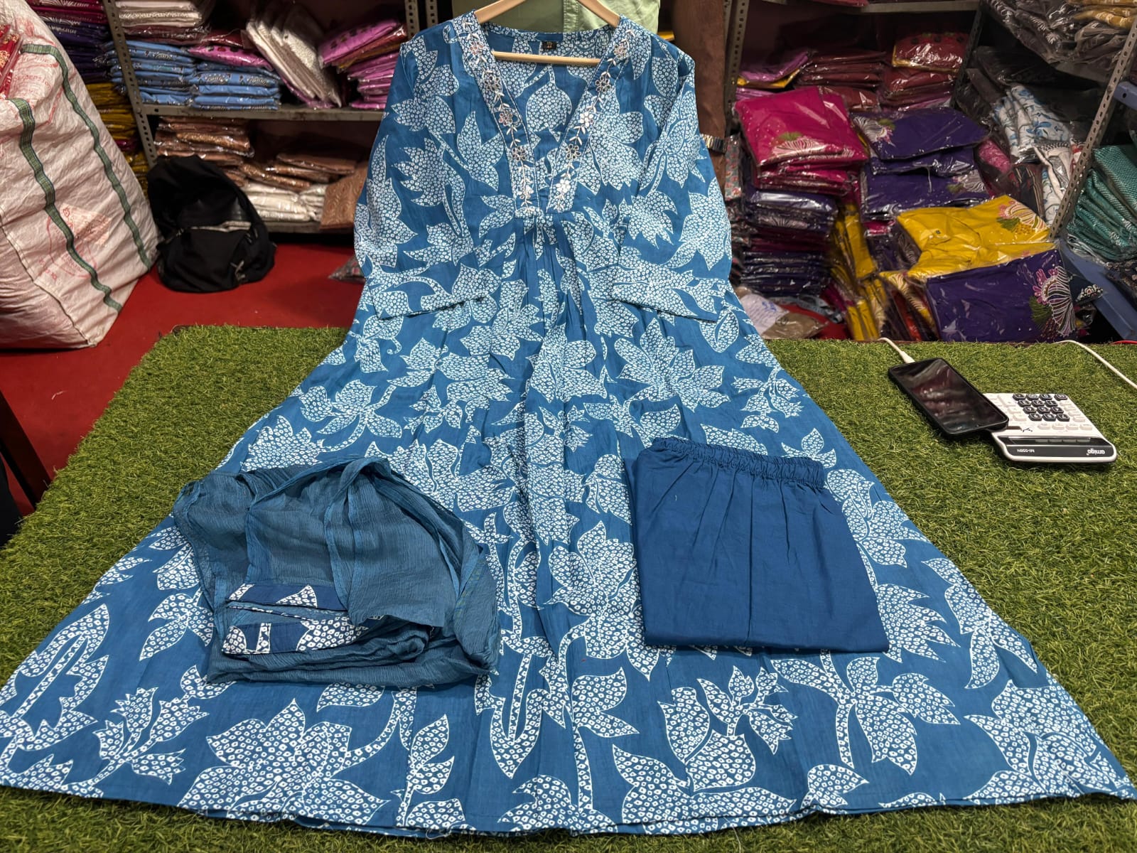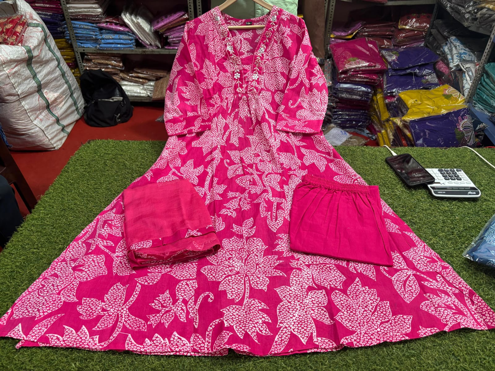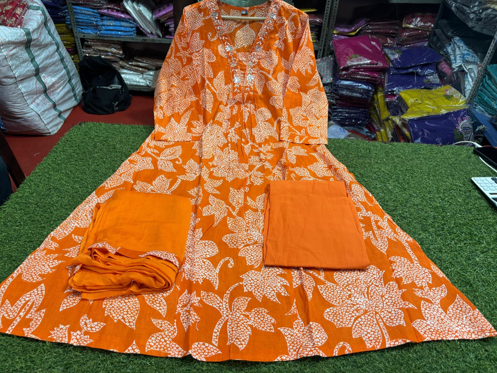 Step into timeless charm with this beautifully designed frock-style kurti set, perfect for both festive and casual wear. Made from premium cotton fabric, the kurti showcases a graceful floral print, complemented by delicate embroidery on the neckline. The matching cotton pants add a structured finish, while the mul mul cotton dupatta drapes effortlessly to complete the look.