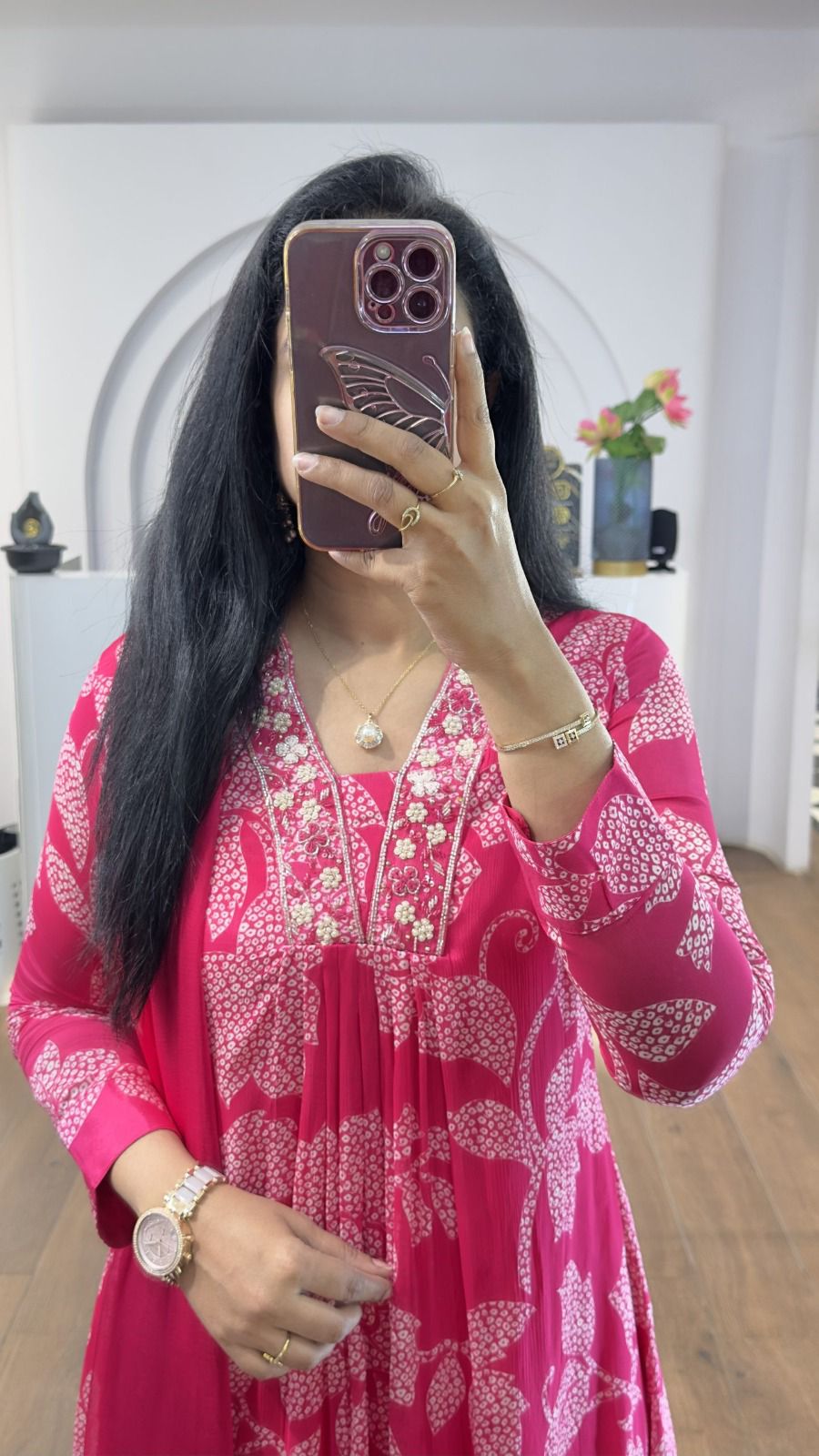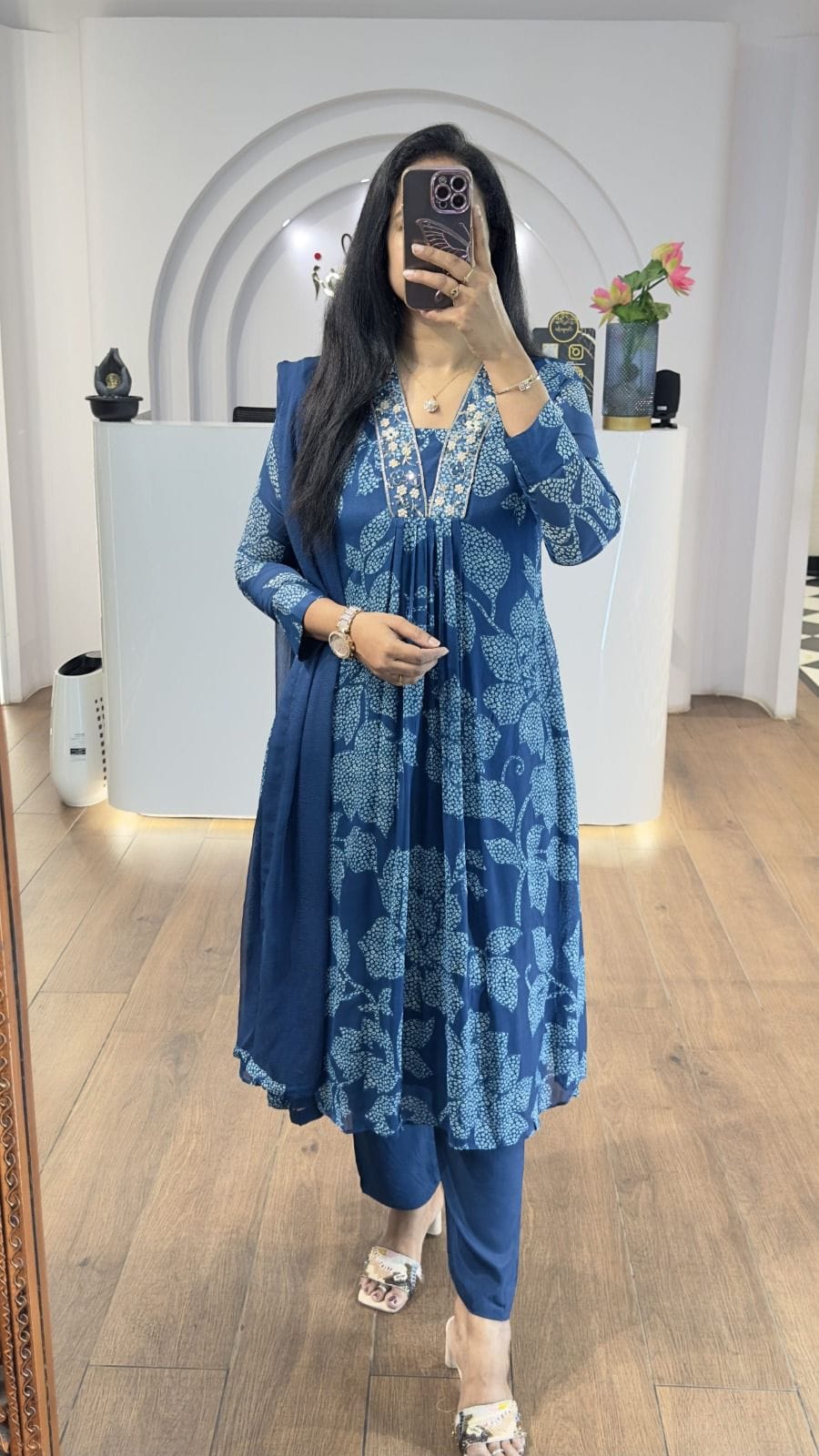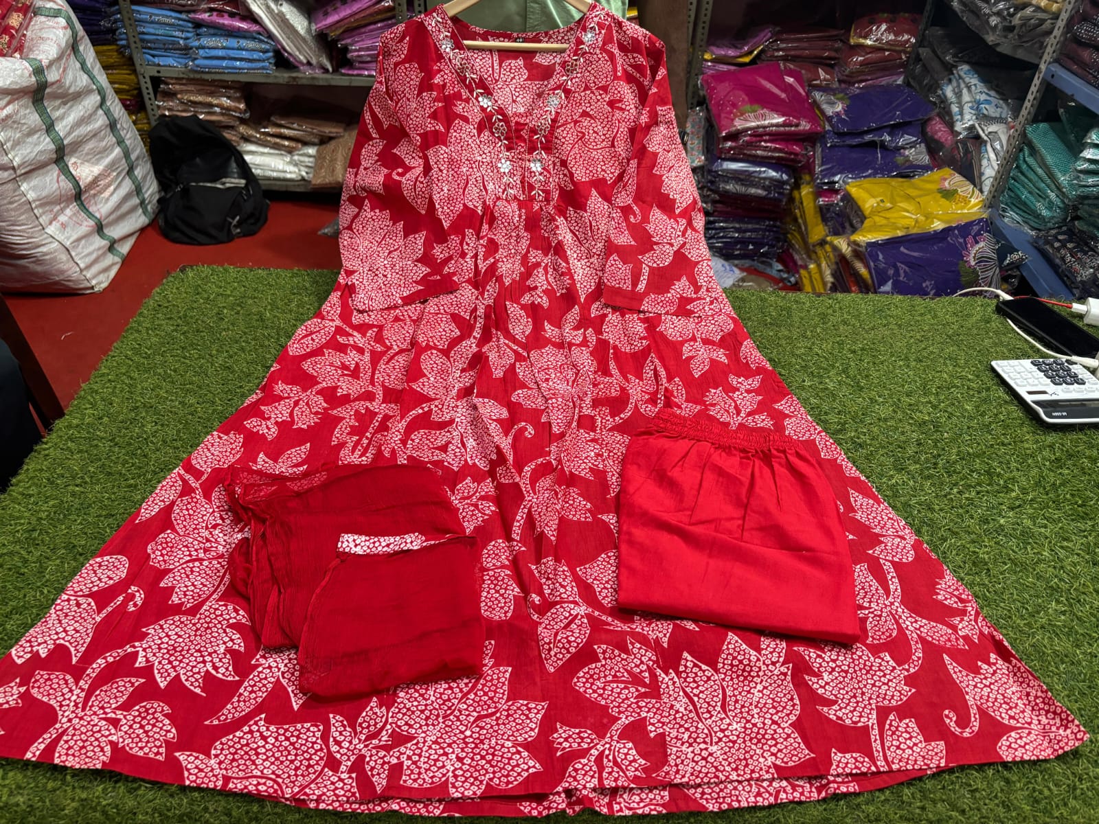 Step into timeless charm with this beautifully designed frock-style kurti set, perfect for both festive and casual wear. Made from premium cotton fabric, the kurti showcases a graceful floral print, complemented by delicate embroidery on the neckline. The matching cotton pants add a structured finish, while the mul mul cotton dupatta drapes effortlessly to complete the look.