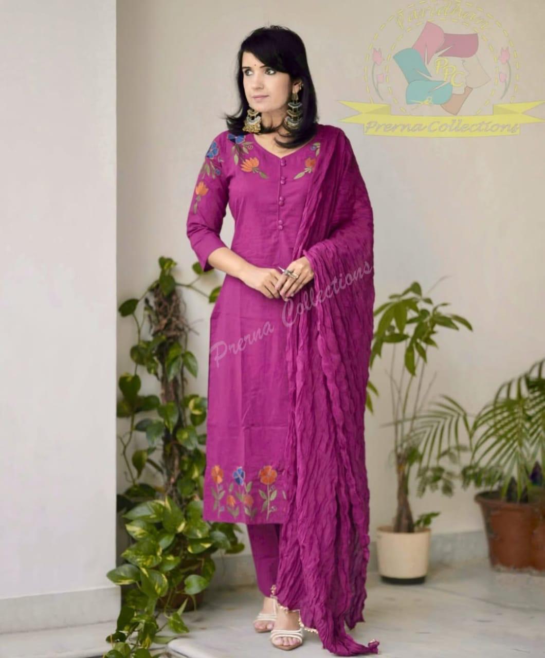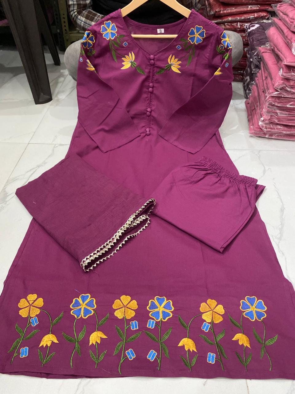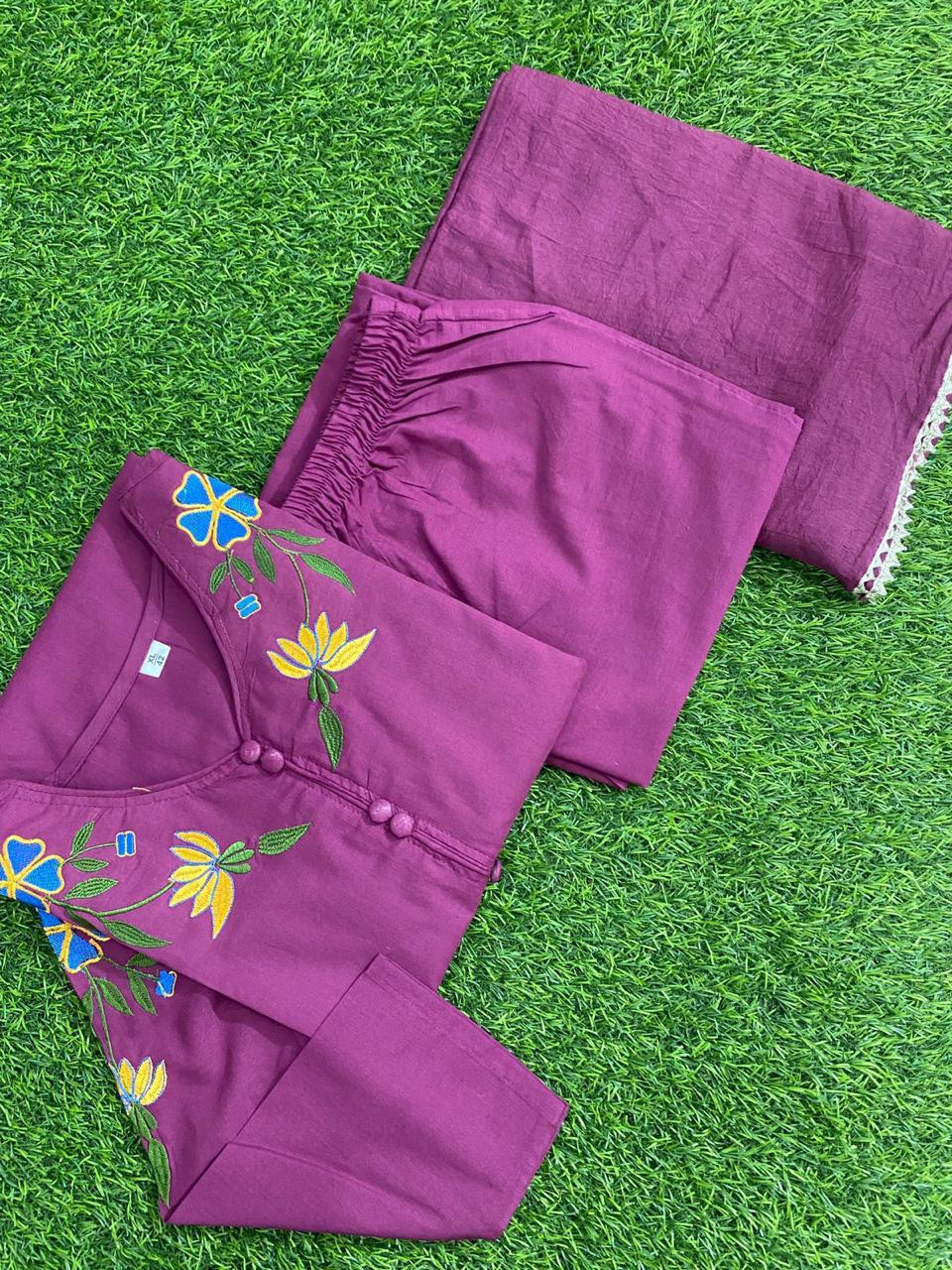 Step into graceful charm with this stunning deep magenta Kurti set, adorned with vibrant floral embroidery in sunny yellows and calming blues. The delicate thread work on the neckline and hemline adds a touch of artistry, while the matching bottoms complete the sophisticated look. Crafted from soft, breathable pure cotton, this ensemble offers comfort without compromising on style, making it perfect for festive gatherings, casual outings, or everyday elegance.