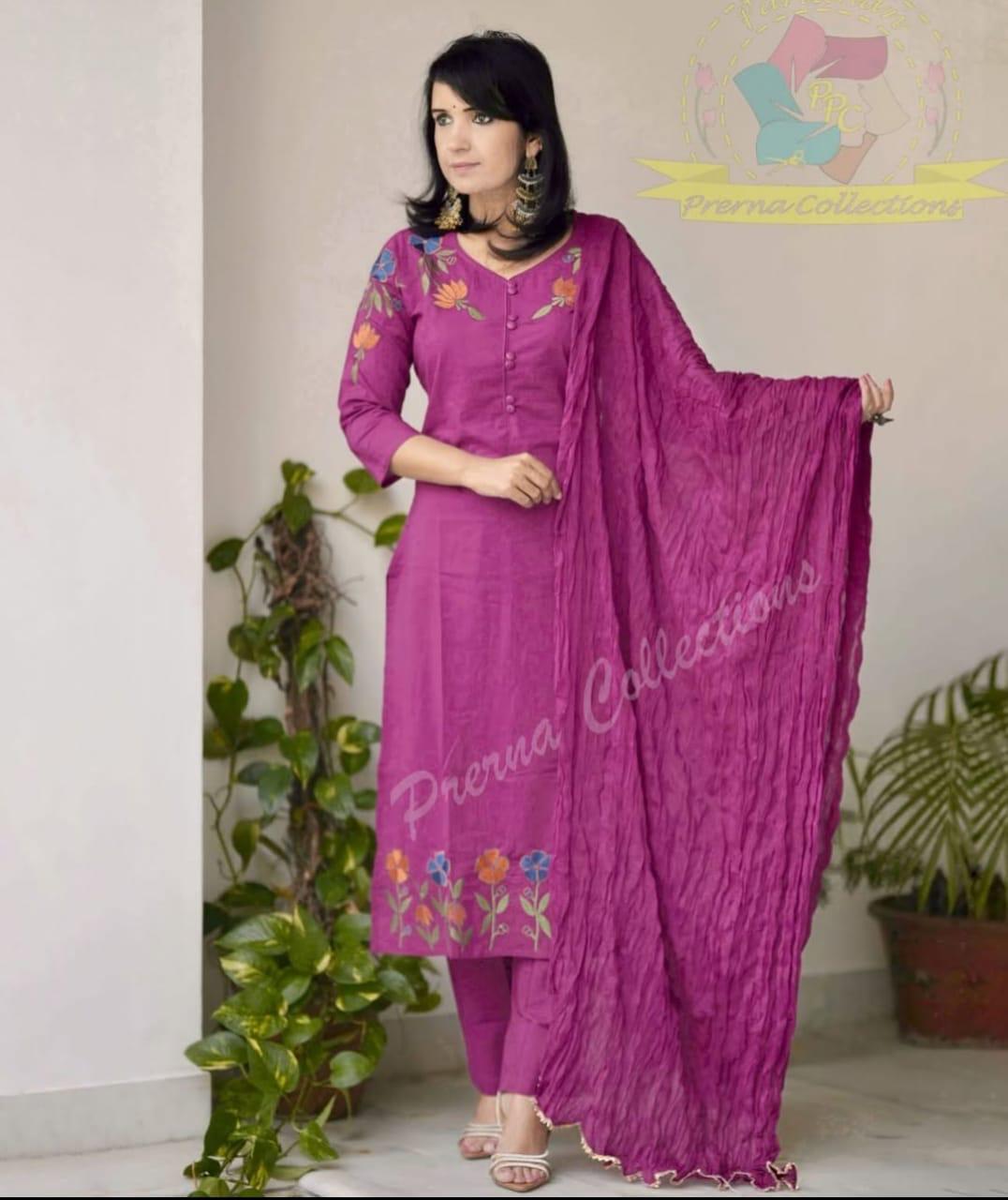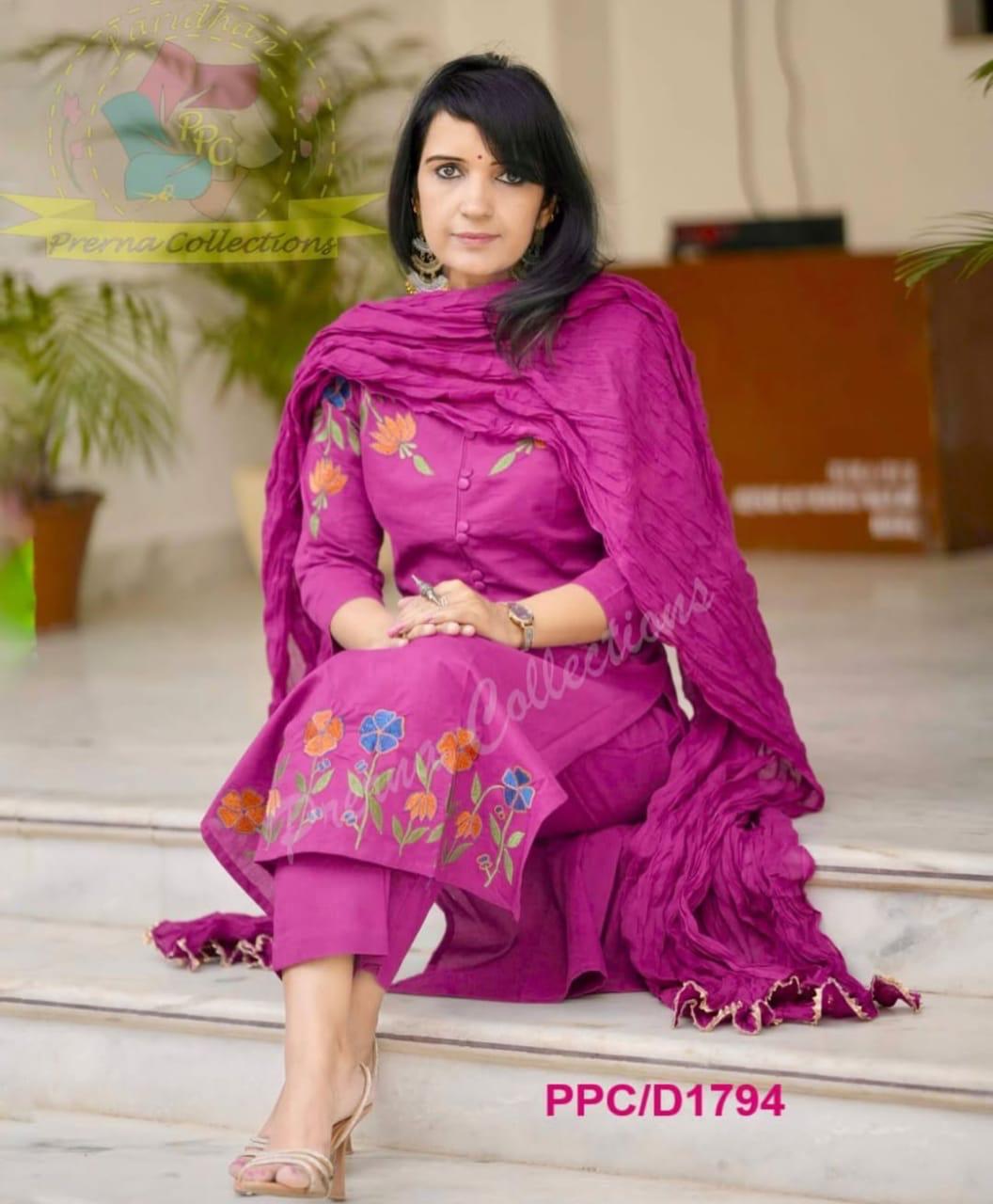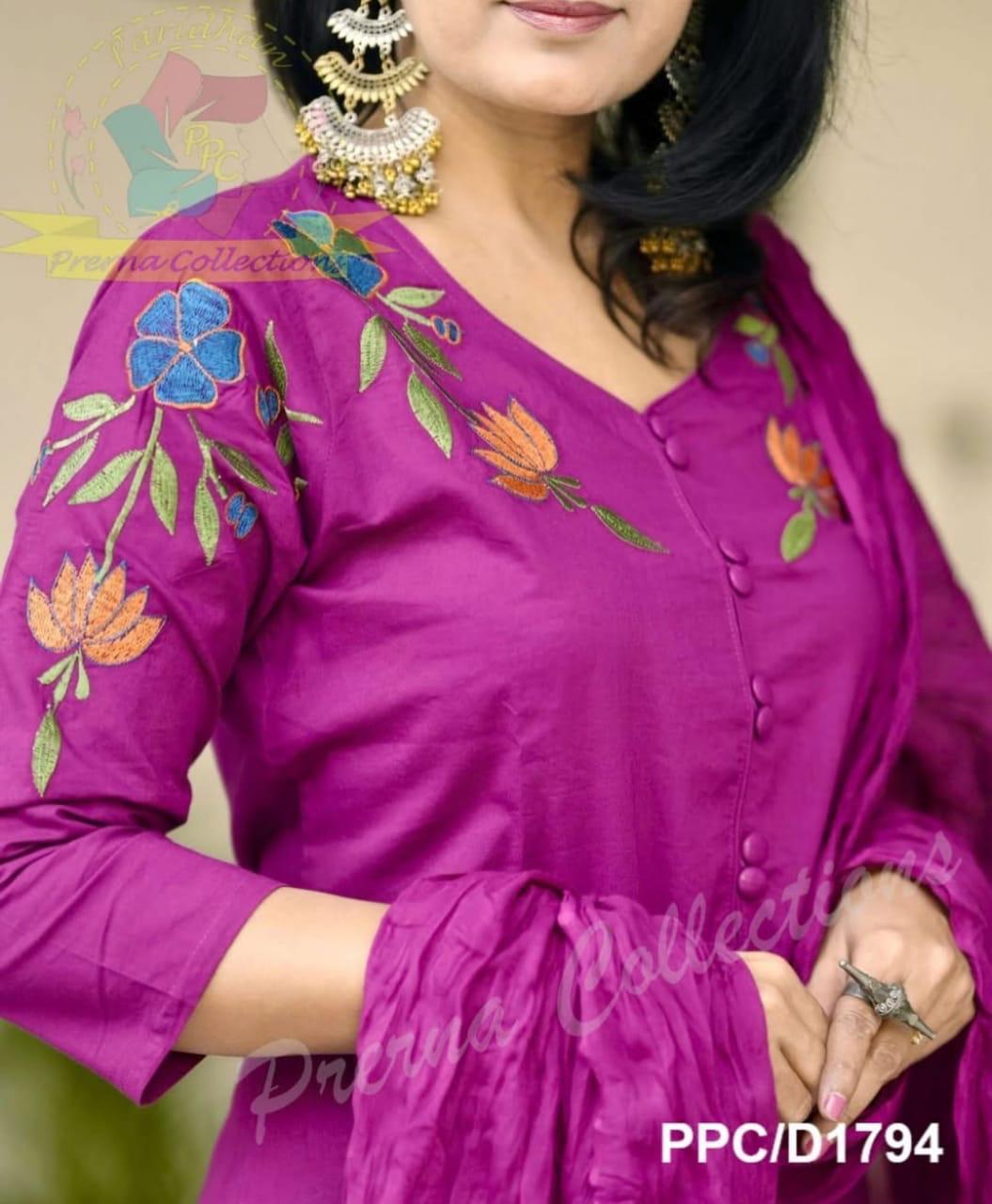 Step into graceful charm with this stunning deep magenta Kurti set, adorned with vibrant floral embroidery in sunny yellows and calming blues. The delicate thread work on the neckline and hemline adds a touch of artistry, while the matching bottoms complete the sophisticated look. Crafted from soft, breathable pure cotton, this ensemble offers comfort without compromising on style, making it perfect for festive gatherings, casual outings, or everyday elegance.