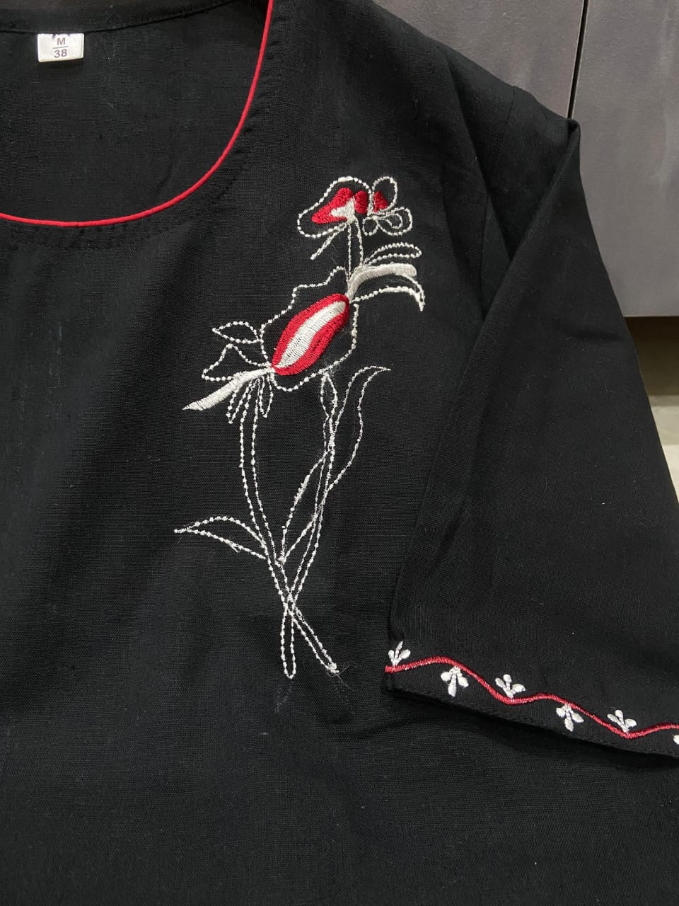 Front Embroidery: Features a delicate floral motif in red and white threads, thoughtfully positioned across the chest to elevate femininity and artistry.