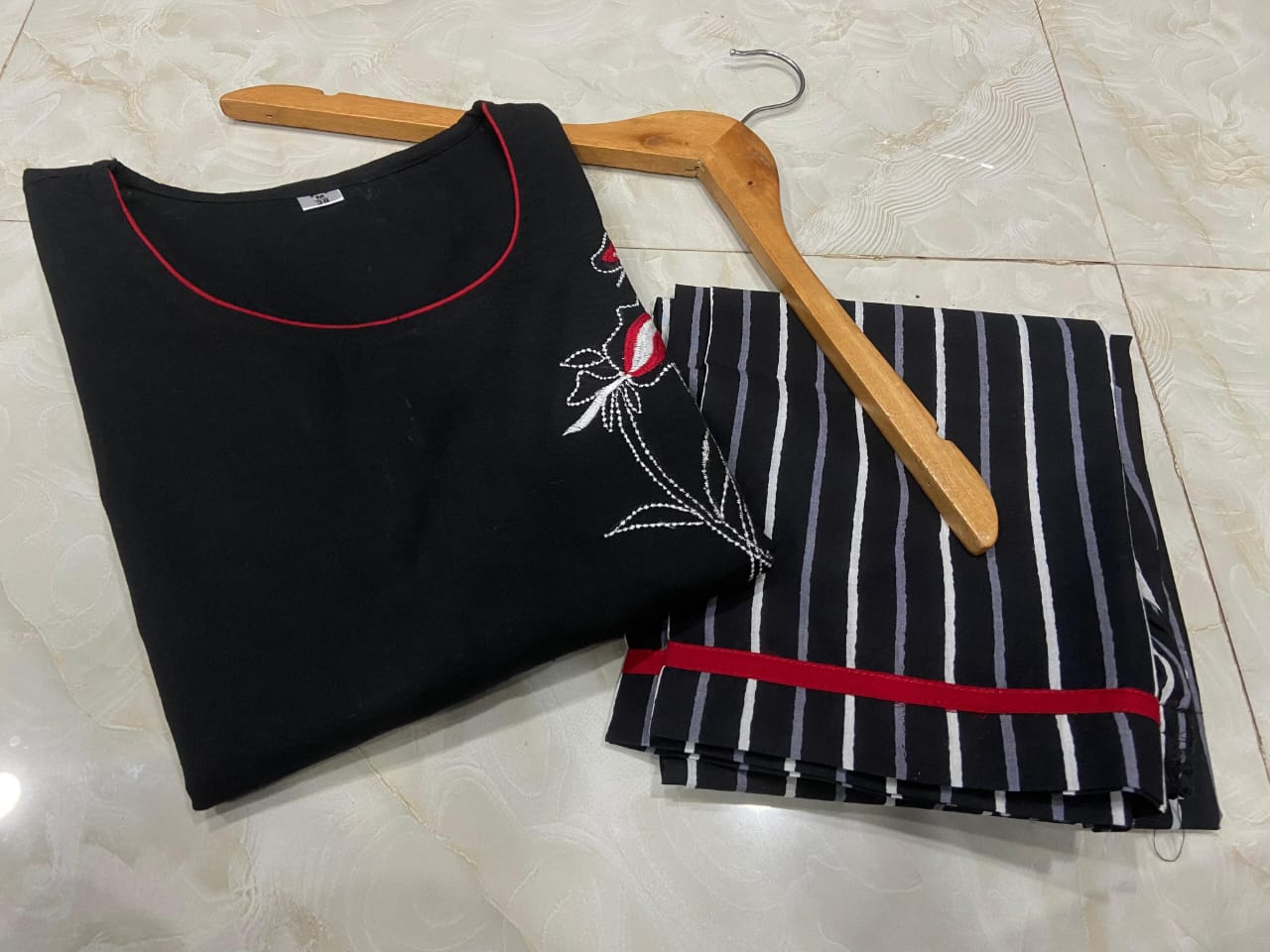 Pant Style: Complements the kurti with black straight pants adorned with vertical red and white stripes—introducing both contrast and cohesion in one stylish package.
