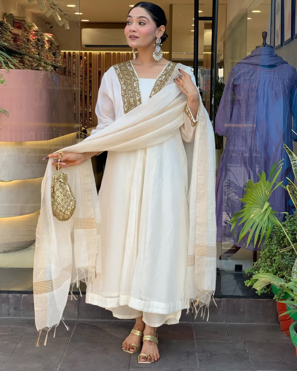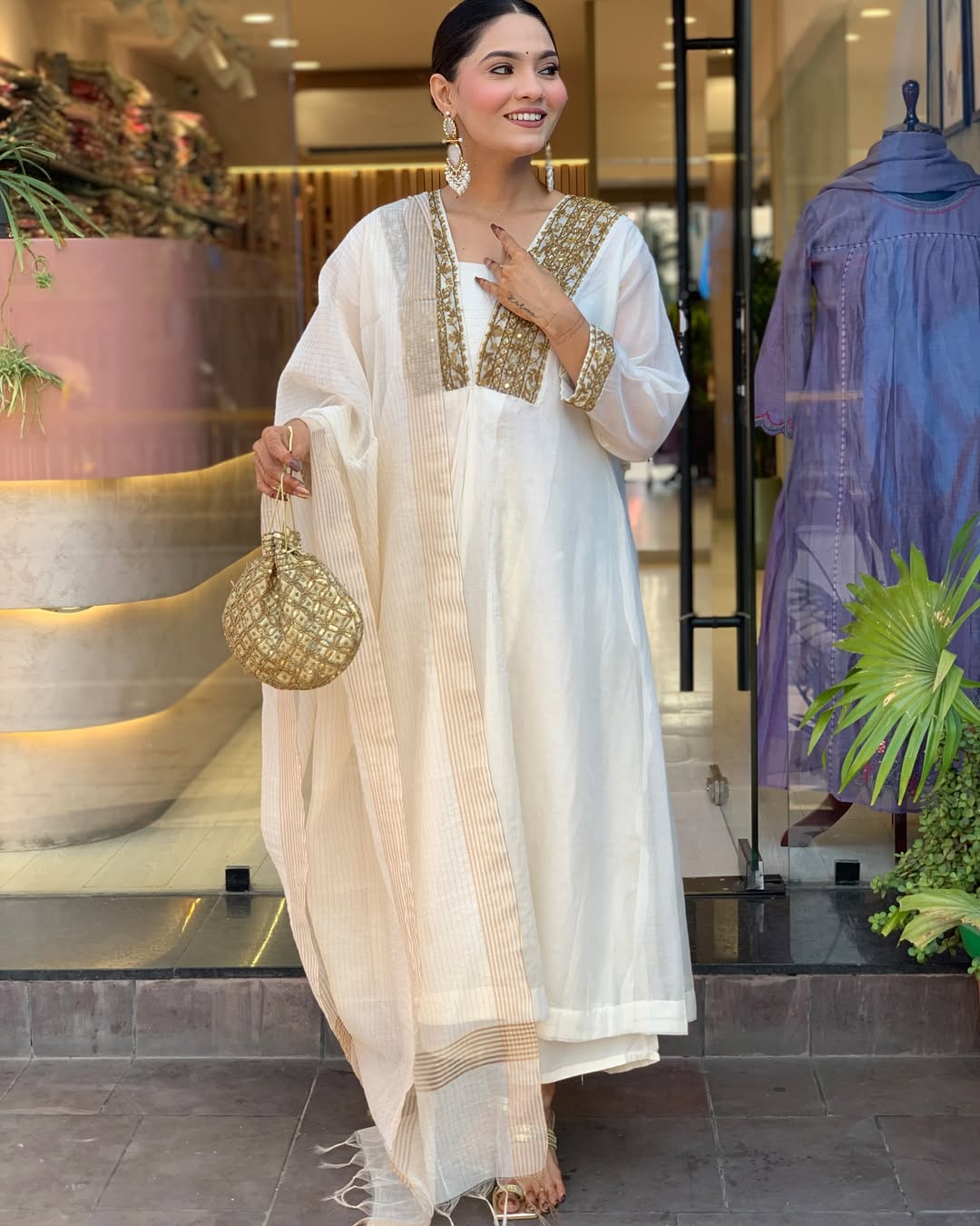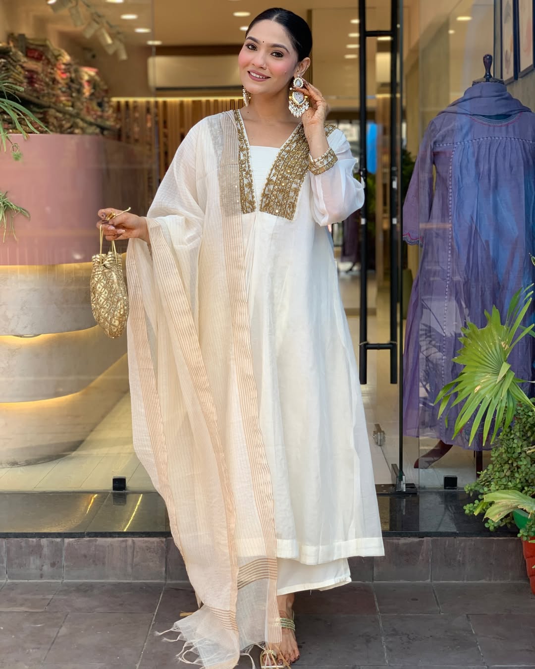 Classic White Chanderi Suit Set with Cotton Pant & Dupatta.