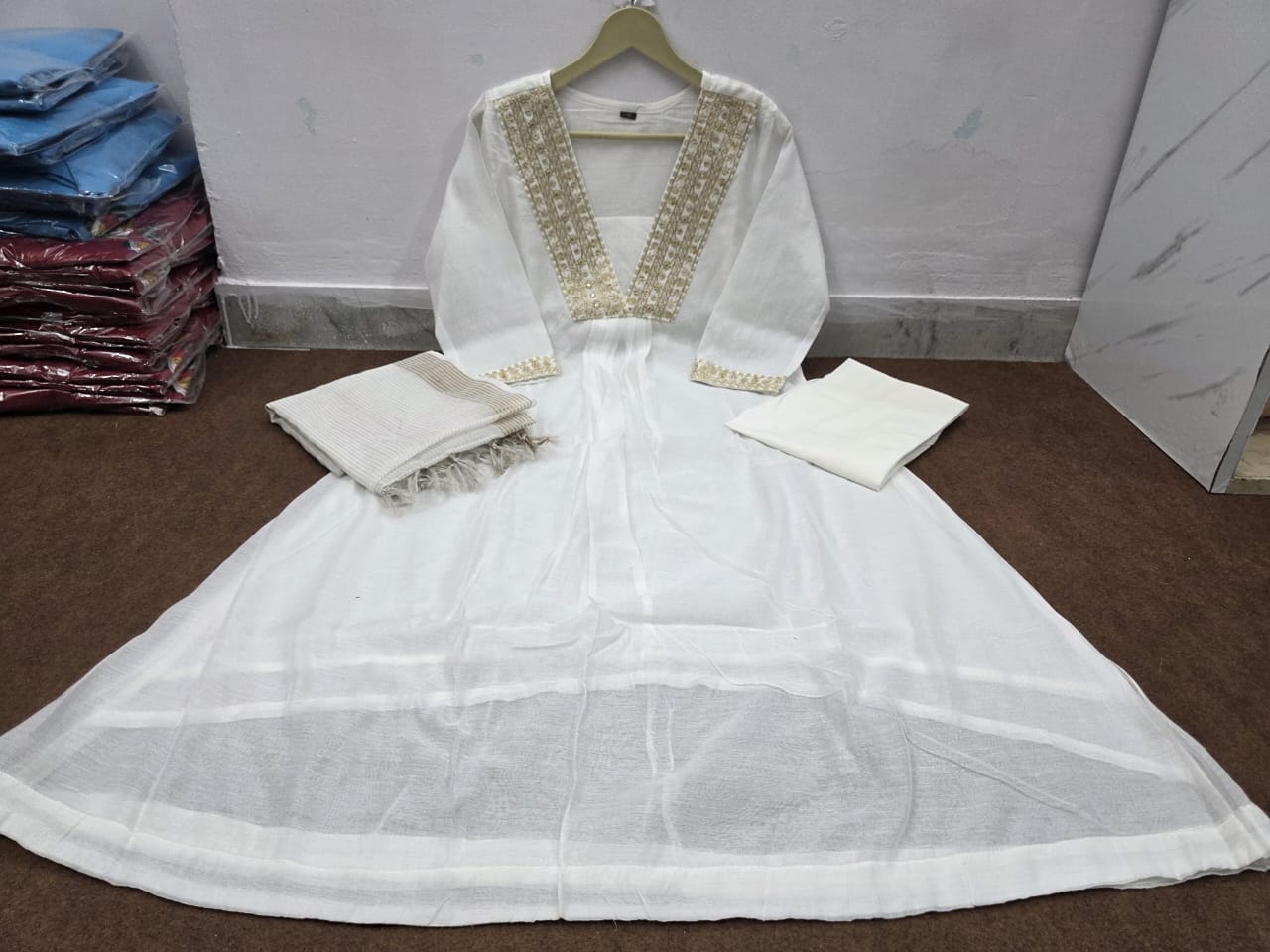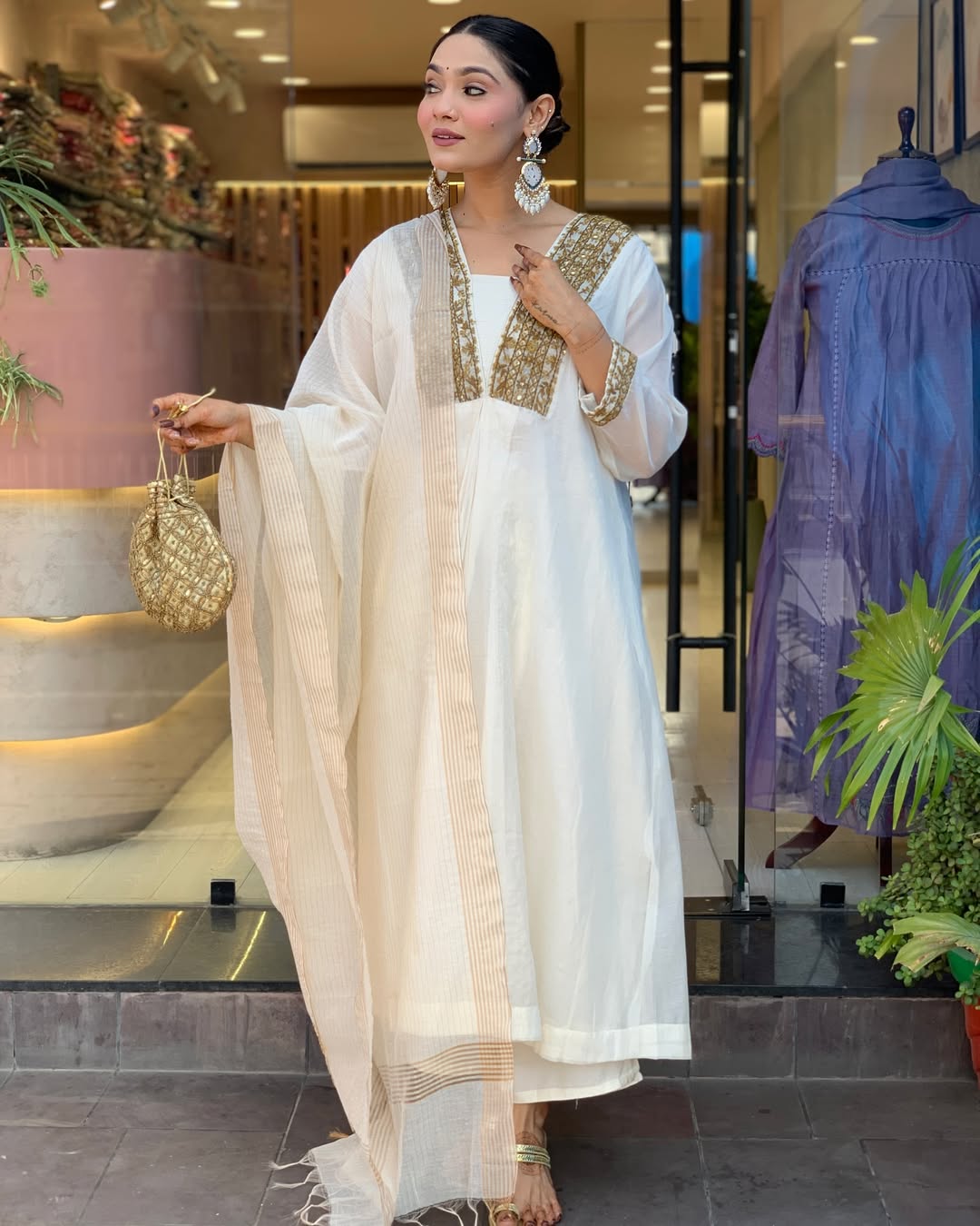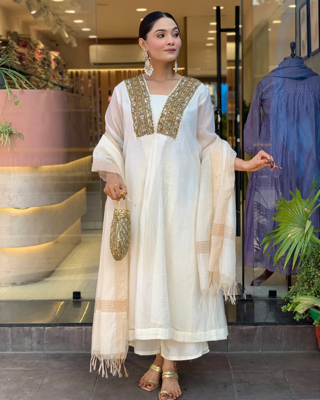 Classic White Chanderi Suit Set with Cotton Pant & Dupatta.