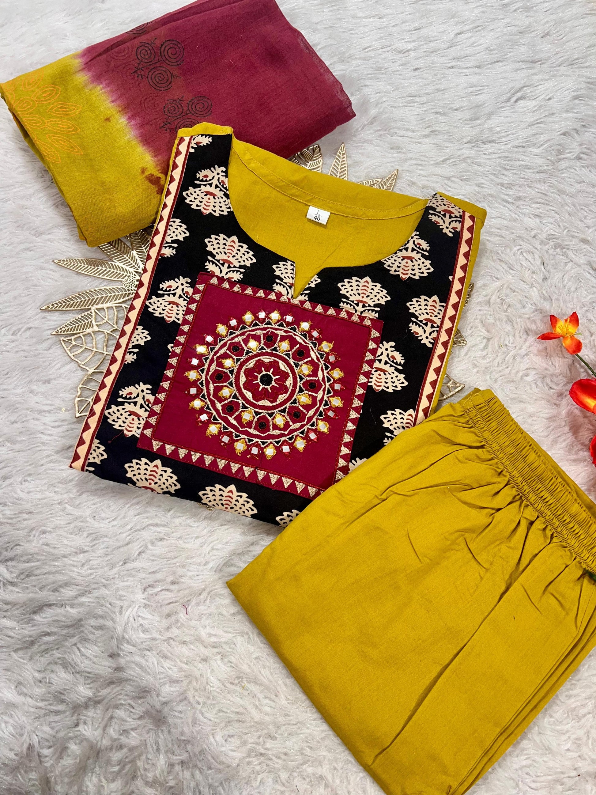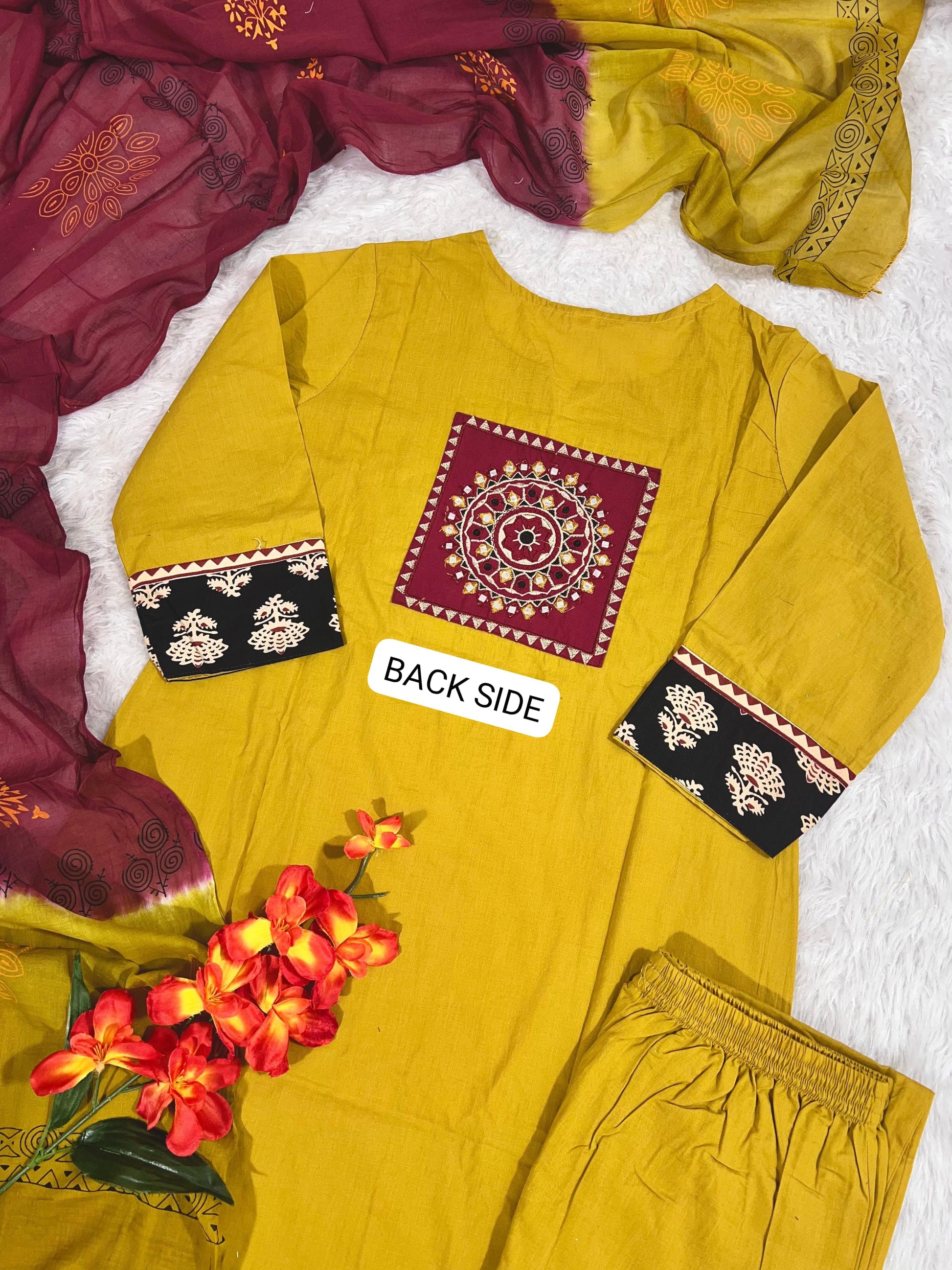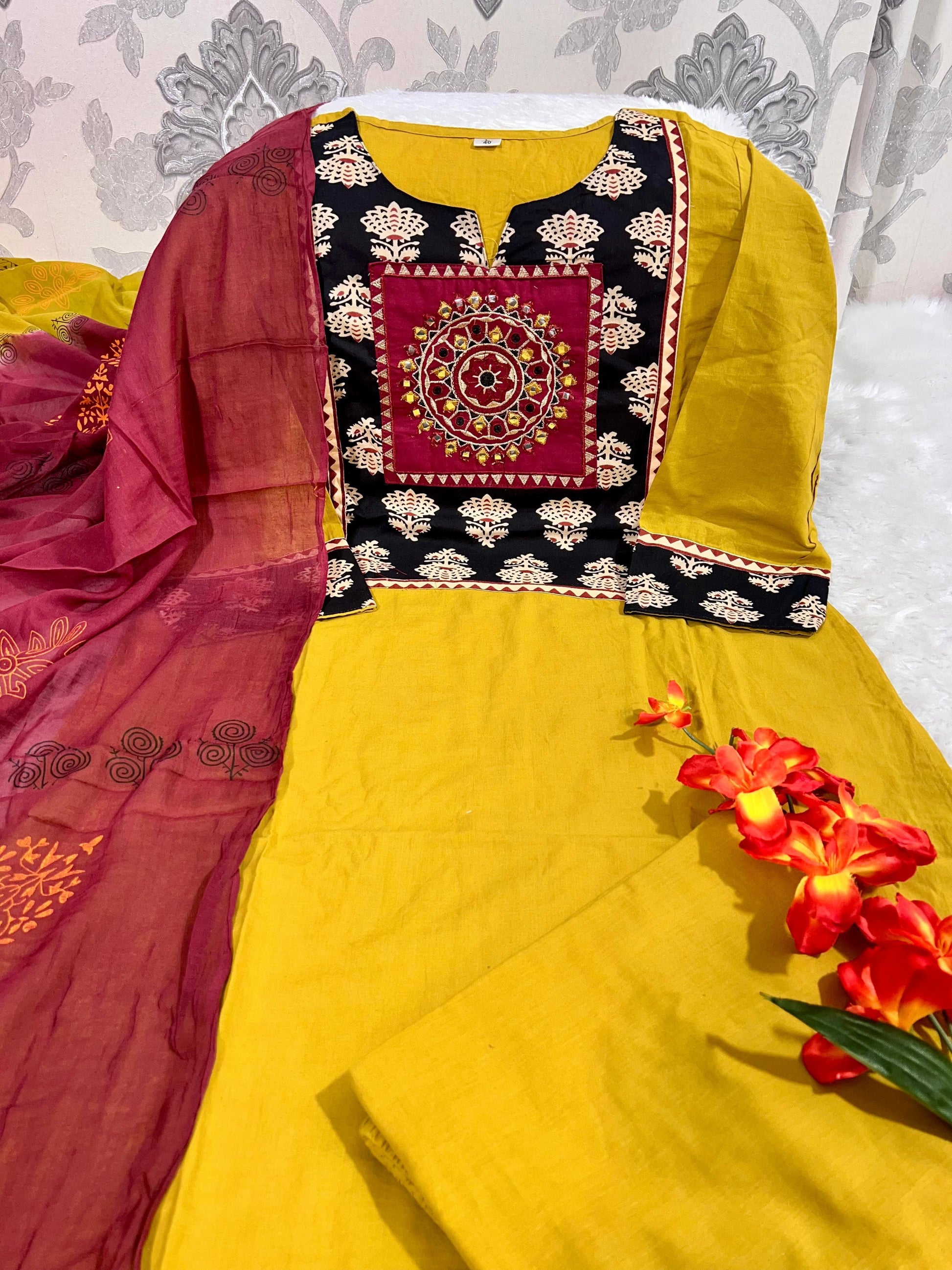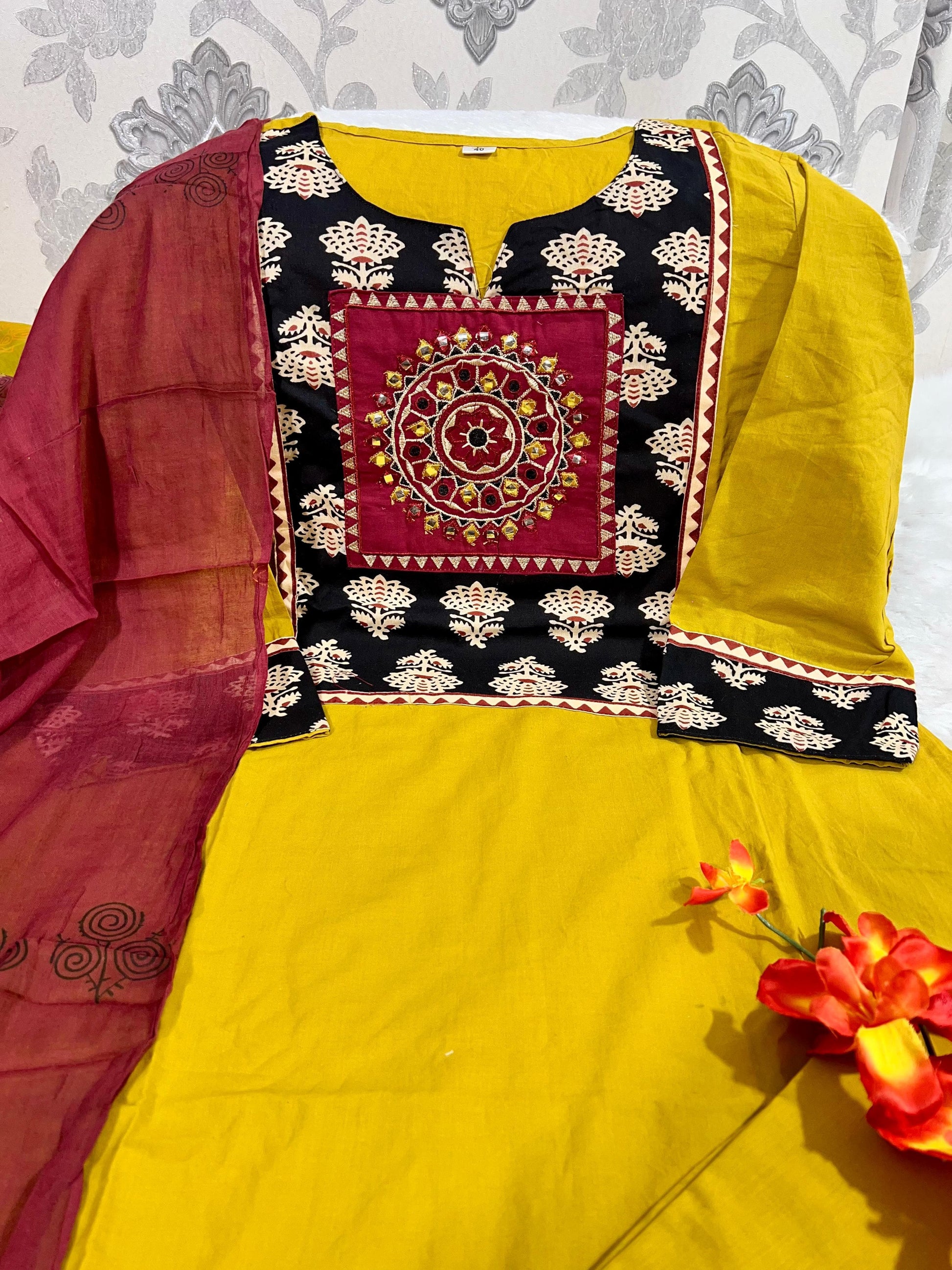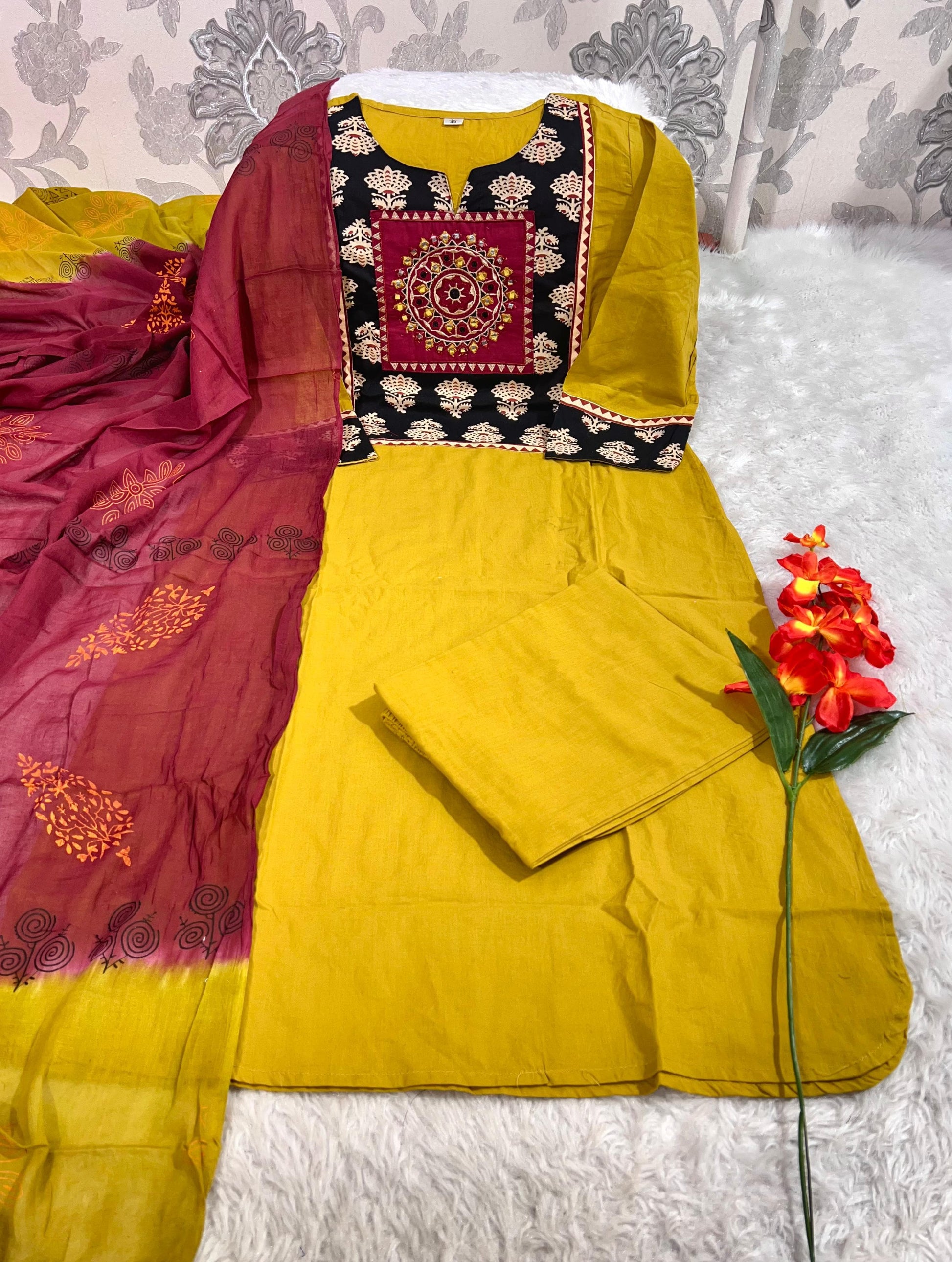 Mustard Yellow Cotton Kurti Set, featuring intricate embroidery on the yoke and contrast black printed detailing along the neckline and sleeves. Paired with straight mustard pants and a striking red dupatta adorned with traditional prints, this ensemble is perfect for festive gatherings, family functions, or ethnic celebrations.