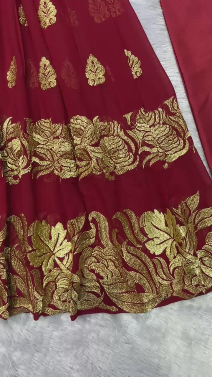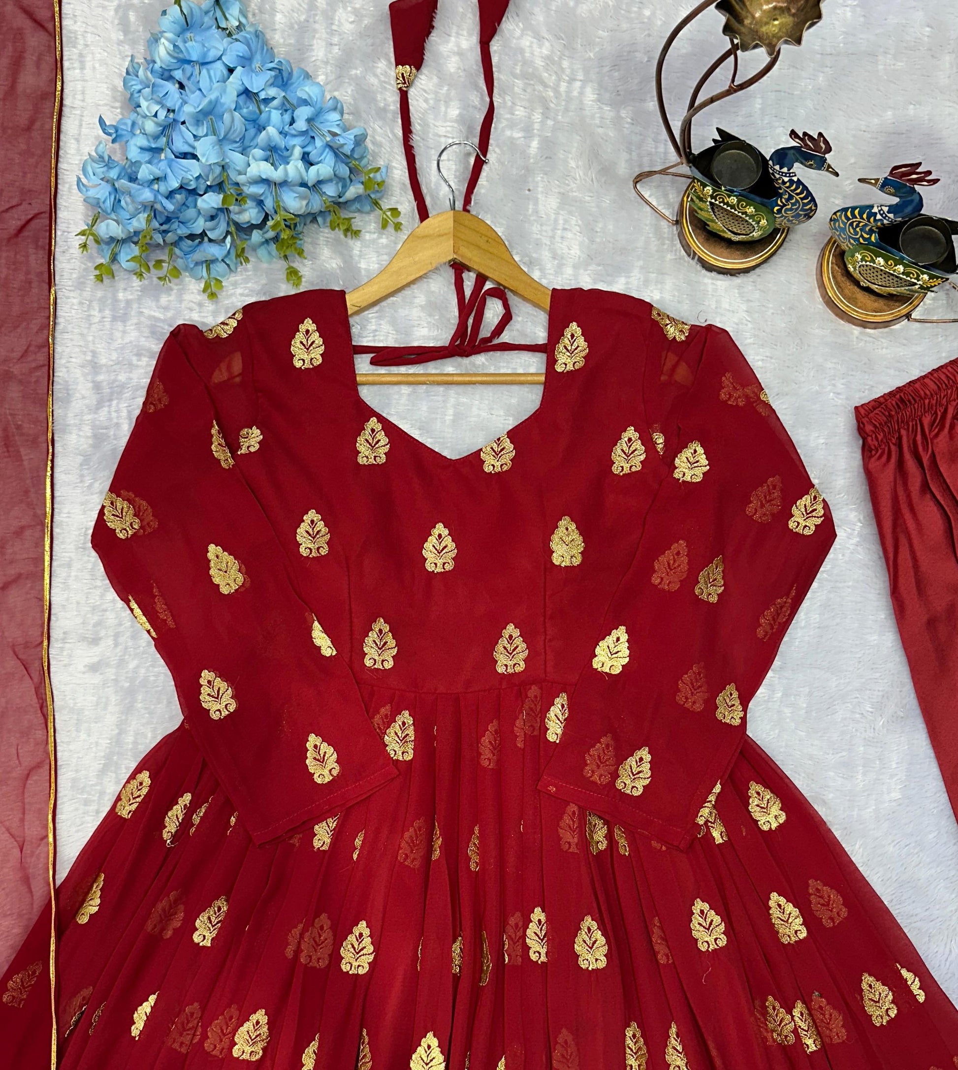 Make a grand entrance with this exquisite designer party wear gown set, crafted for those who love elegance with a festive flair. The gown features heavy embroidery on luxurious faux georgette, full sleeves, and a flowing 3-metre flair that creates a striking silhouette. A soft micro-cotton inner ensures comfort, while the fully stitched bottom with elastic waistband completes the ready-to-wear ensemble. The matching dupatta, adorned with a four-side lace border, adds a delicate, graceful finish — perfect for parties, weddings, and special celebrations.