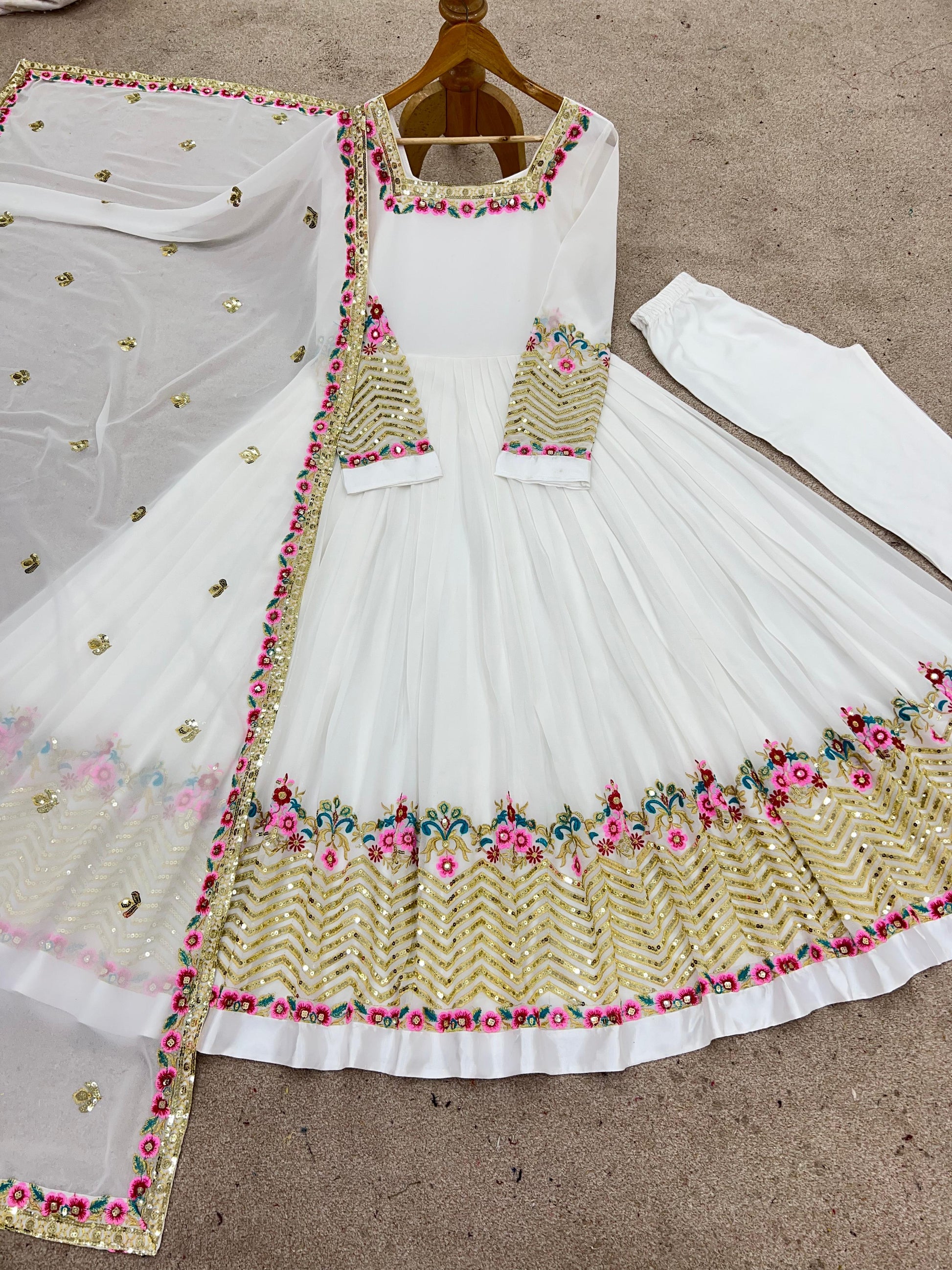Exquisite three-piece Anarkali set, designed to make a statement at weddings, celebrations, or special gatherings. The flowing gown, crafted in heavy georgette, features intricate multi-thread sequins embroidery and full sleeves, layered over a soft micro cotton inner for comfort. The matching bottom is tailored in heavy micro cotton for a perfect fit, while the coordinating dupatta, adorned with detailed sequins embroidery, completes the regal ensemble. Fully stitched and ready to wear, this set ensures sophistication and ease in every occasion.