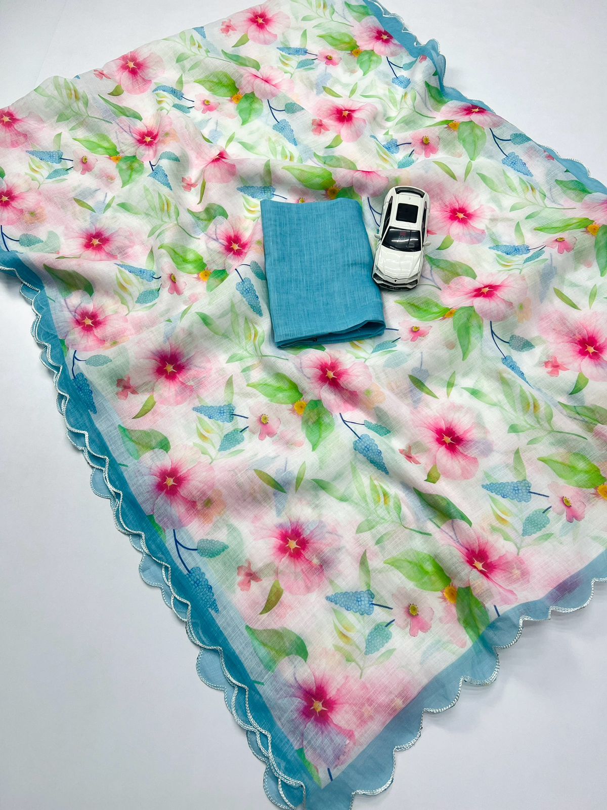 Off-White Linen Saree with Multicolour Floral Digital Print