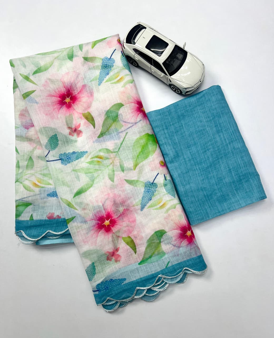 Comes with a matching pastel blue blouse piece in Bangloory satin (0.80 meter), complementing the digital floral prints and lending a refined, contemporary touch.