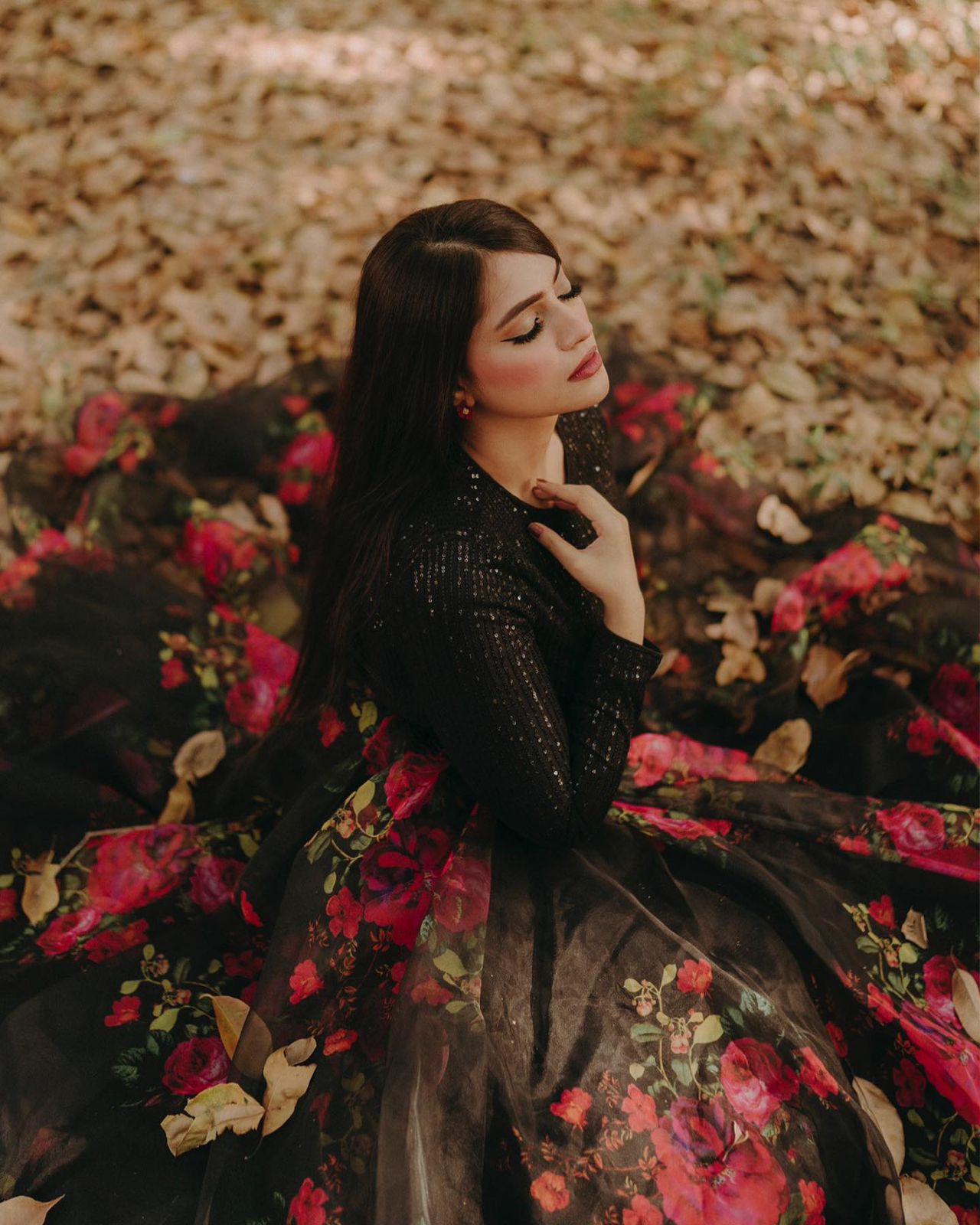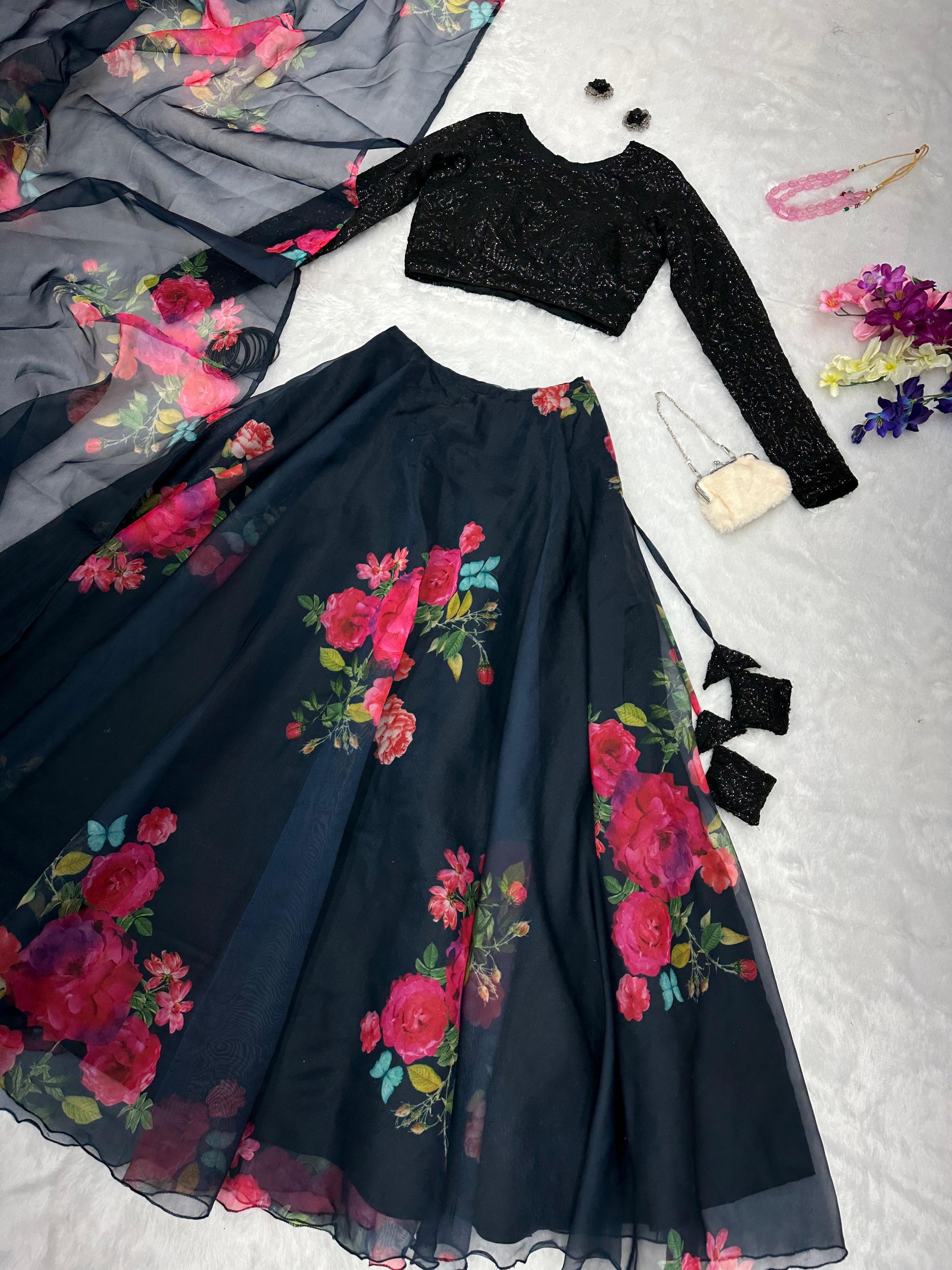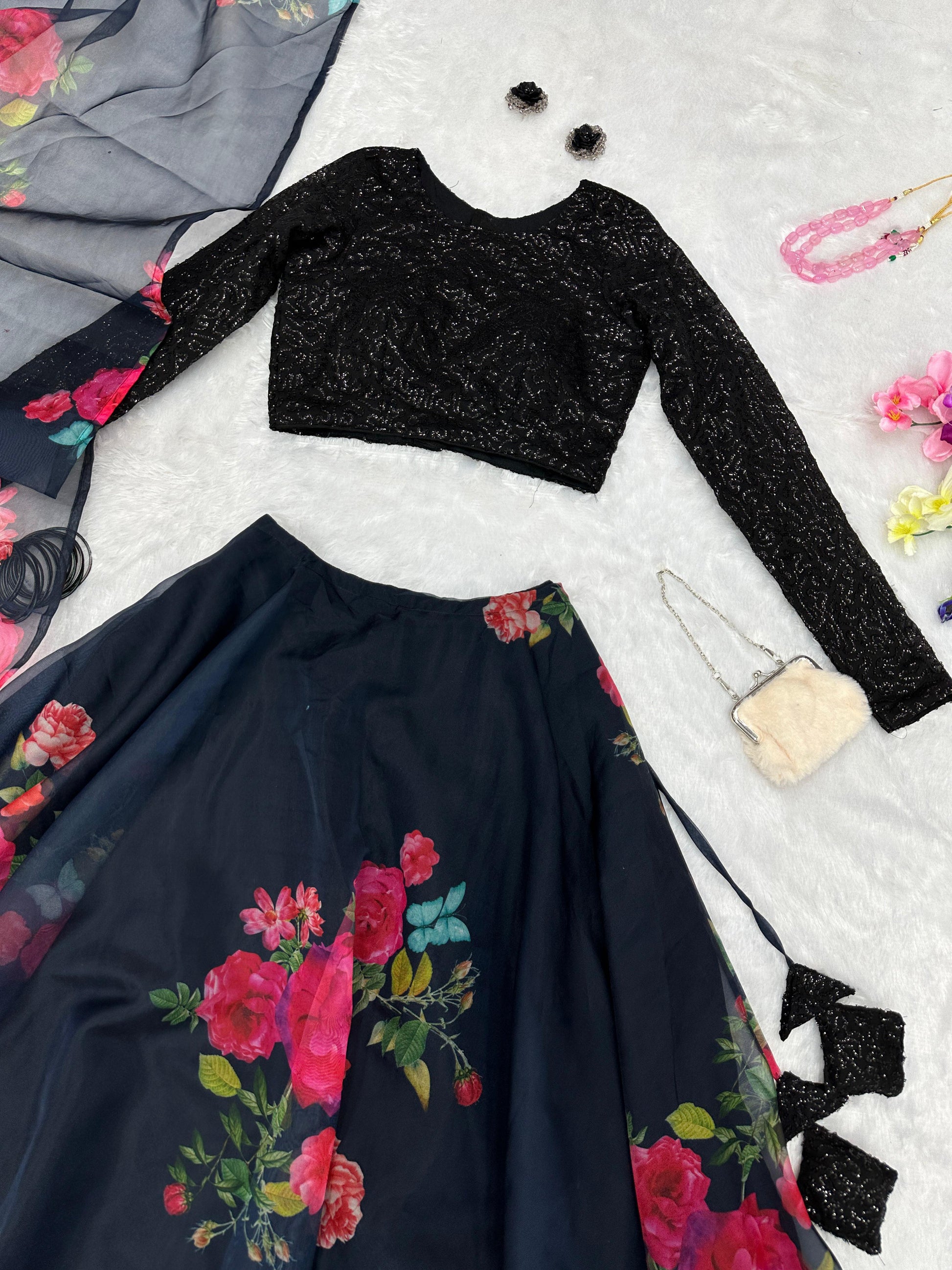 Exclusive Black Sequin Blouse with Organza Floral Lehenga Set.