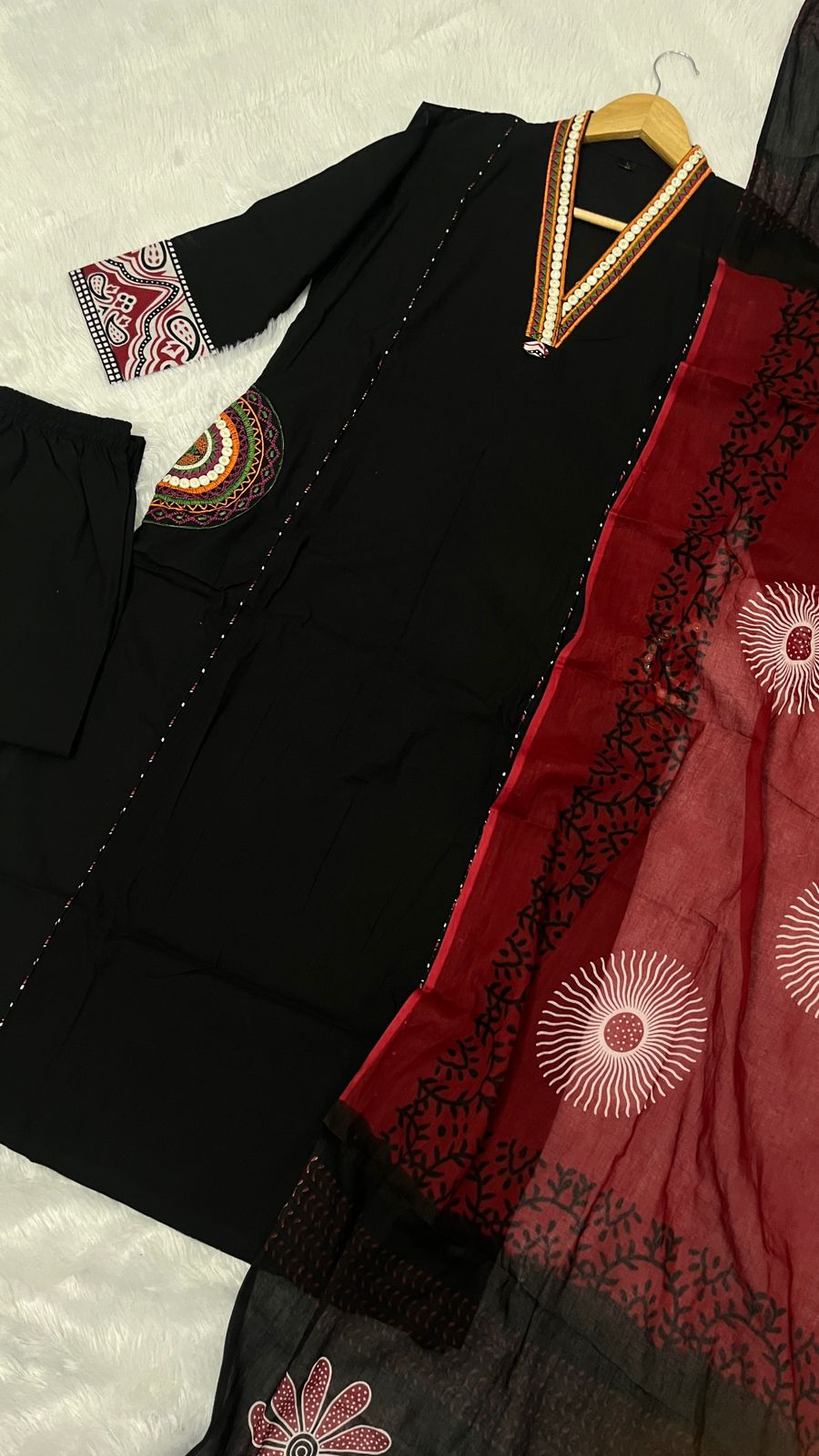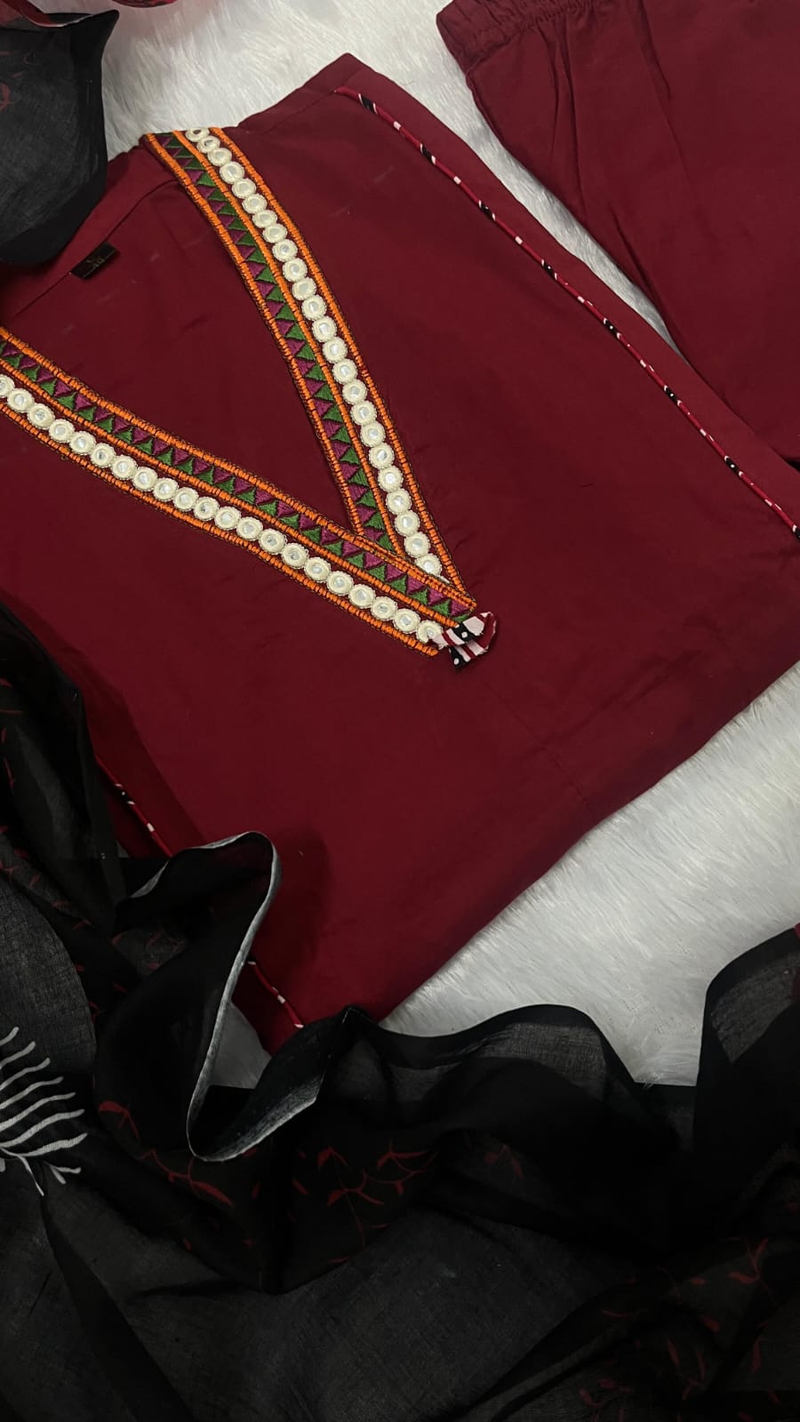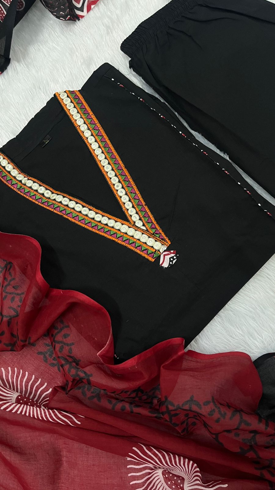 Beautifully crafted Kurti Set, designed to blend simplicity with grace. The straight-cut kurti features a keyhole neckline with delicate embroidery in earthy tones, along with embroidered sleeve cuffs and a unique side motif for a subtle ethnic touch. Paired with matching trousers and a contrasting black chiffon dupatta adorned with embroidered borders, this set offers a complete, polished look for casual outings, office wear, or festive gatherings.