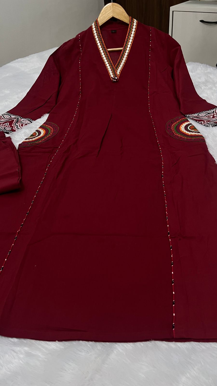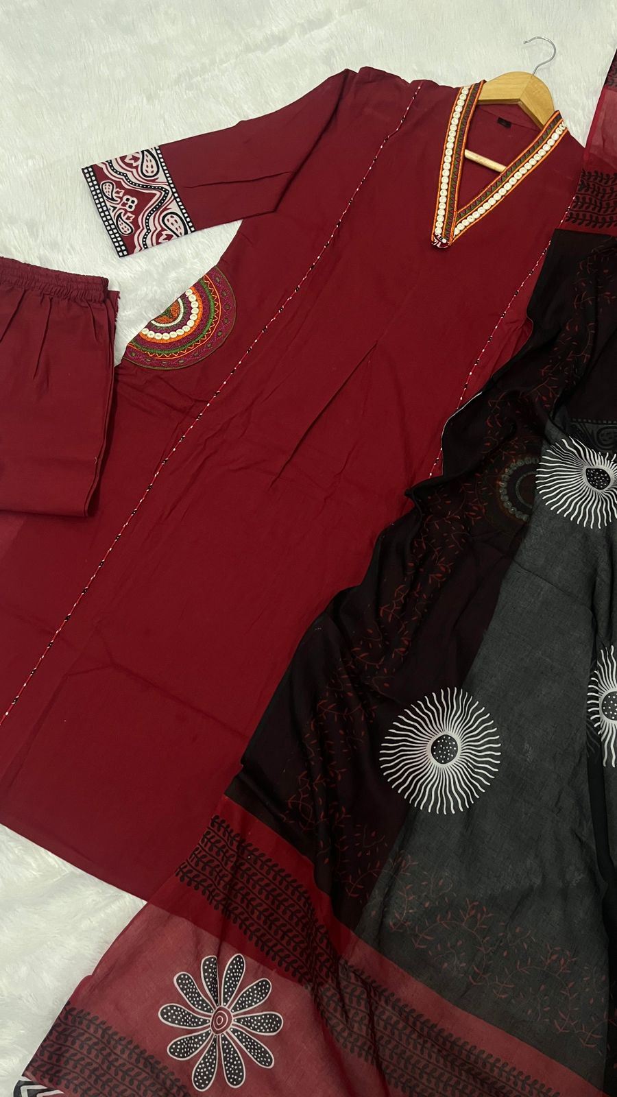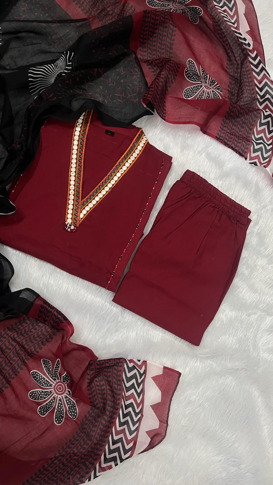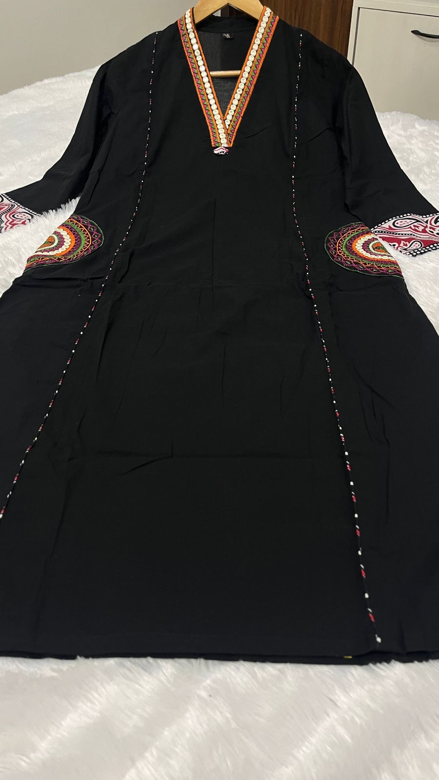 Beautifully crafted Kurti Set, designed to blend simplicity with grace. The straight-cut kurti features a keyhole neckline with delicate embroidery in earthy tones, along with embroidered sleeve cuffs and a unique side motif for a subtle ethnic touch. Paired with matching trousers and a contrasting black chiffon dupatta adorned with embroidered borders, this set offers a complete, polished look for casual outings, office wear, or festive gatherings.