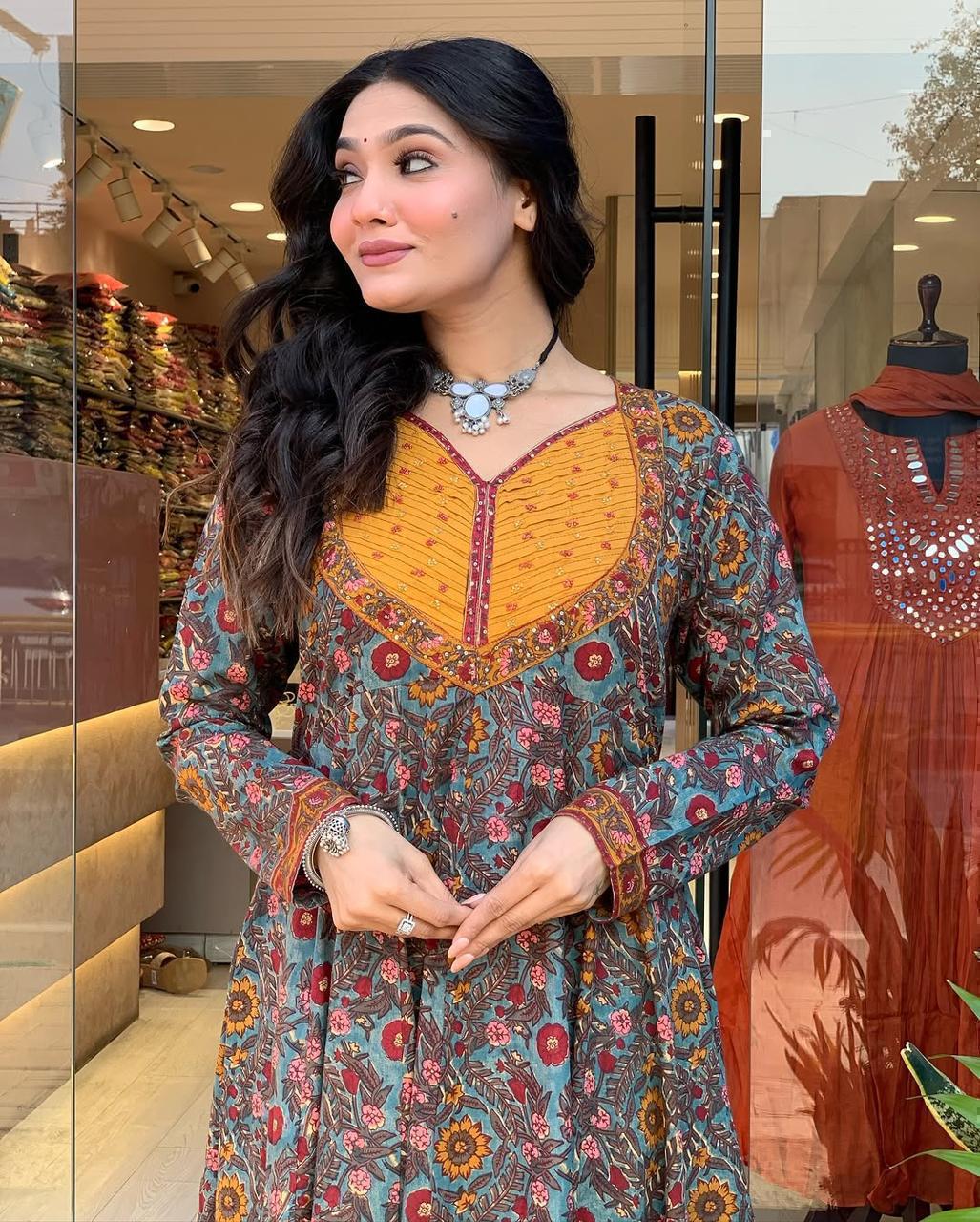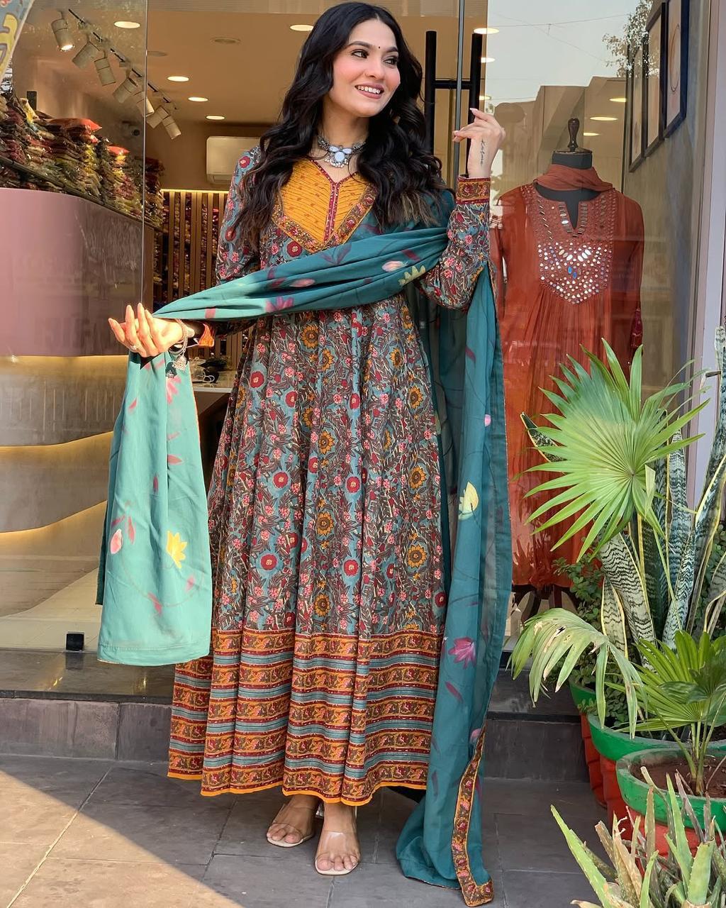 Step into effortless grace with this exquisitely designed Anarkali-style Kurti, adorned with intricate floral motifs and vibrant patterns. The rich hues blend harmoniously, giving you the perfect fusion of tradition and modern flair. The beautifully embroidered neckline adds a regal charm, while the flowy dupatta with delicate floral prints and a striking border completes the festive-ready look.