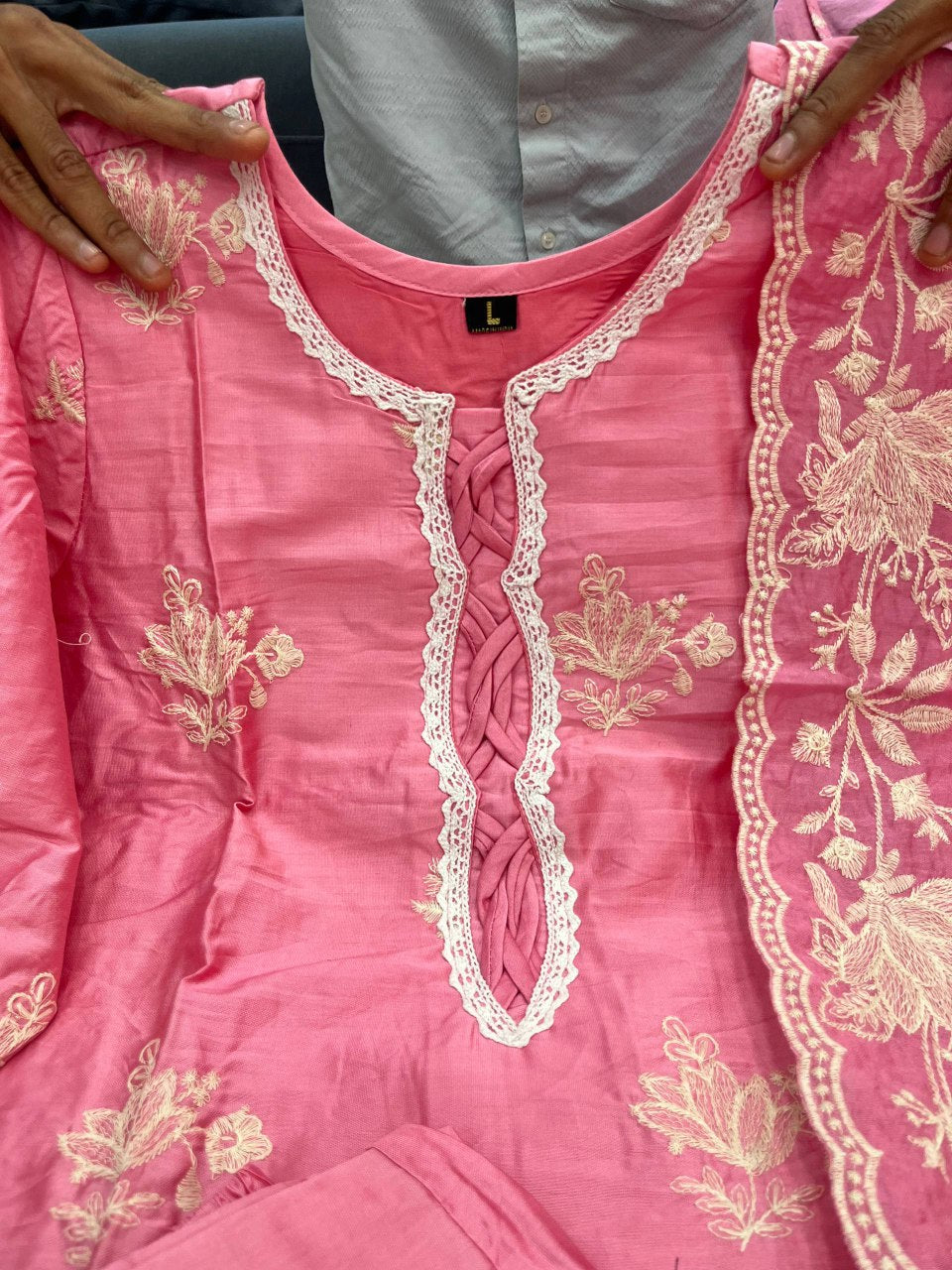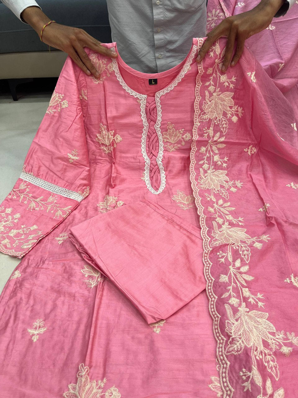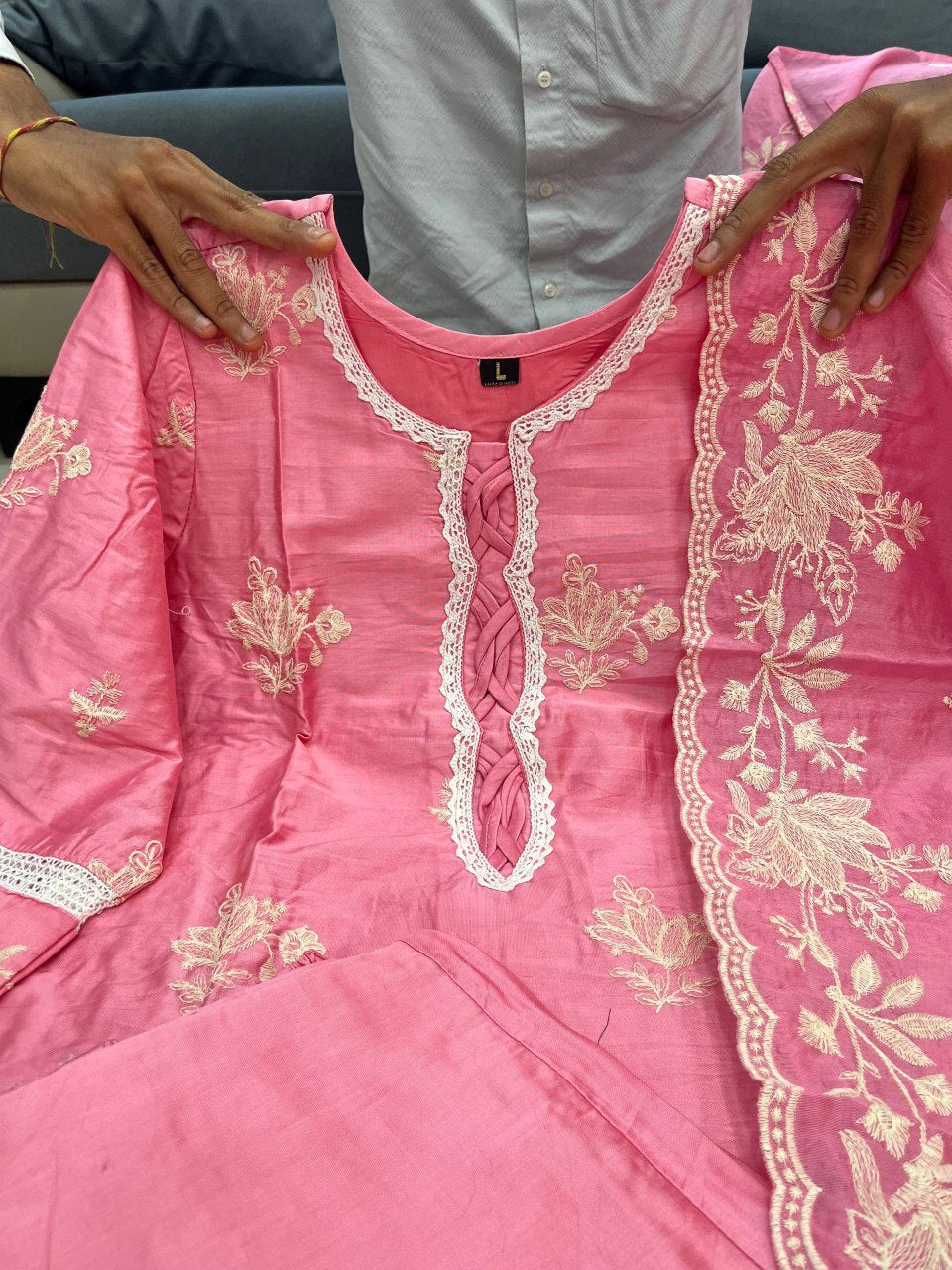 Pink Embroidered Mal Chanderi Kurti Set