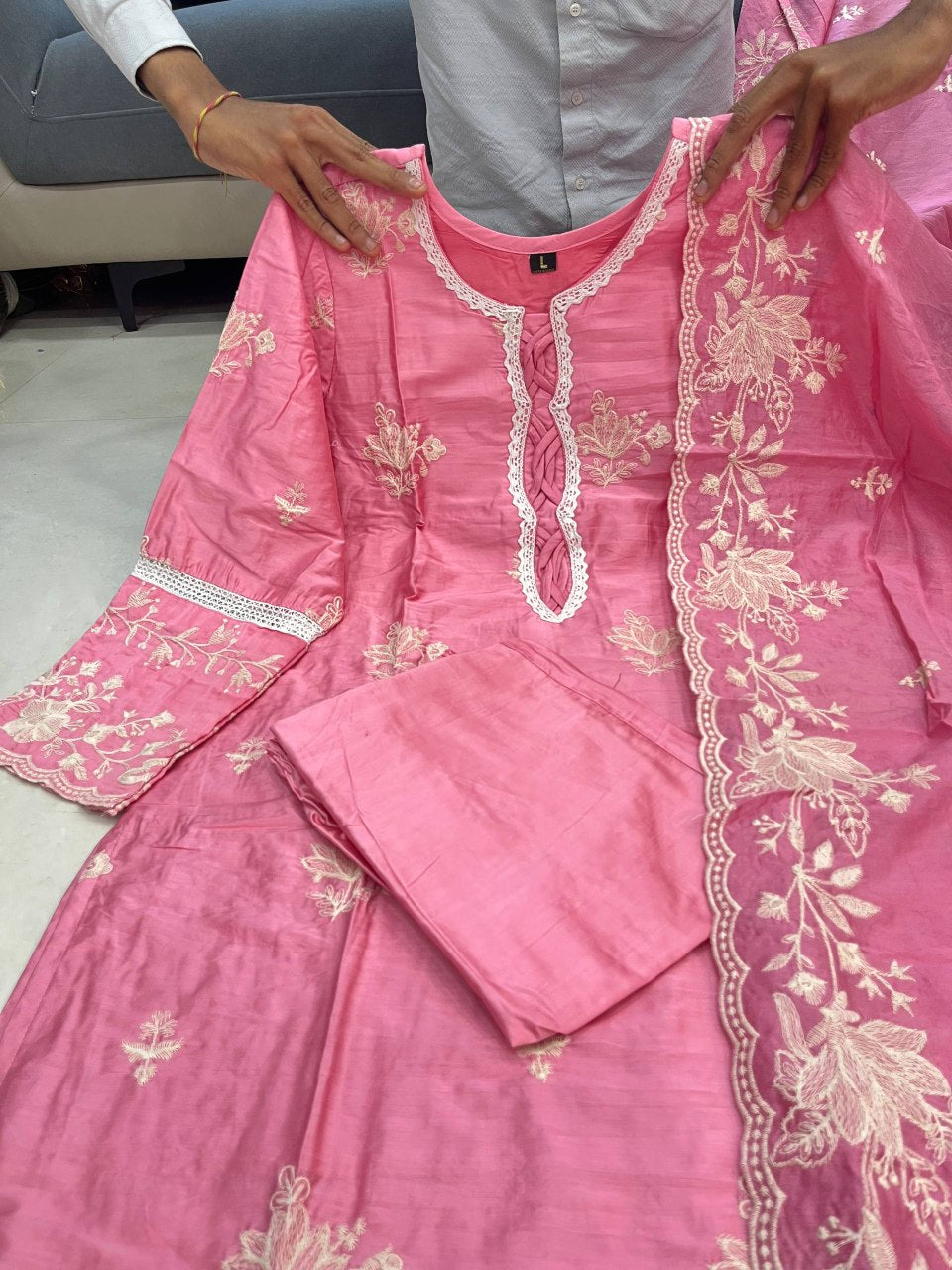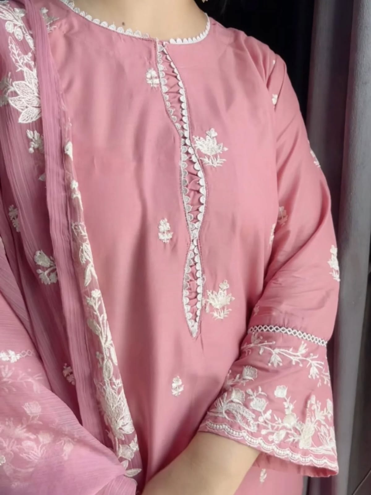 The front of the kurti features intricate cotton embroidery in traditional patterns, radiating elegance and festive charm. The back and sleeves are kept simple or lightly detailed, ensuring a balanced, graceful look. Completing the ensemble is a luxurious dupatta with detailed embroidery along both borders and a dyed cotton trouser for comfortable wear. Perfect for festive gatherings, family celebrations, or special occasions, this set blends tradition with contemporary elegance.