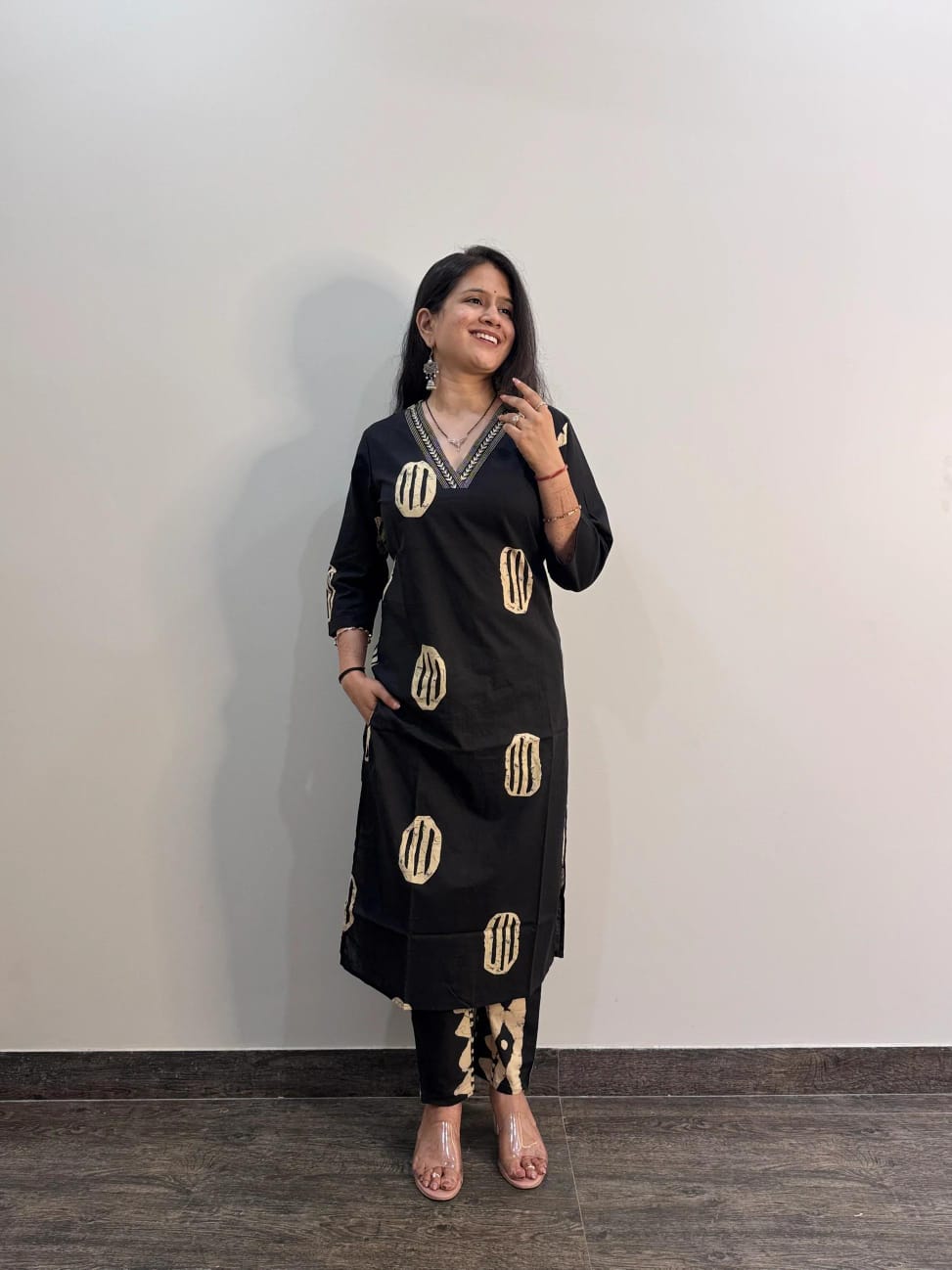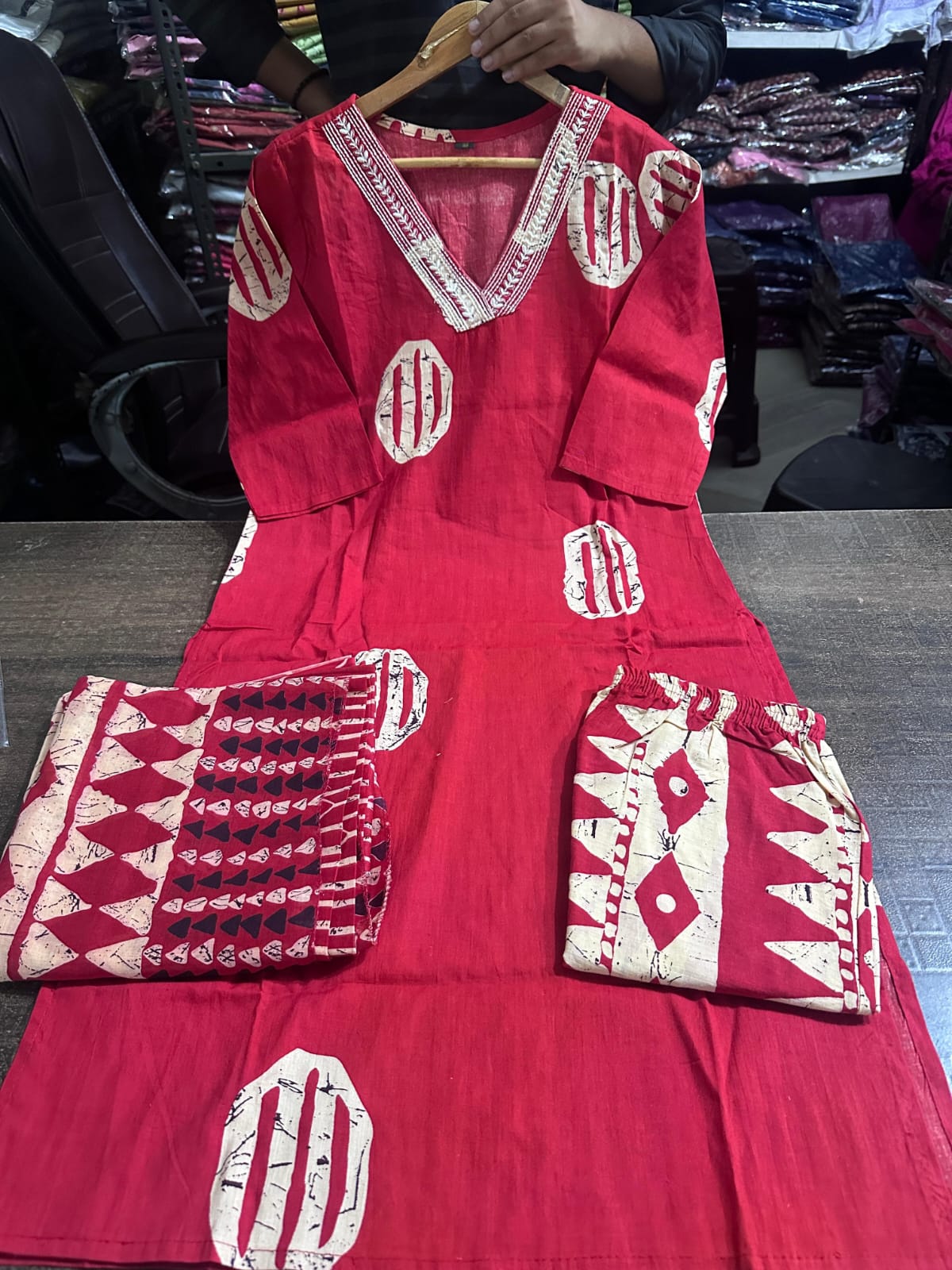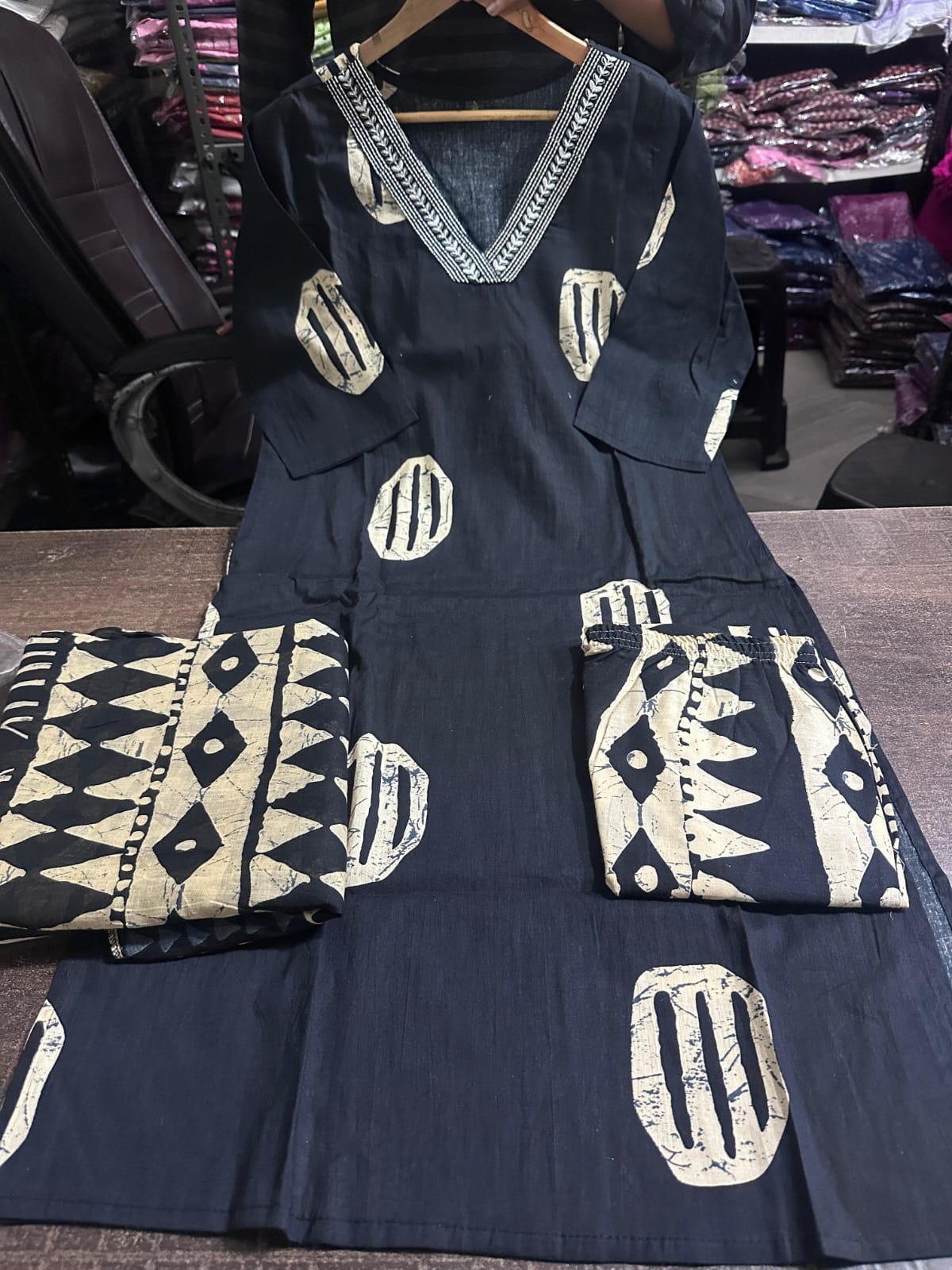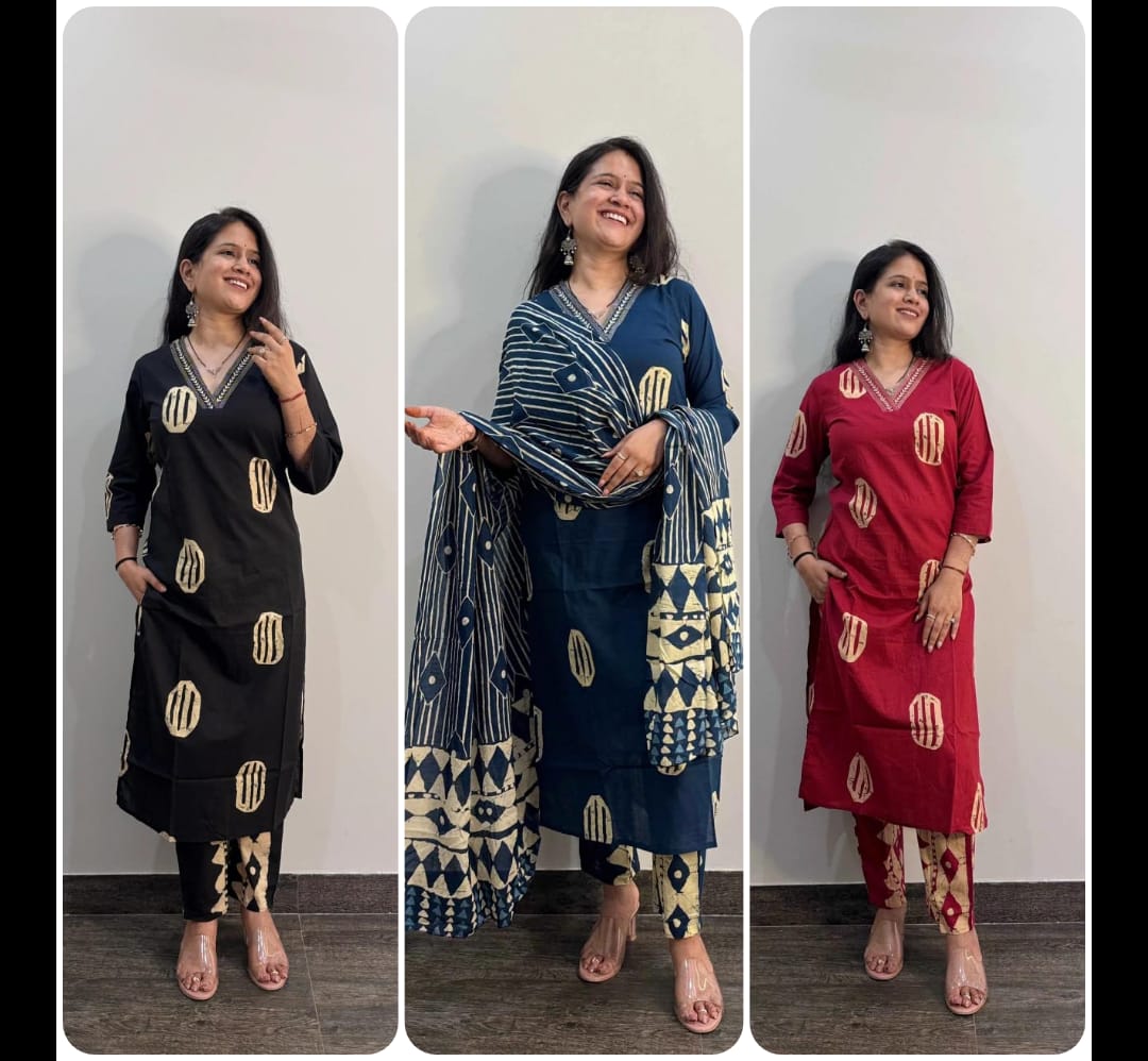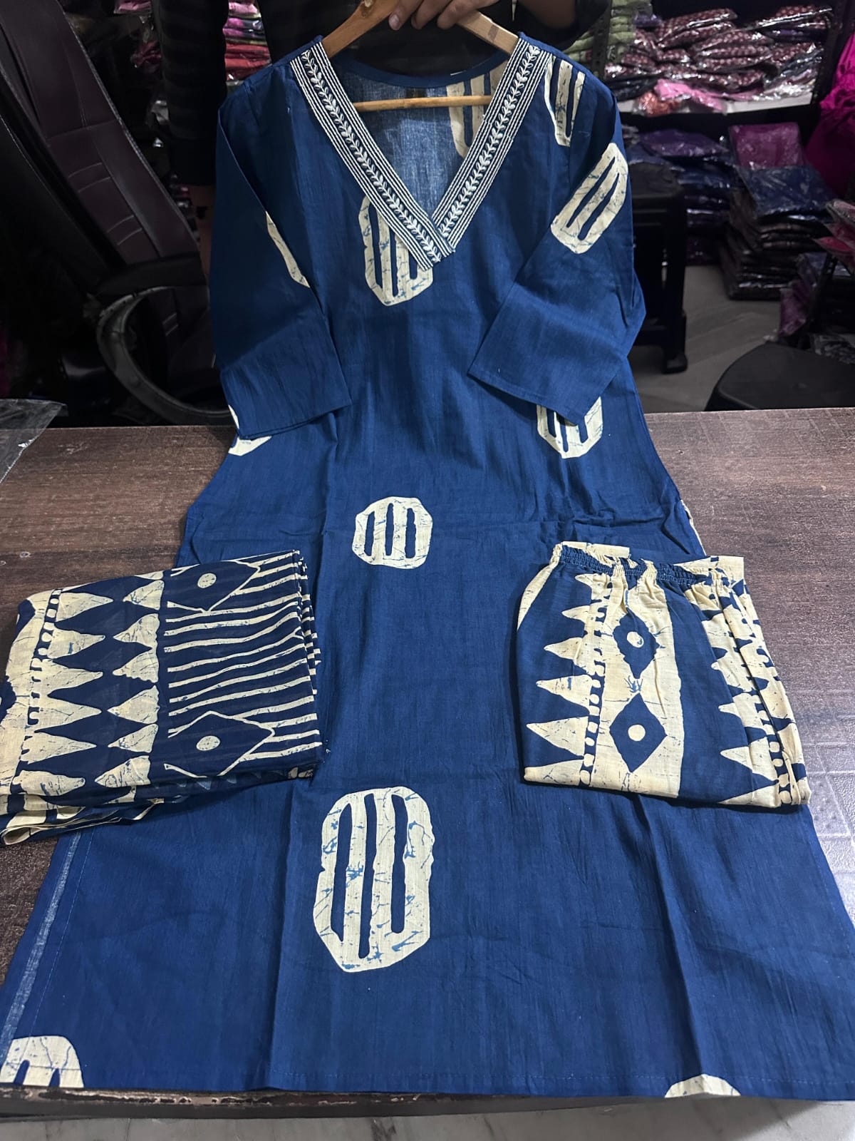 Hand-Block Printed Cotton Kurti Set with Embroidered Neckline & Coordinated Dupatta.