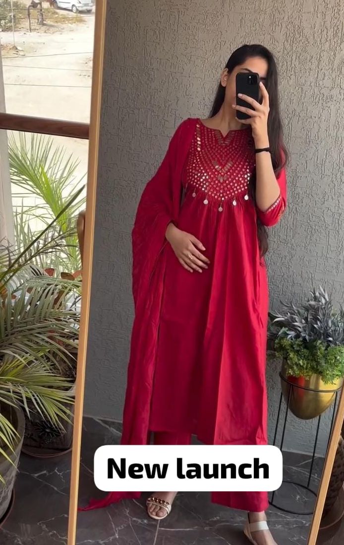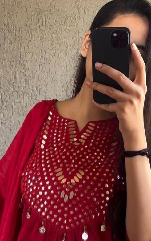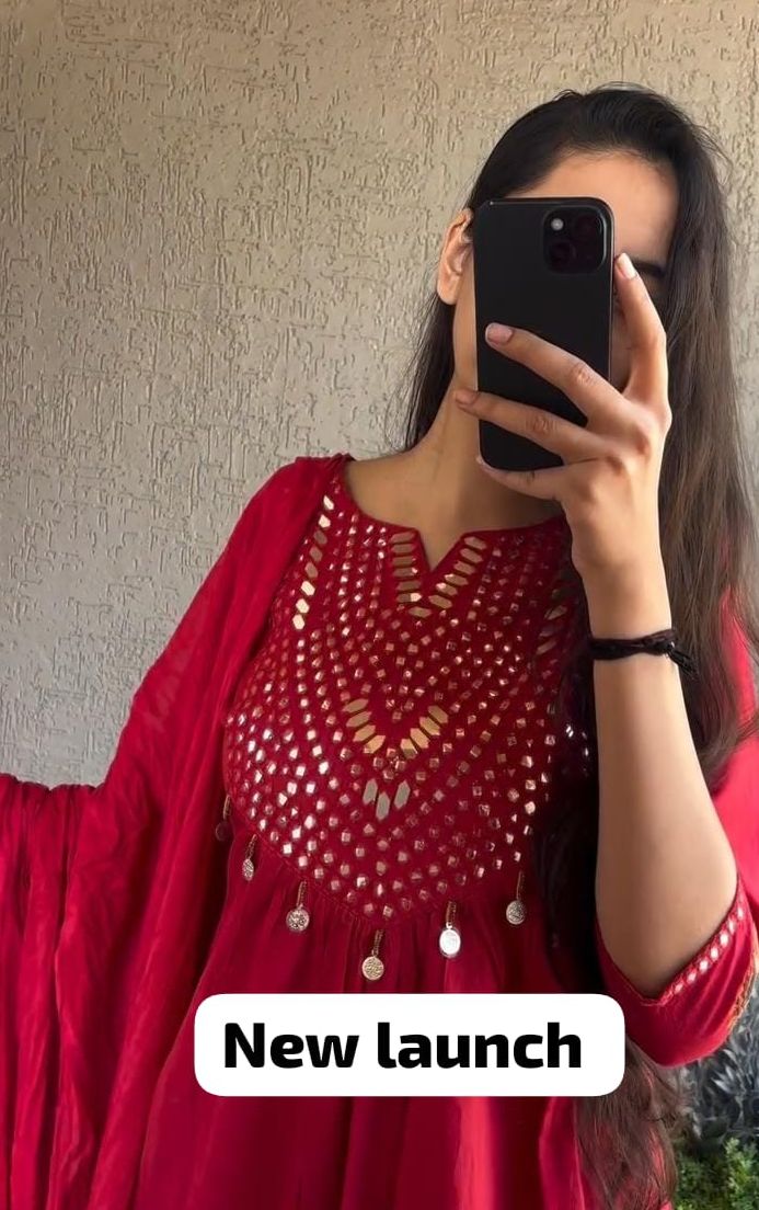 The highlight is the heavy mirror work and hand embroidery on the yoke, forming a striking geometric design that radiates traditional elegance. Subtle mirror accents on the sleeves and delicate coin details add to its festive appeal.
