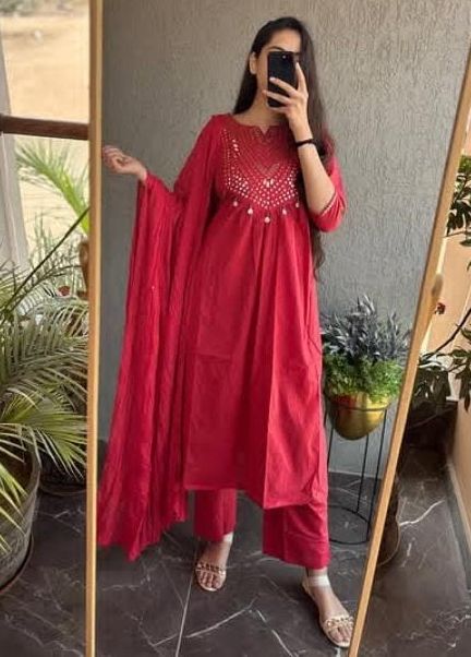 Step into festive charm with this pure cotton kurta set, paired with matching cotton pants and a dupatta.