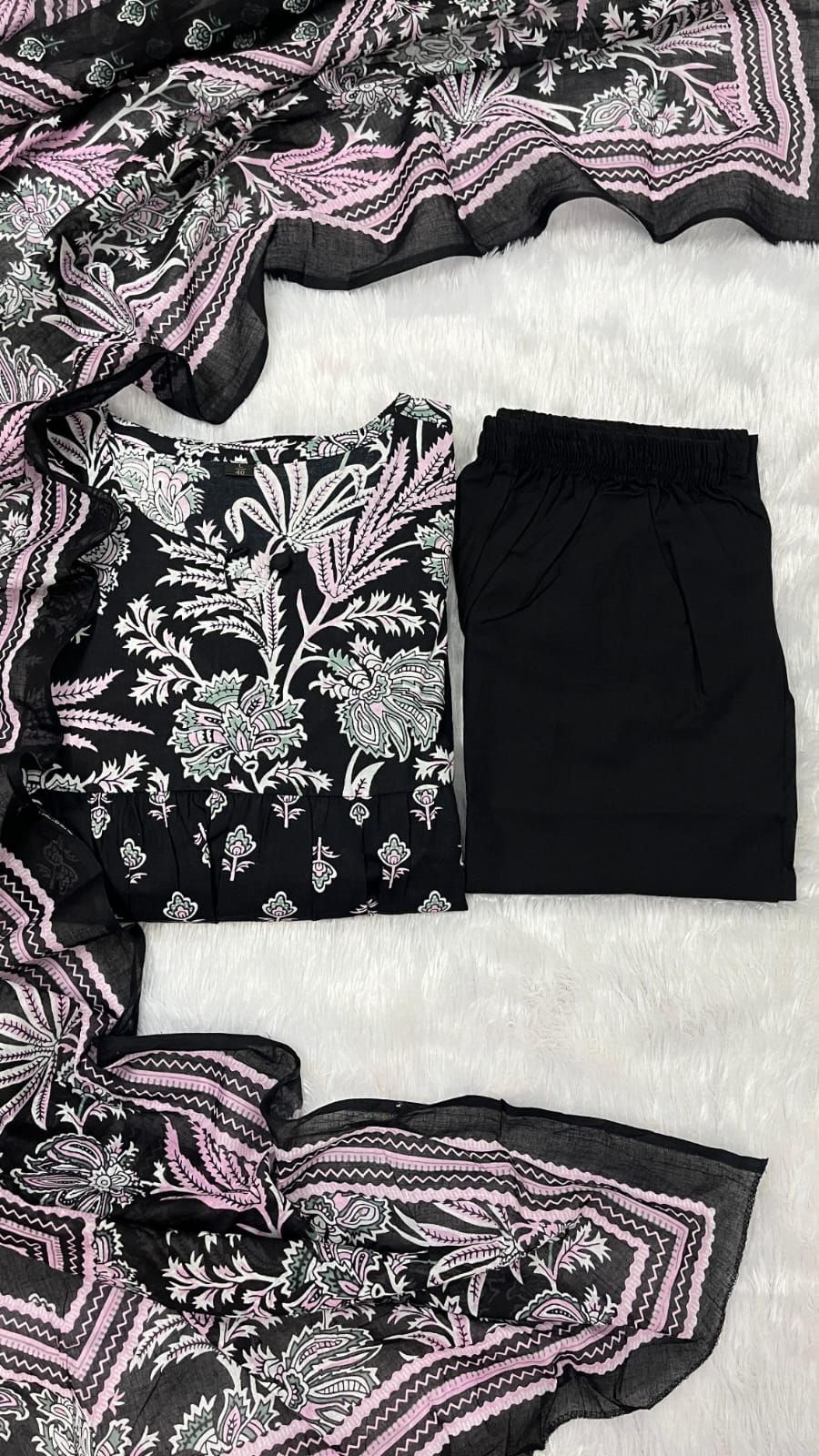women's cotton Anarkali kurta set. Designed with intricate floral prints and a graceful ghera silhouette, this outfit blends tradition with modern charm. The set includes a 48–50 inch kurta, 38 inch pant, and a matching dupatta, making it a complete ensemble for any occasion.