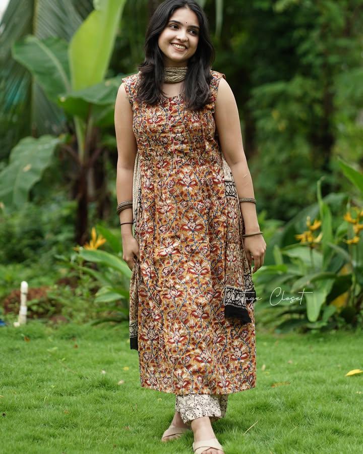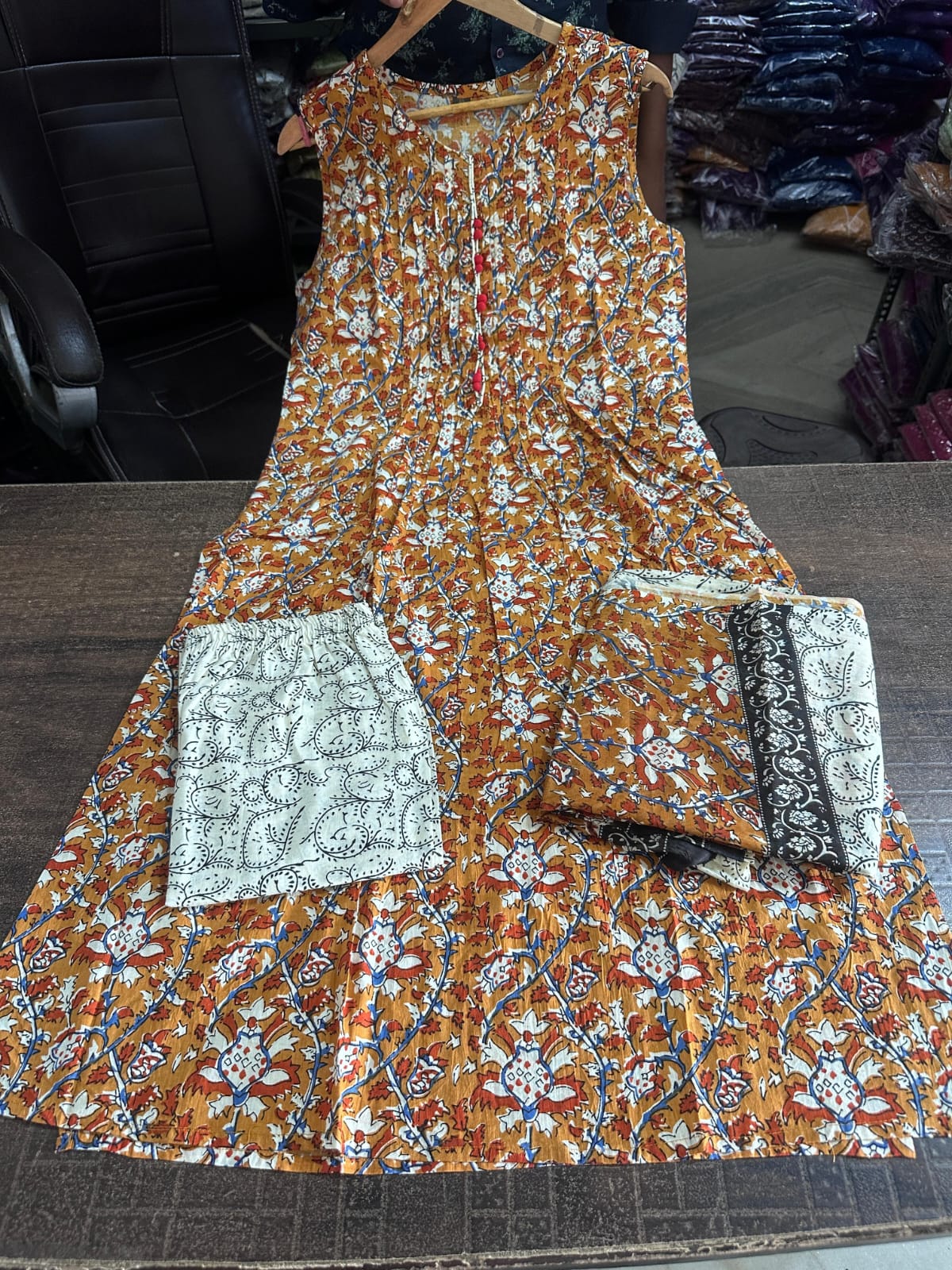 We bring you a touch of magic with this elegant ethnic set crafted in pure heavy cotton fabric. Designed with delicate handblock prints, this kurti with pant and cotton 100-100 dupatta brings comfort and charm in equal measure. The printed neck design adds detail, while the matching dupatta with bold black borders completes the ensemble with finesse.