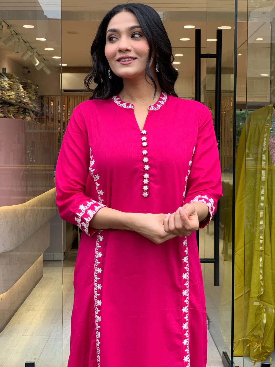 A vibrant fuchsia base infuses this Kurti with energy and charm—bold, eye-catching, and effortlessly elegant.
