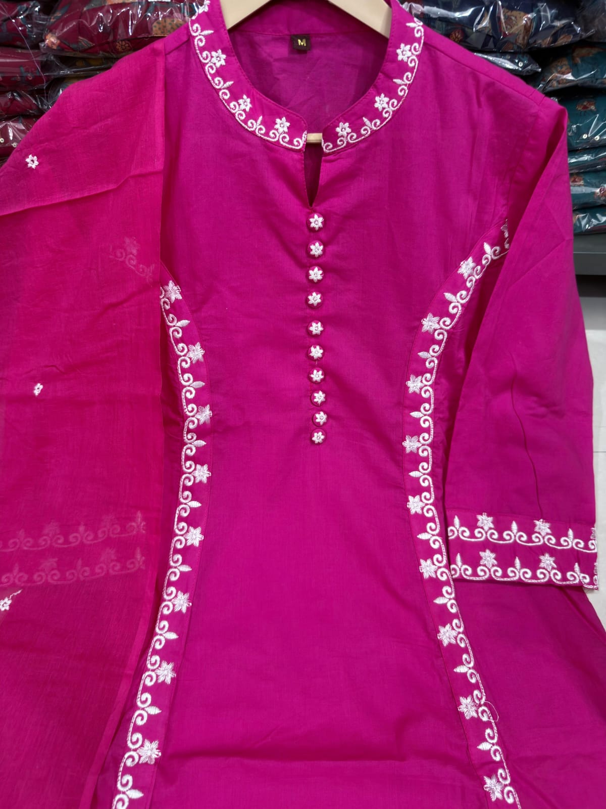 Fuchsia Cotton Kurti Set with Delicate Embroidery.