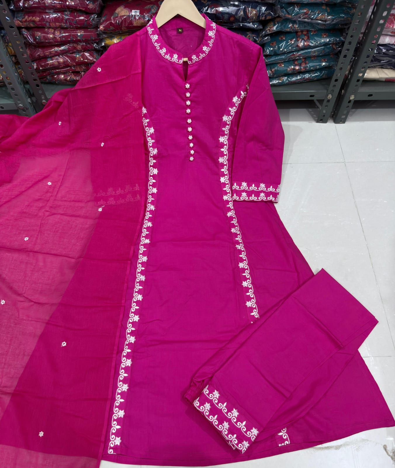 | Embroidery | Thread work on neckline, placket, sleeves; floral motifs on dupatta |