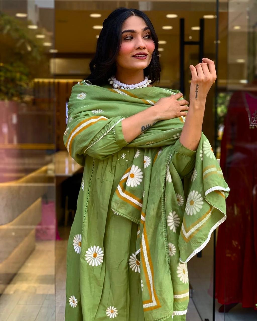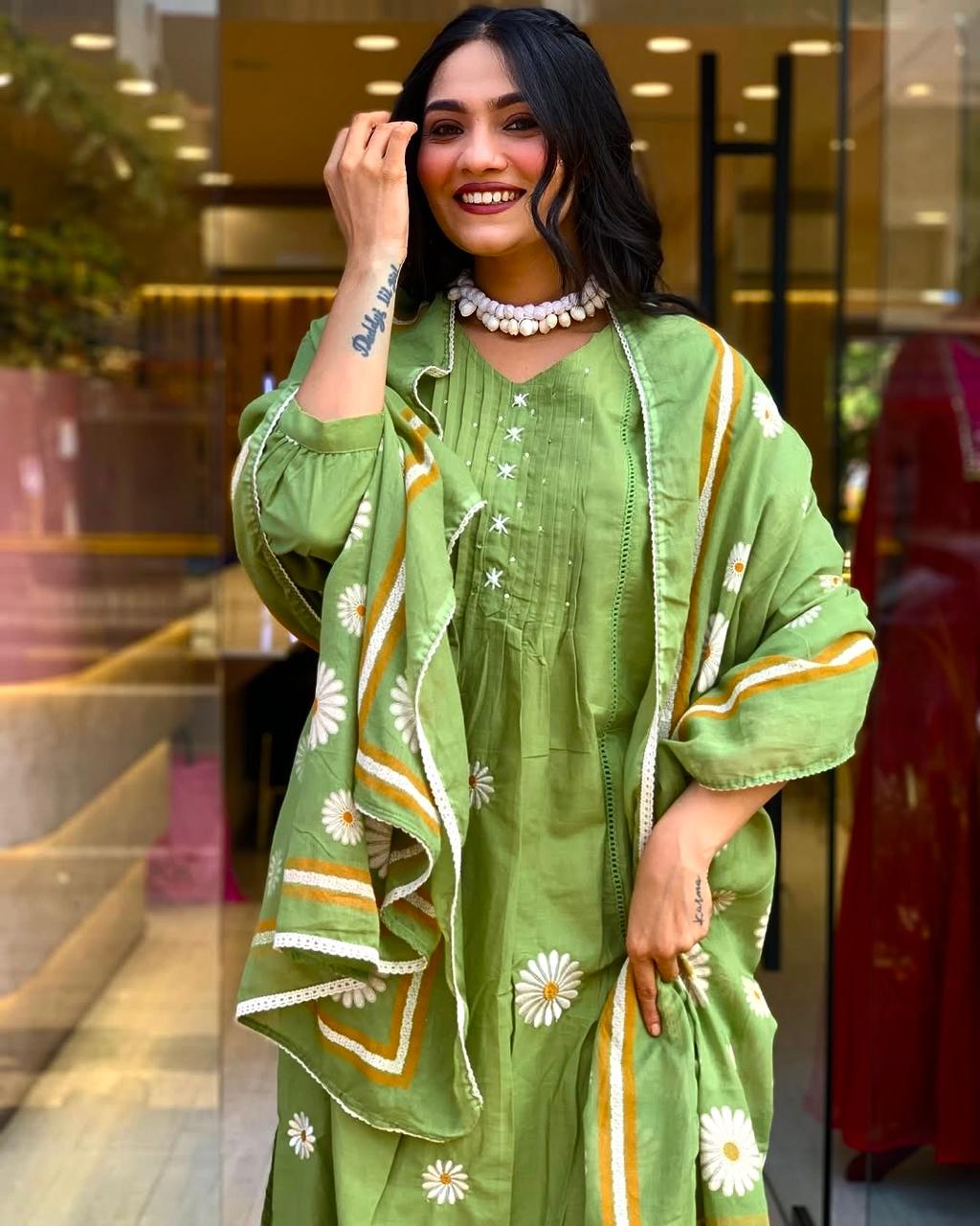 Paired with a matching dupatta bordered in yellow and white accents, the look is both refreshing and radiant. White cotton palazzo pants with lace embroidery at the hem complete the set, balancing charm and comfort with artistic flair.