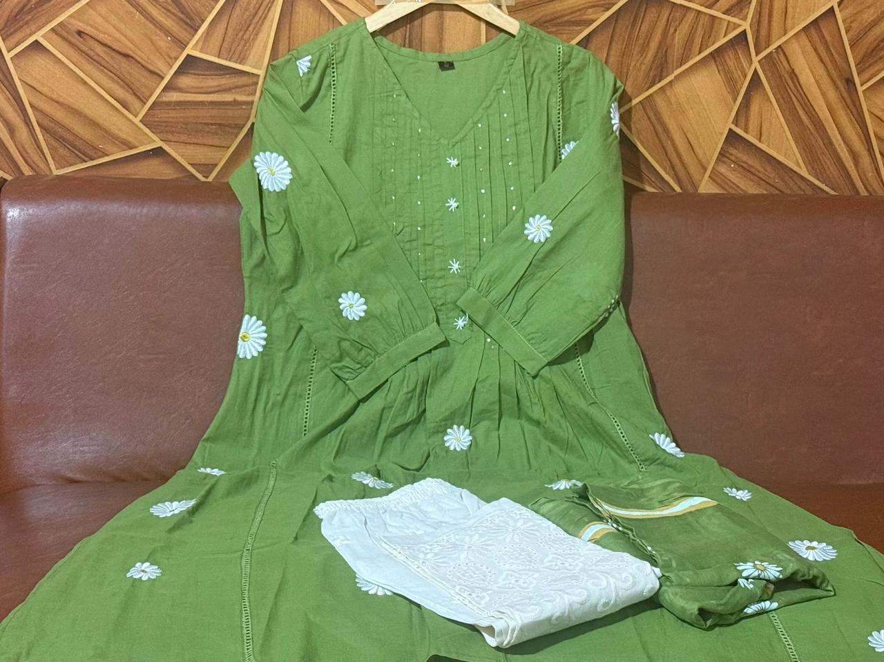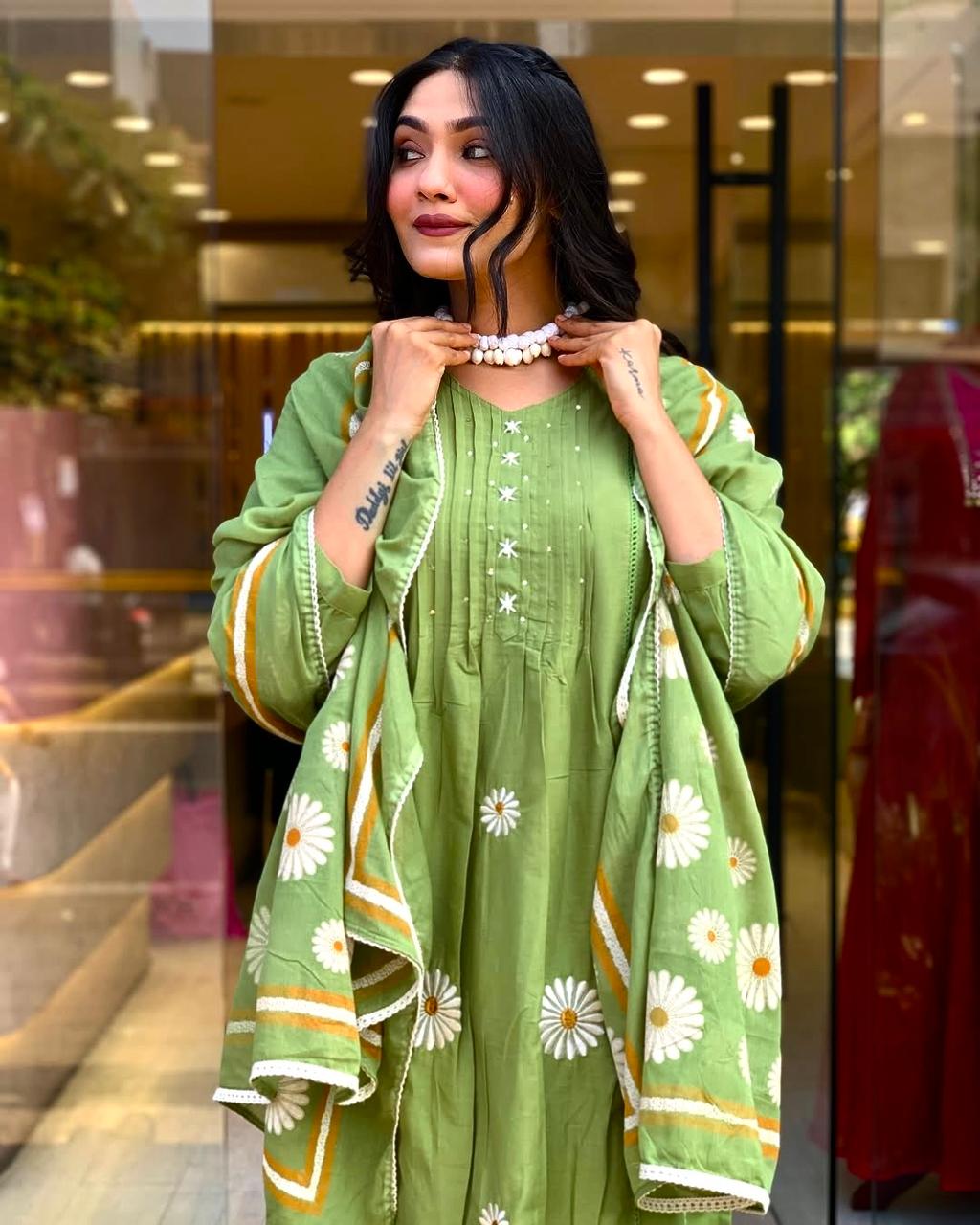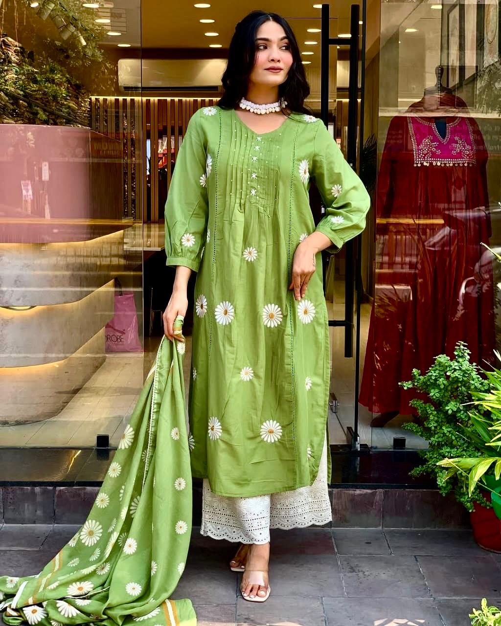 Where timeless tradition meets floral freshness, This Pastel Green Kurti Set is adorned with delicate white daisy floral prints, radiating vibrance and grace. Thoughtful pin tuck detailing along the front enhances the kurti’s refined silhouette, adding a touch of understated sophistication.