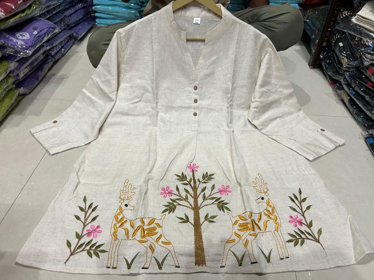The hemline features exquisite thread embroidery showcasing deer motifs, floral vines, and delicate artistry in mustard, green, and pink, adding a touch of nature-inspired charm.