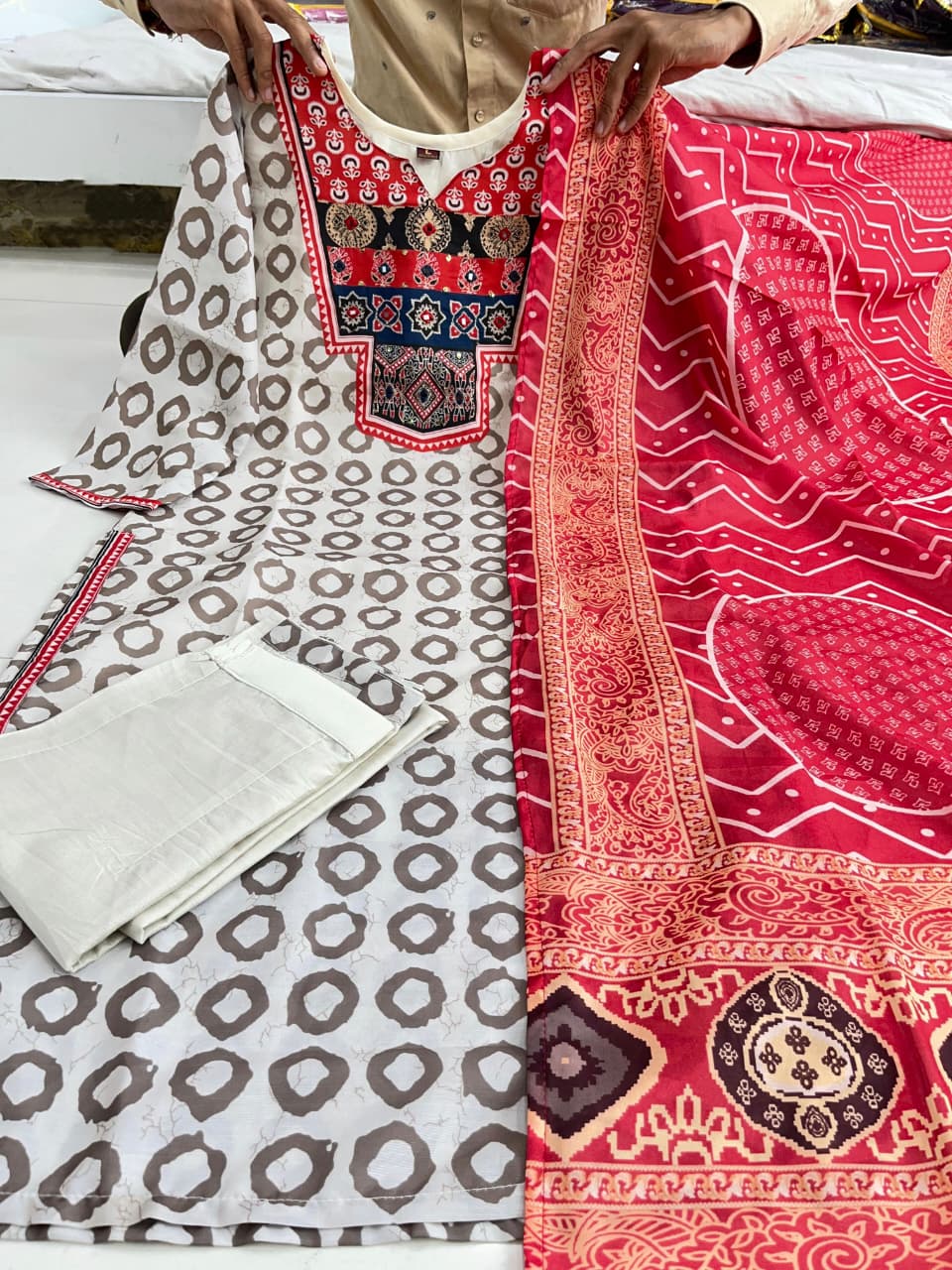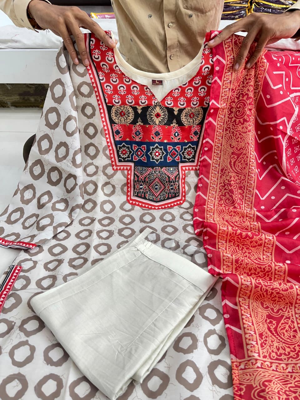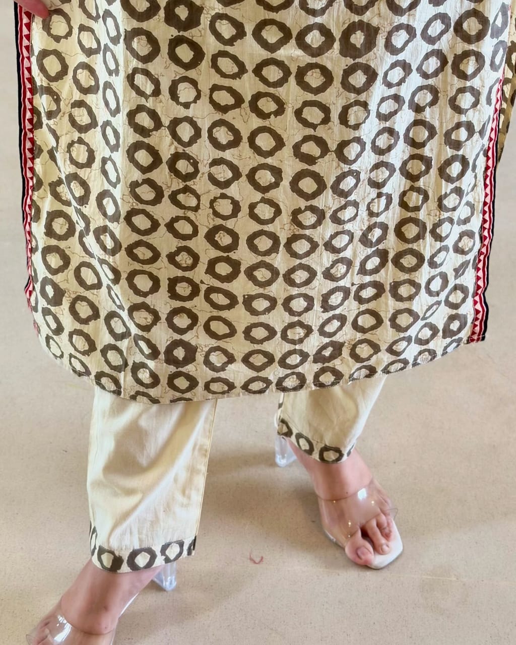 Embrace elegance with this cream-beige cotton kurti set, detailed with grey circular motifs and a straight-cut design. The embroidered red yoke with mirror work and geometric patterns adds a regal touch, while the cream pants and contrasting red block-printed dupatta complete the look. Perfect for festive gatherings, casual outings, or family occasions.