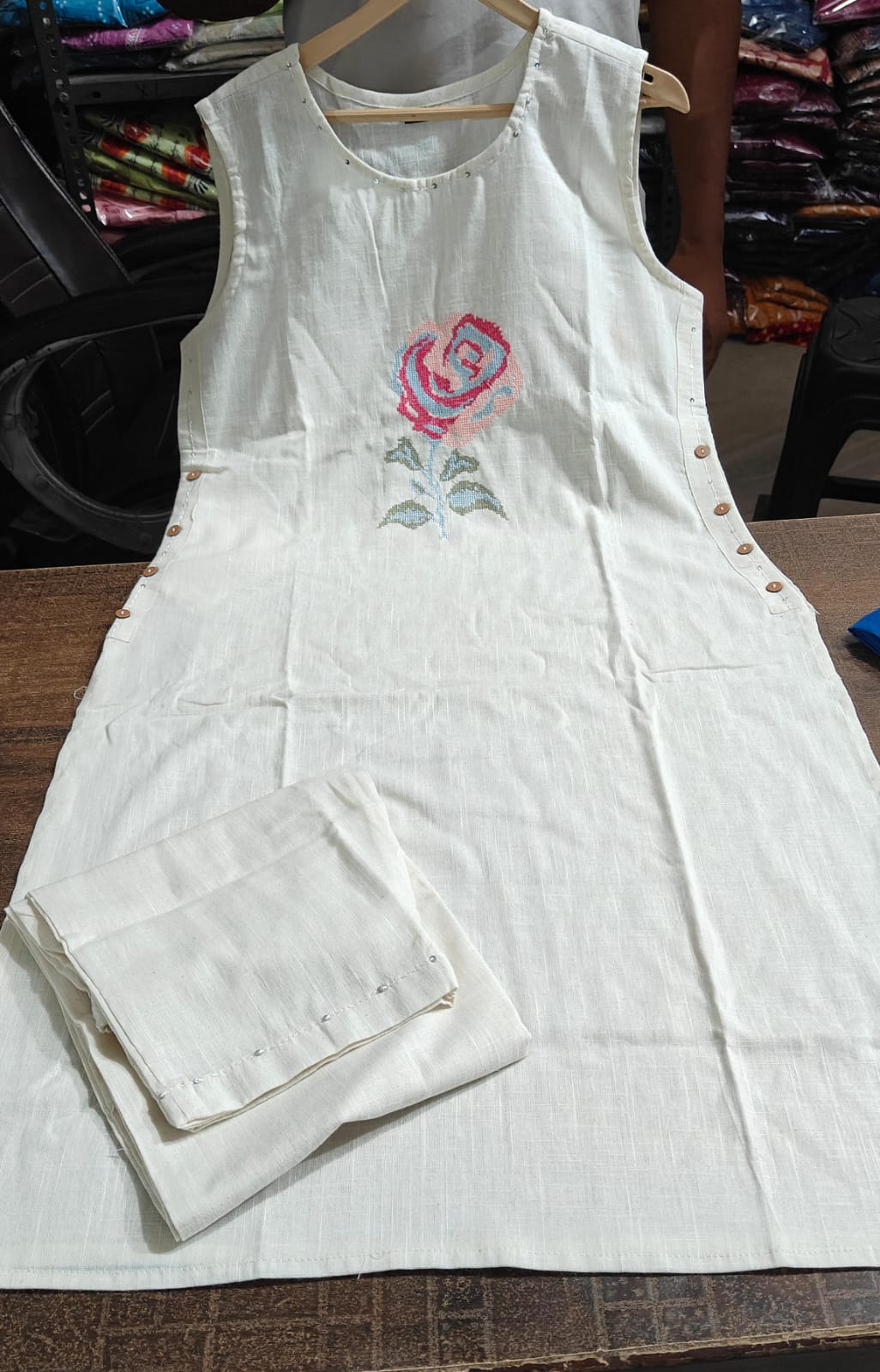 | Colour & Details | Soft off-white base with hand-embroidered floral motif and side button detailing |