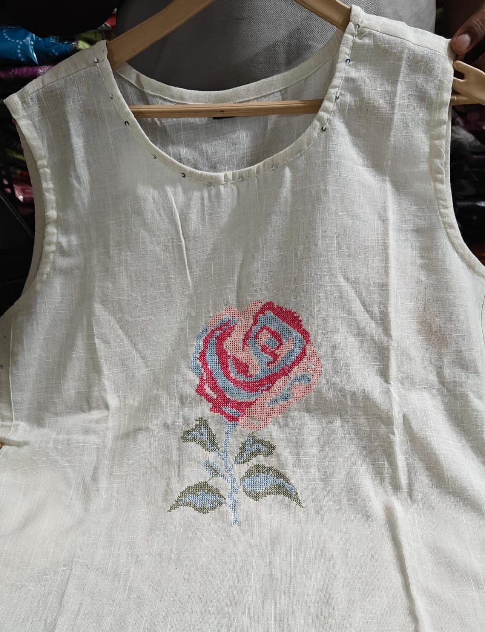 Off-White Sleeveless Cotton Kurti Set with Hand-Embroidered Floral Motif.