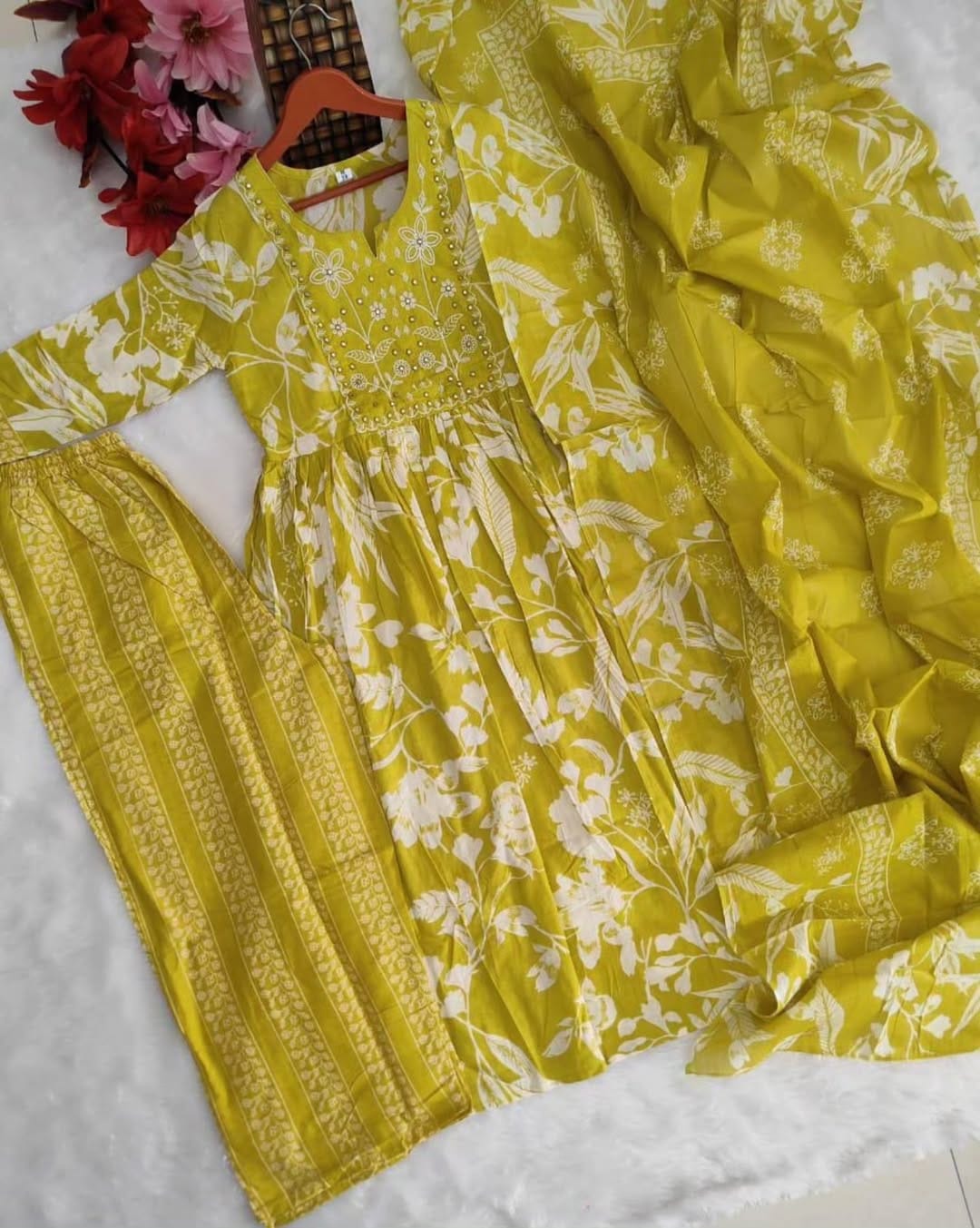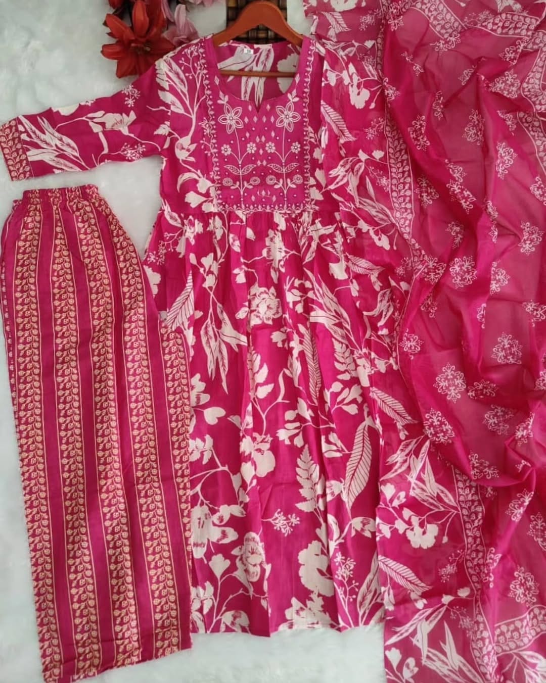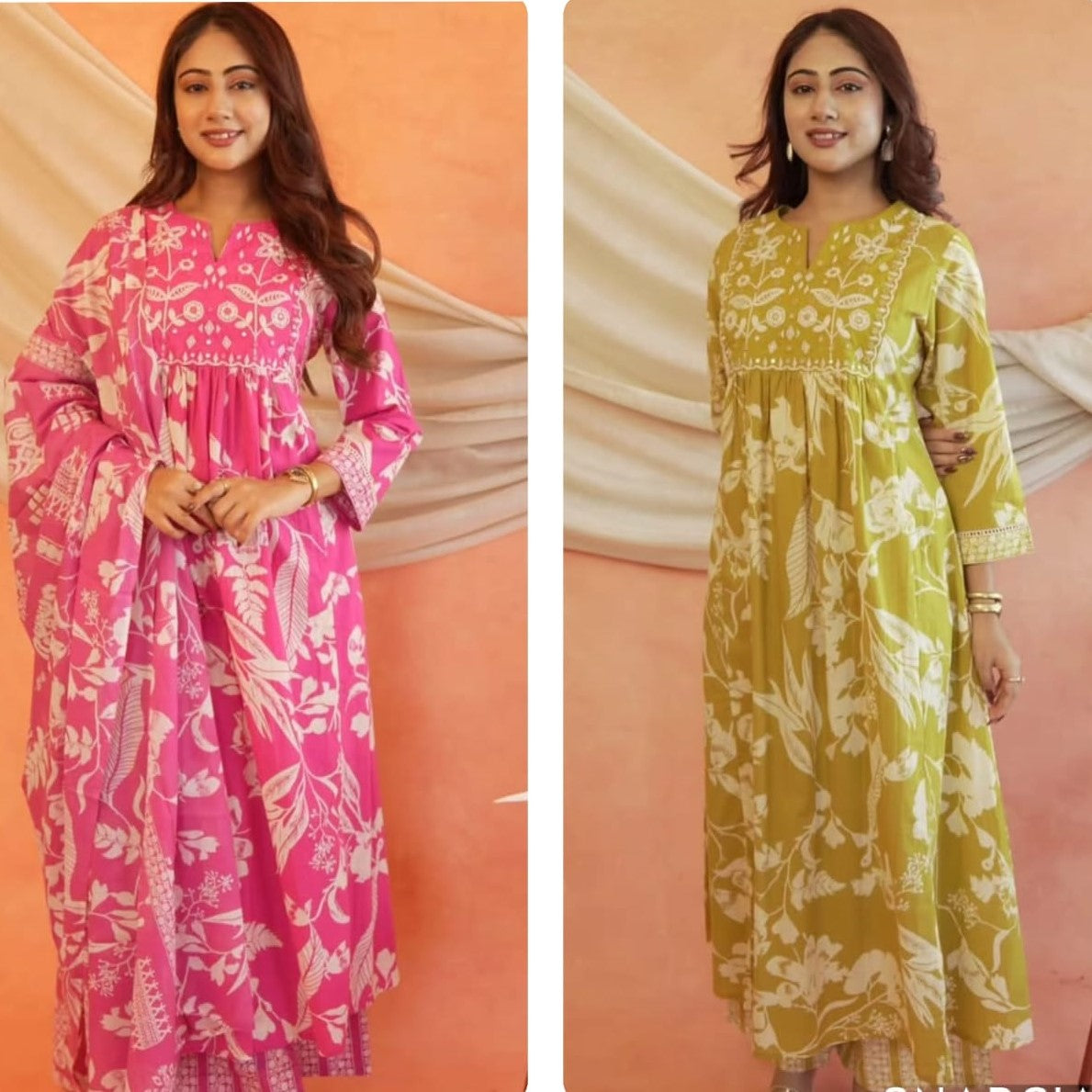 Pink or Yellow Floral Kurti Set with Embroidered Yoke & Dupatta.