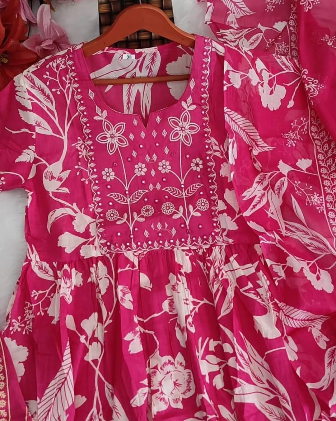 Sheer Floral Dupatta: Made from lightweight fabric, the dupatta echoes the kurti’s floral design to complete the set beautifully.