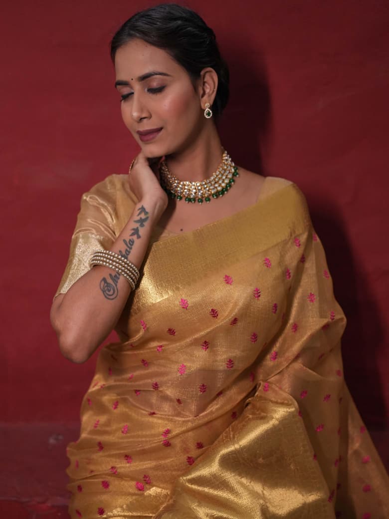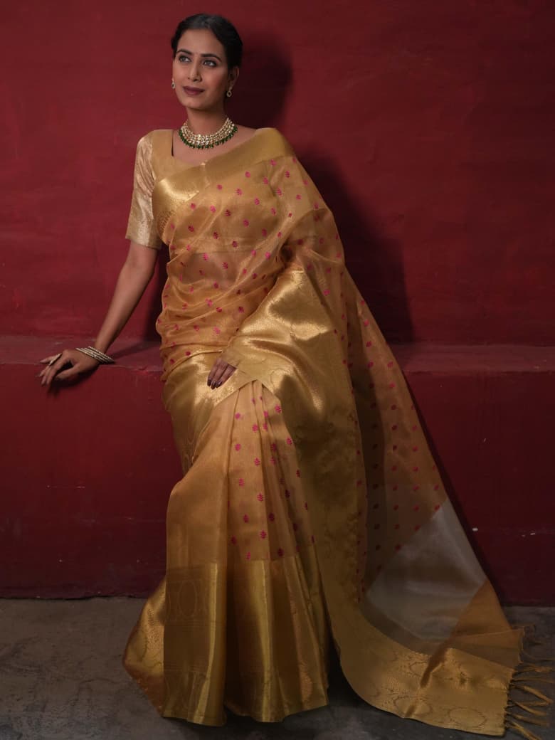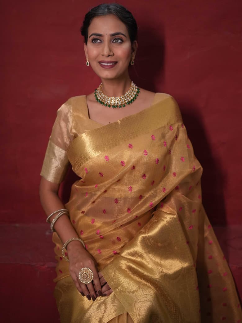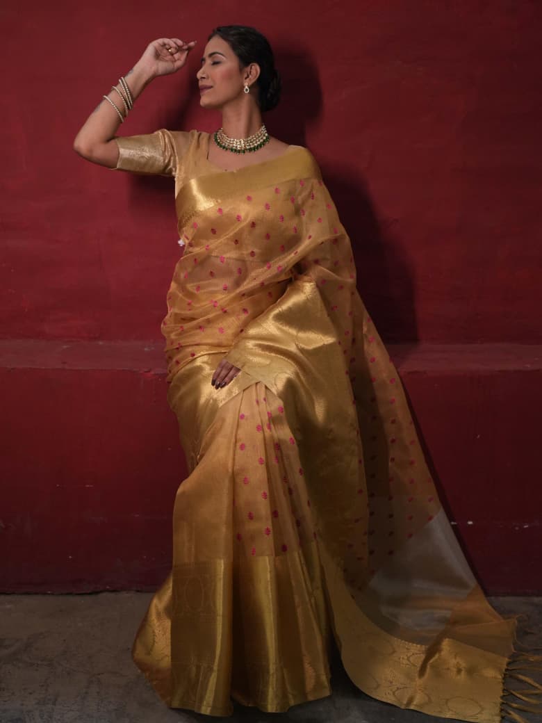 Saree Drape: Classic Banarasi tissue silk weave for a regal and graceful fall