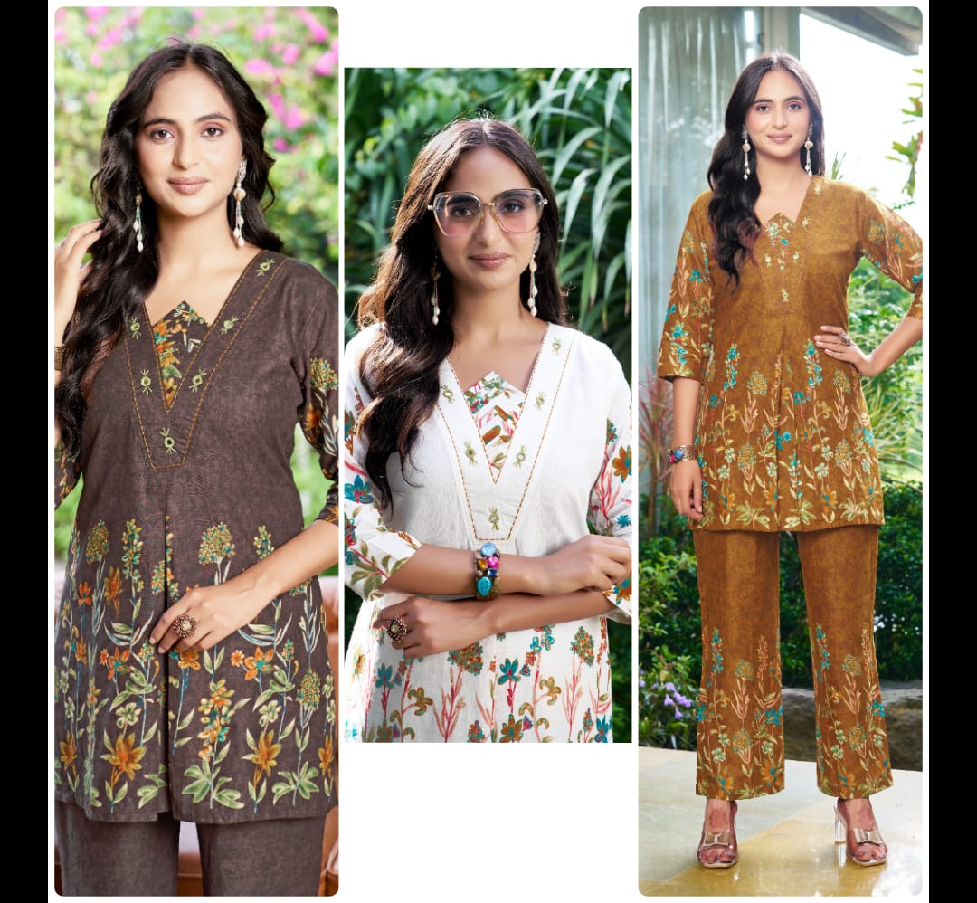 | Silhouette | V-neck A-line kurti paired with tailored matching pants |