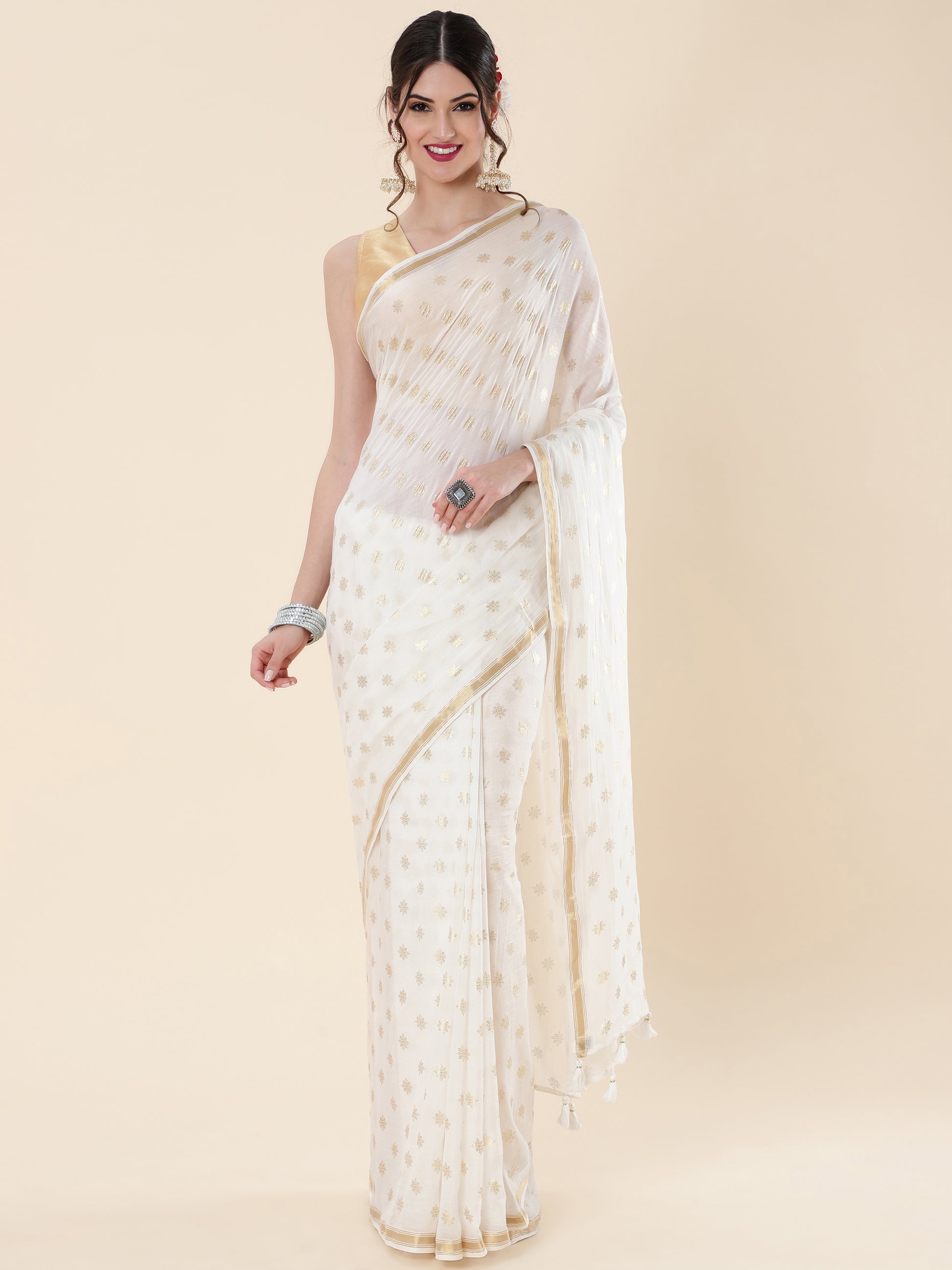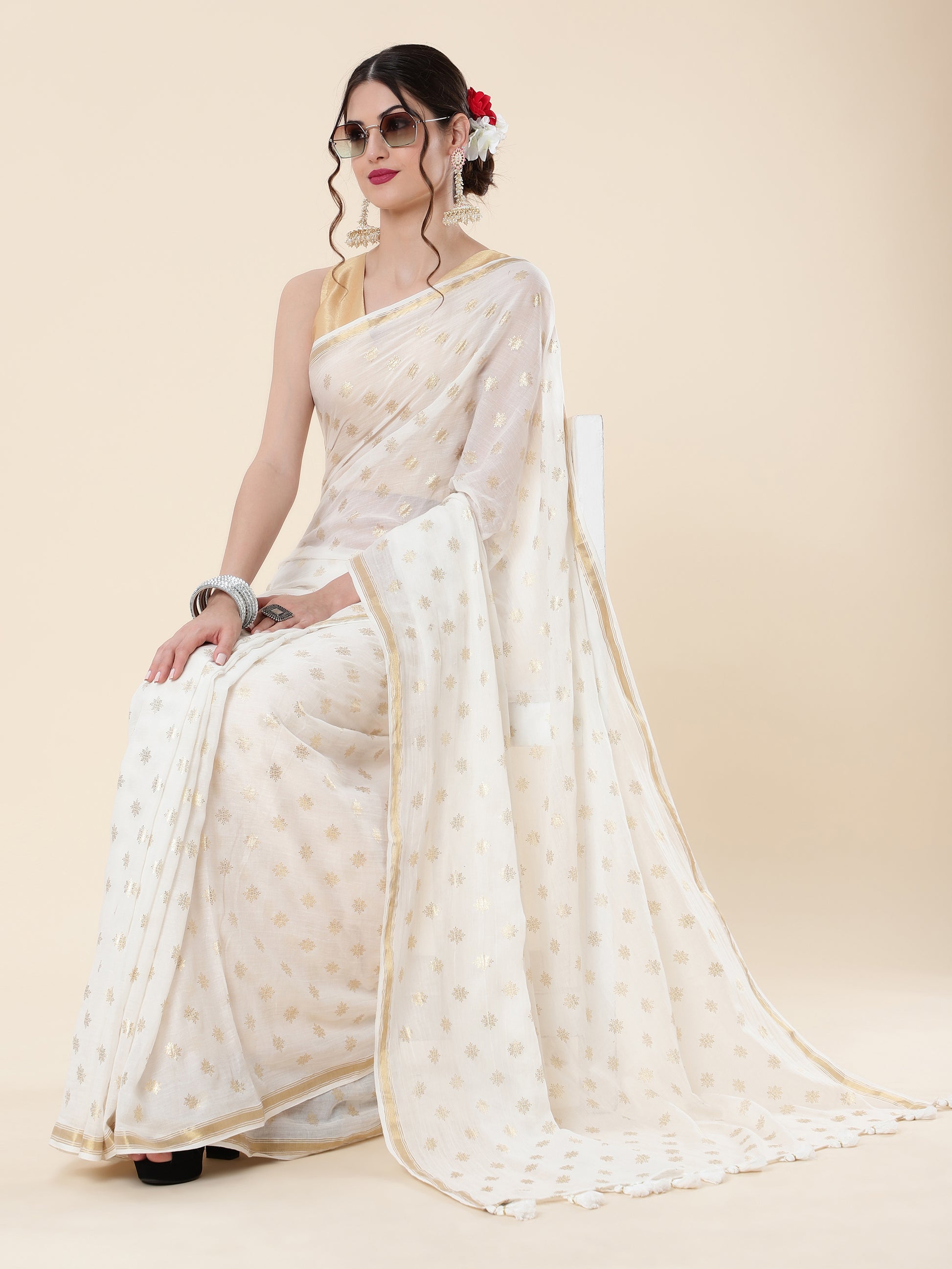 Ivory Viscous Saree, adorned with delicate golden buti dots and a subtle golden border. Crafted from lightweight, breathable fabric, it drapes gracefully for a polished and elegant look. Paired with a matching blouse piece, this saree is perfect for festive occasions, traditional ceremonies, or elegant daytime events.