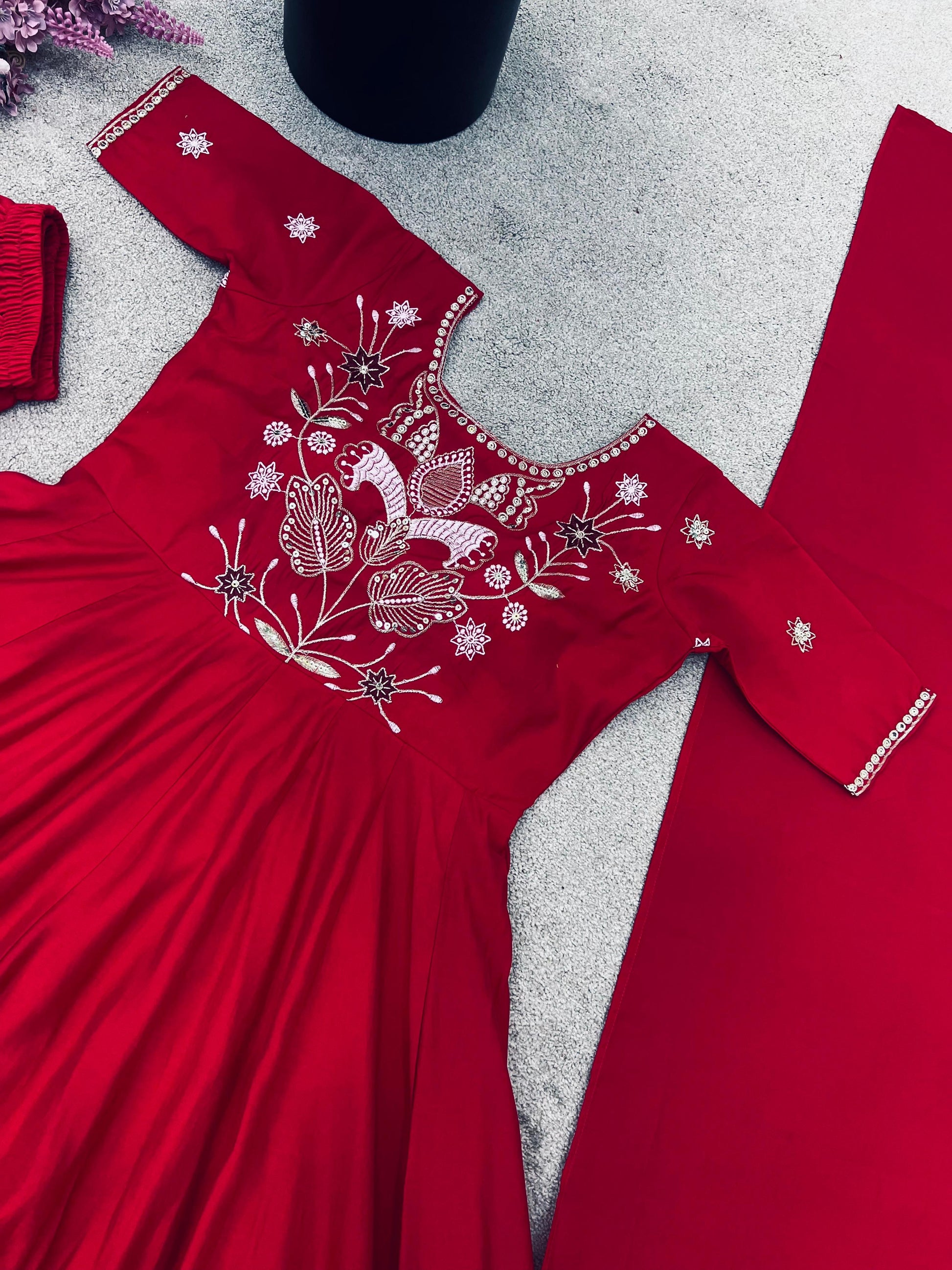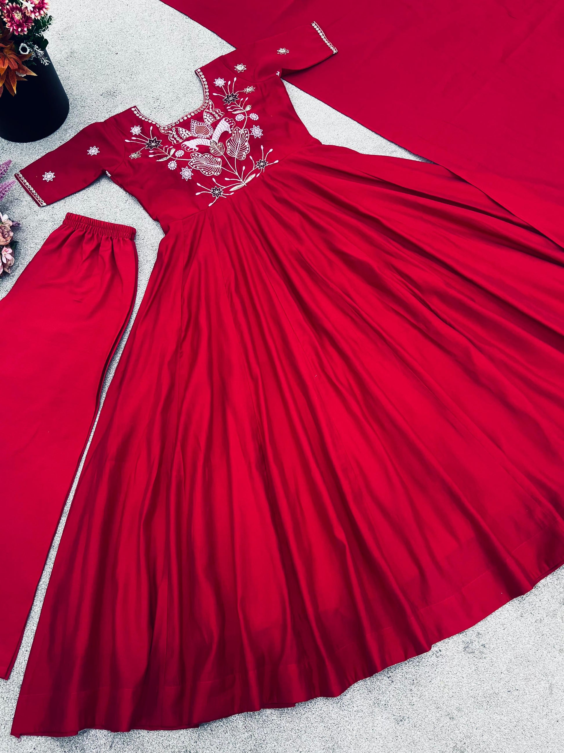 Rich maroon base exudes sophistication, while intricate embroidery on the neckline, fancy neck, and sleeves adds delicate charm without overpowering the look. Flowing Anarkali-style top paired with straight pants and a matching dupatta completes the ensemble, ensuring a harmonious and stylish appearance. Perfect for weddings, receptions, festive gatherings, or evening parties, this ready-to-wear set combines comfort, grace, and luxury.