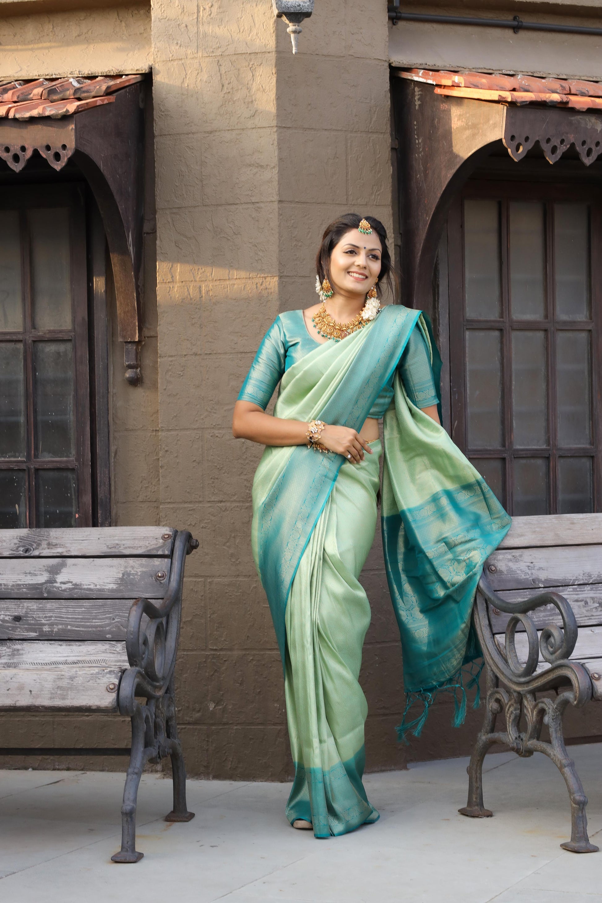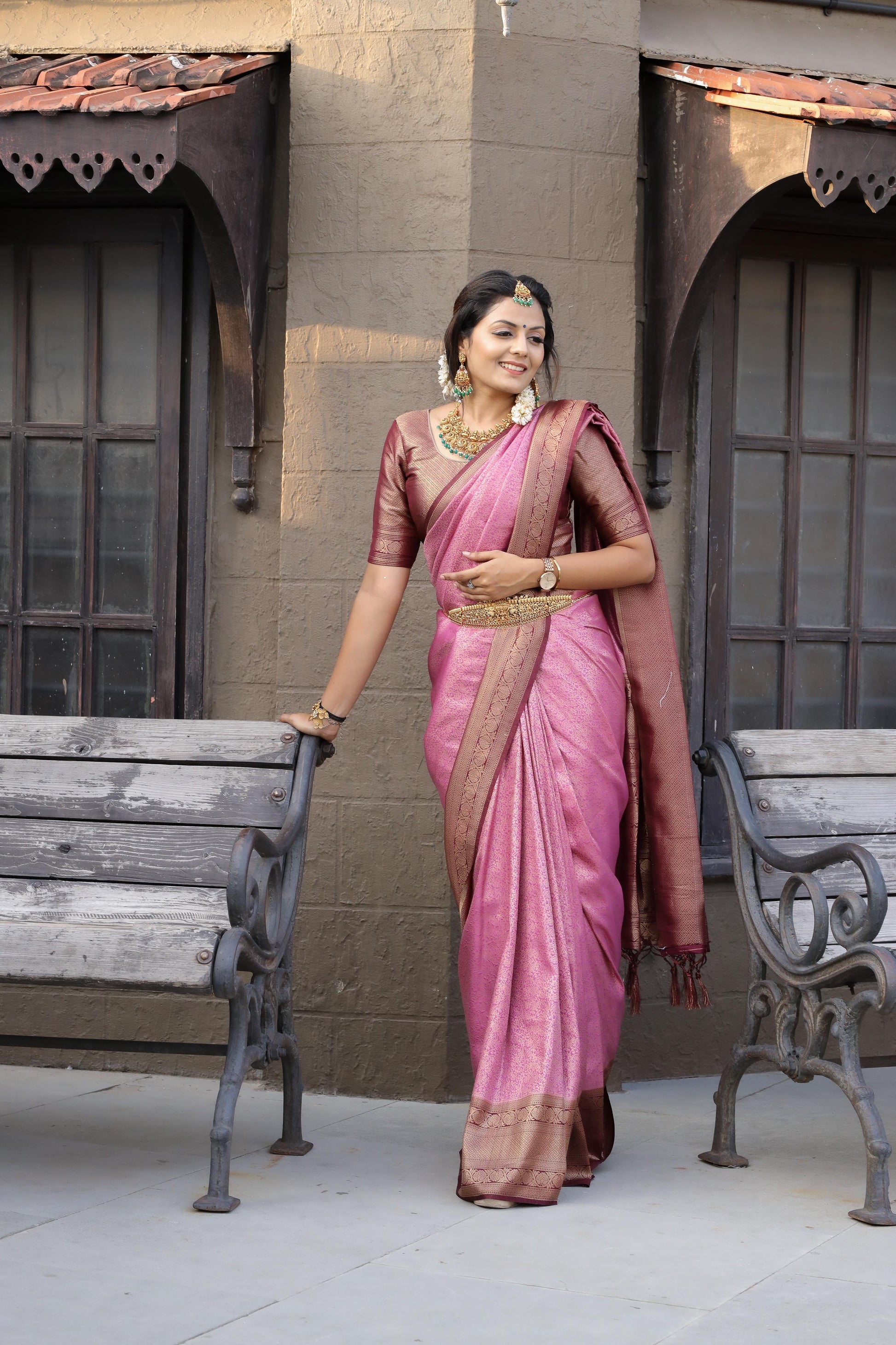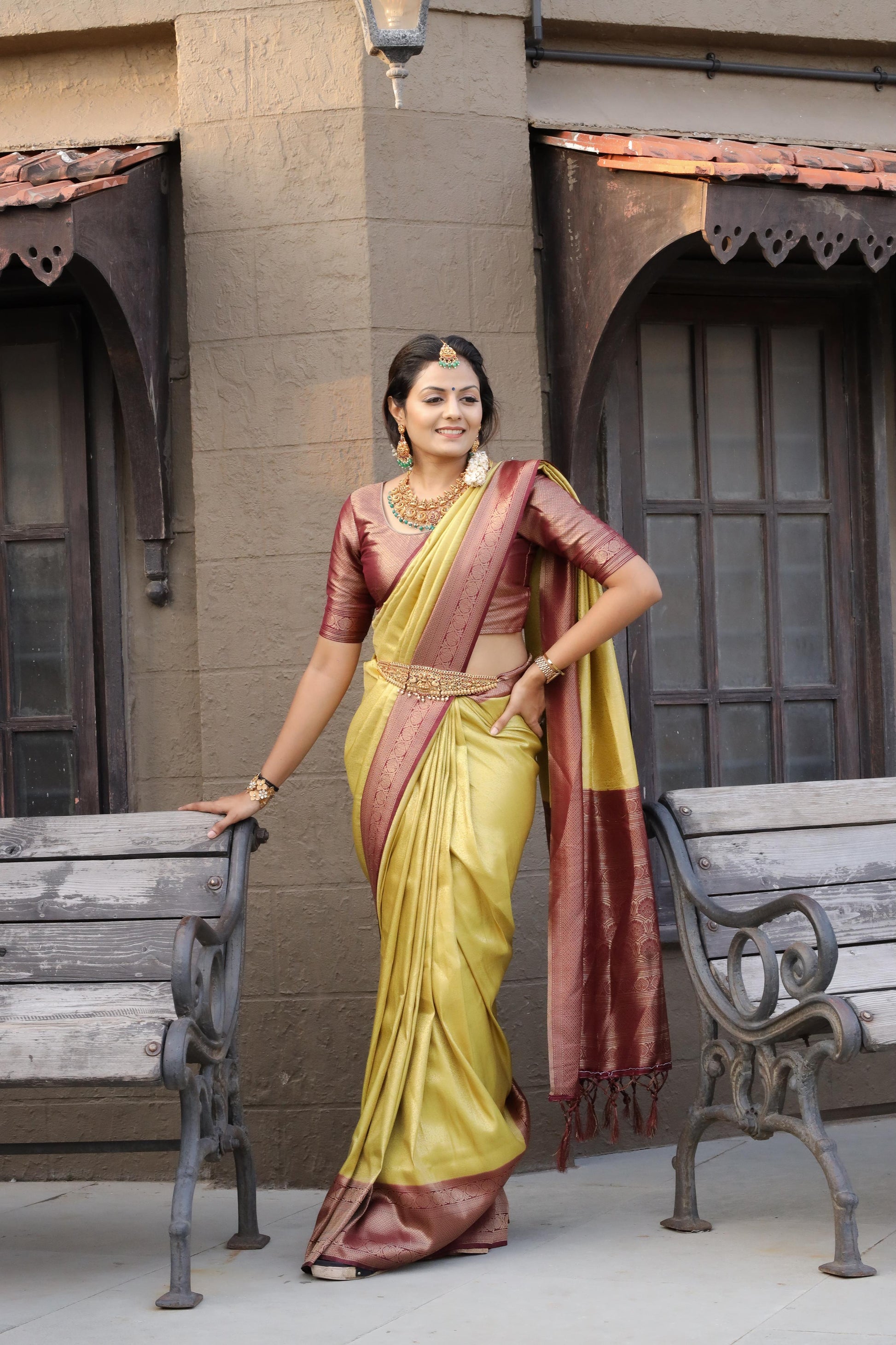 Soft semi-Kanchivaram saree, crafted in premium soft silk. The saree features a richly woven pallu and exquisite jacquard work throughout, radiating traditional elegance with a modern touch. Paired with a matching blouse in woven fabric with an exclusive jacquard border, this ensemble ensures a complete, regal look for weddings, festive occasions, or special gatherings.