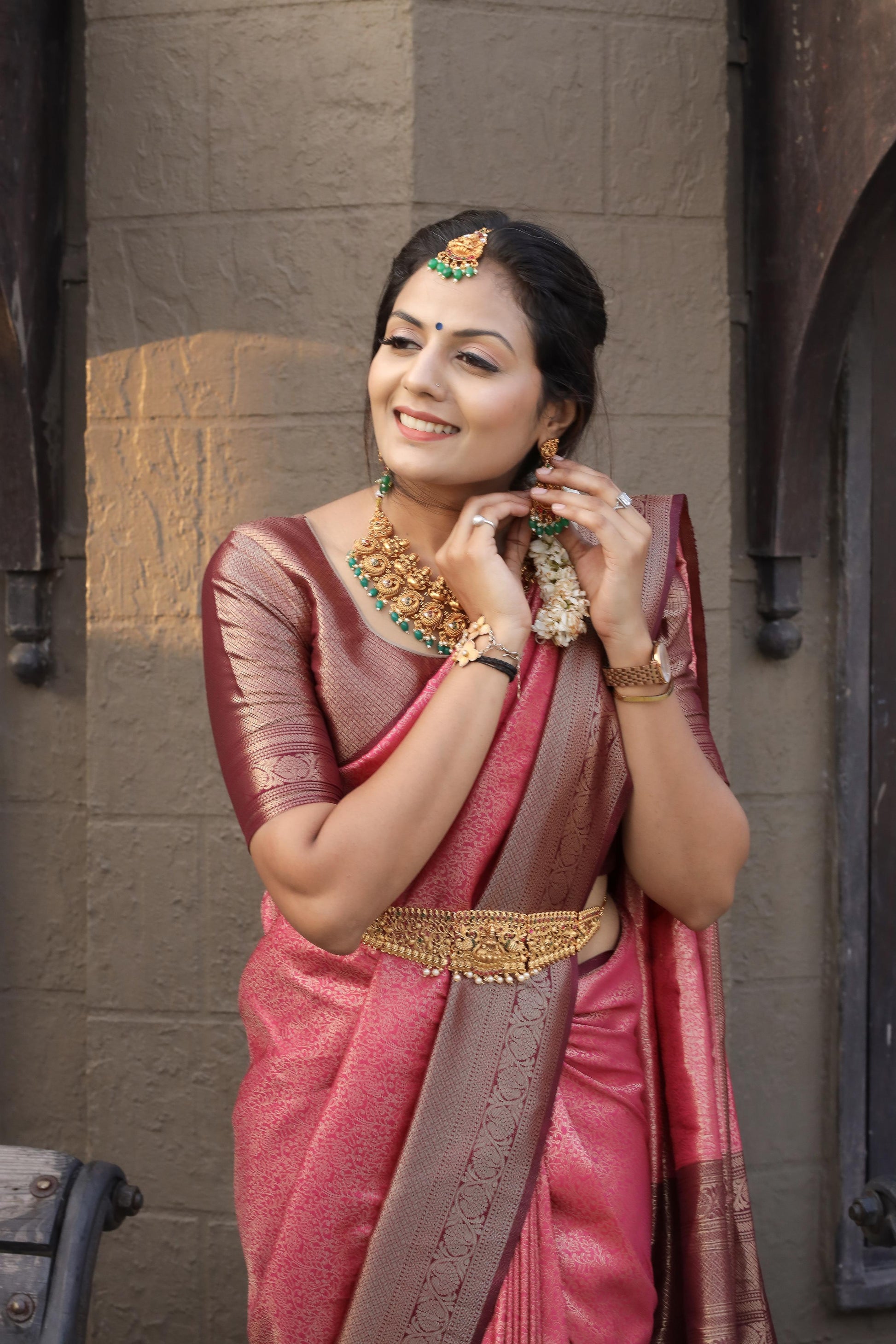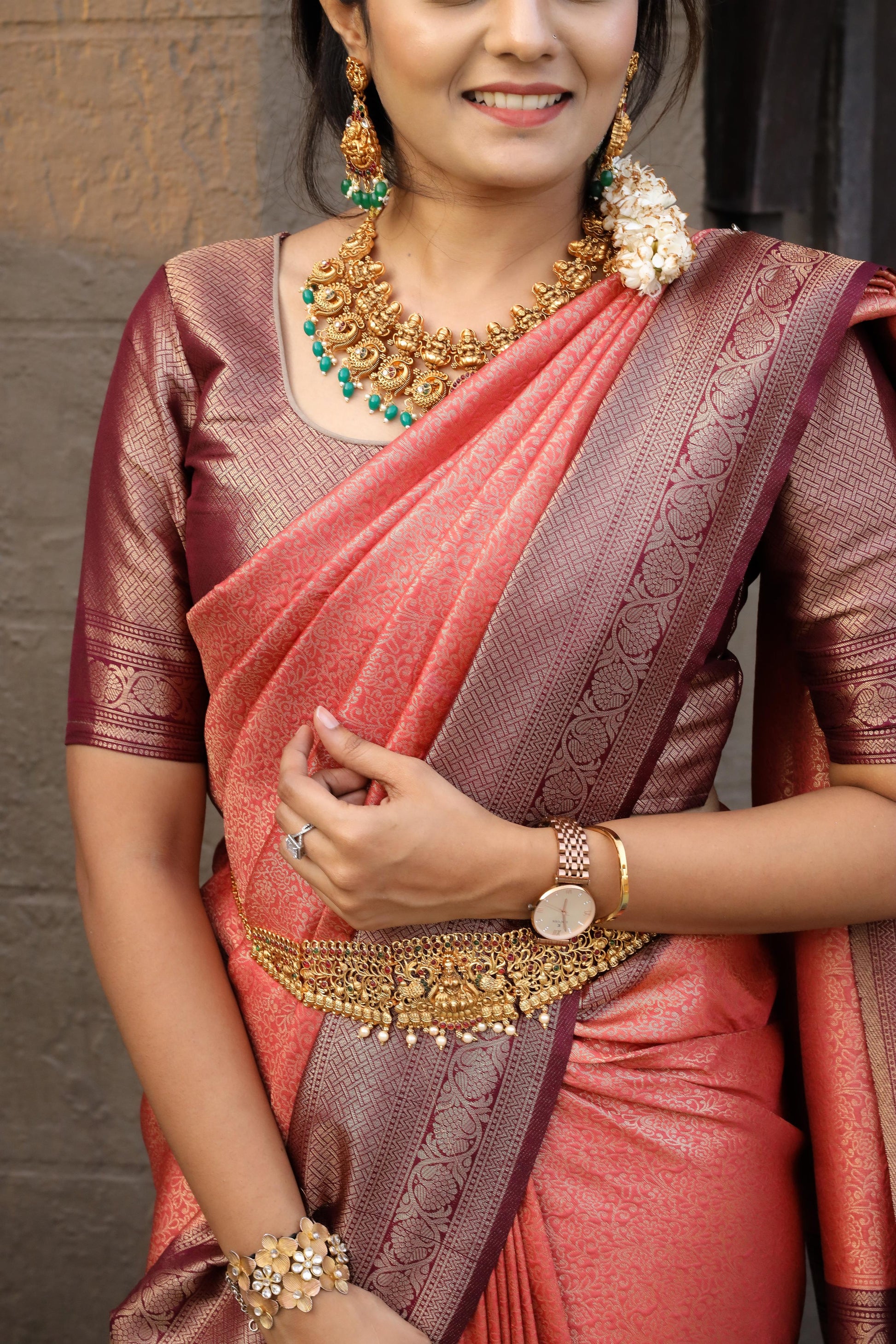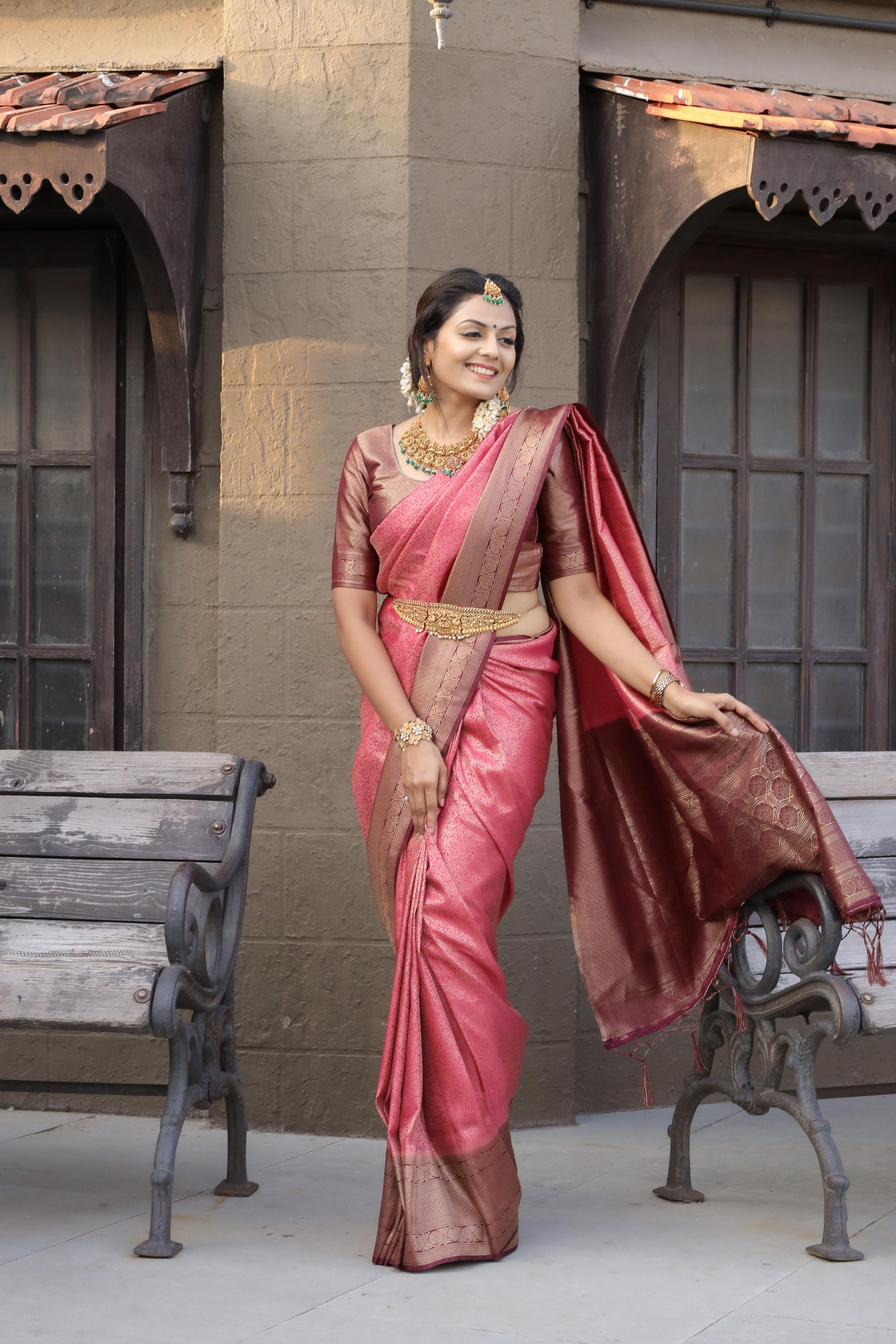 Soft semi-Kanchivaram saree, crafted in premium soft silk. The saree features a richly woven pallu and exquisite jacquard work throughout, radiating traditional elegance with a modern touch. Paired with a matching blouse in woven fabric with an exclusive jacquard border, this ensemble ensures a complete, regal look for weddings, festive occasions, or special gatherings.