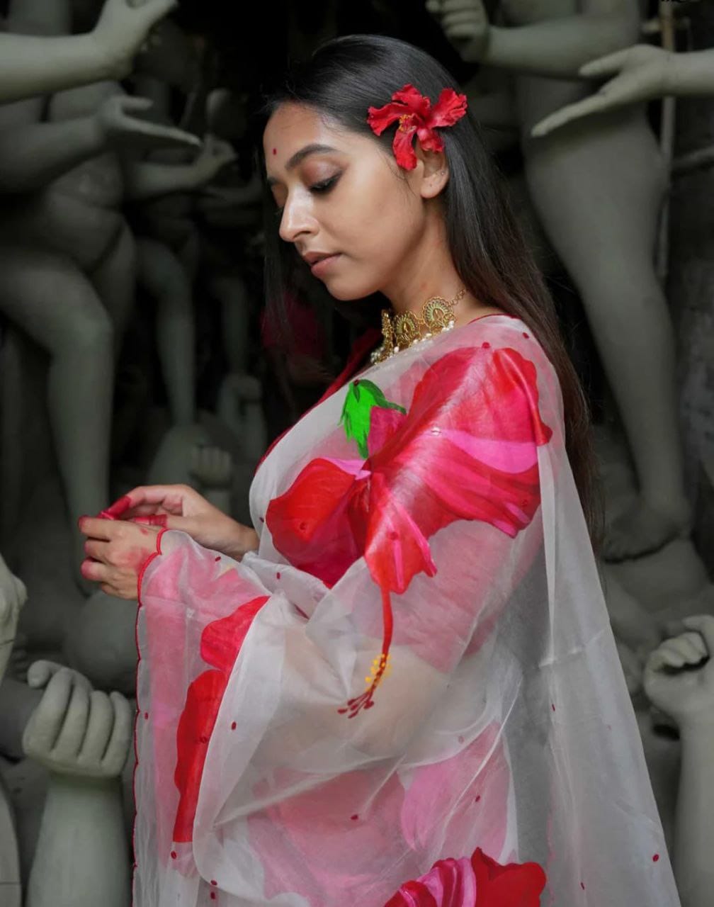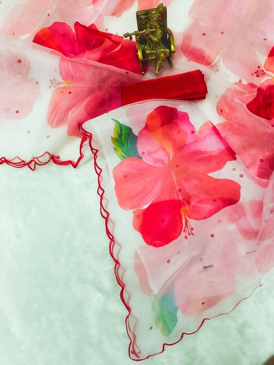 Stay beautiful and graceful in our printed organza saree, featuring intricate aari work on smooth, lustrous silk. The digitally printed motifs add modern elegance, while the fabric ensures the perfect balance of sheen and comfort.