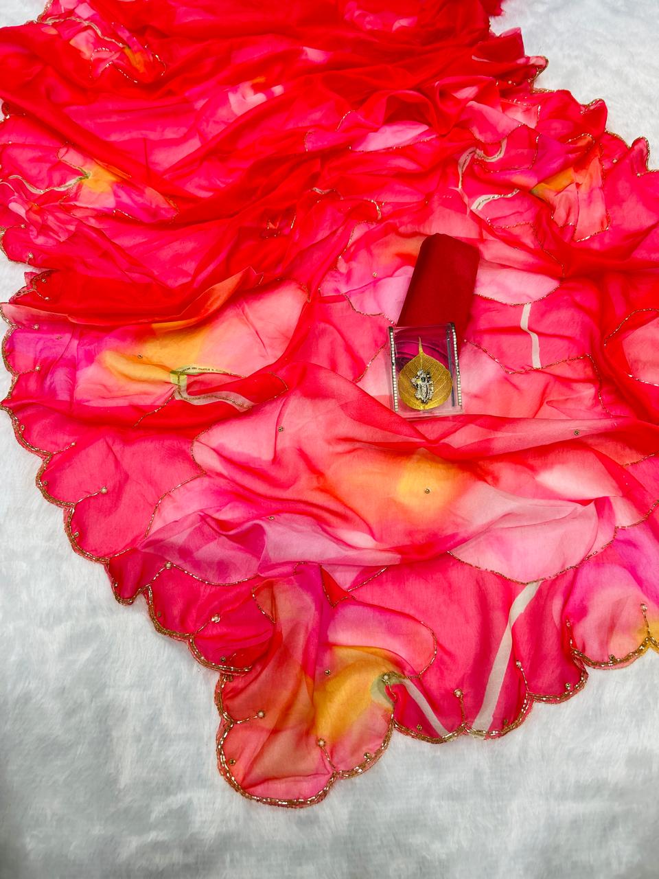 The border is adorned with exquisite Val moti (beaded) handwork, lending a touch of luxury and craftsmanship. Paired with a matching soft satin silk blouse, detailed with delicate neckline handwork, this ensemble is perfect for festive celebrations, weddings, or elegant gatherings.