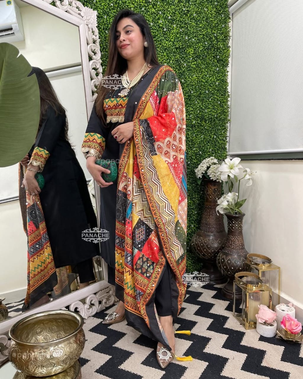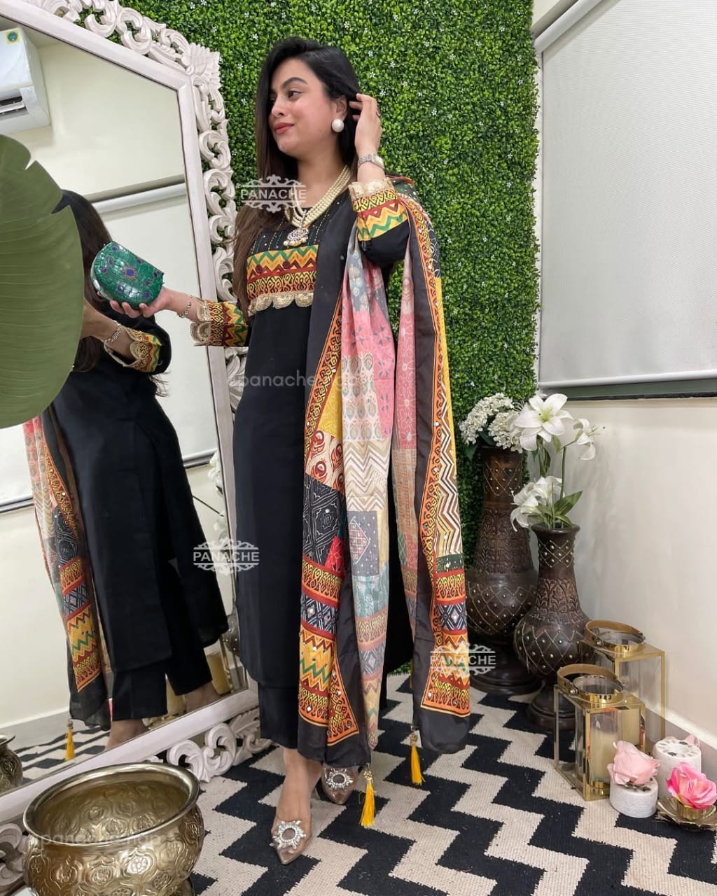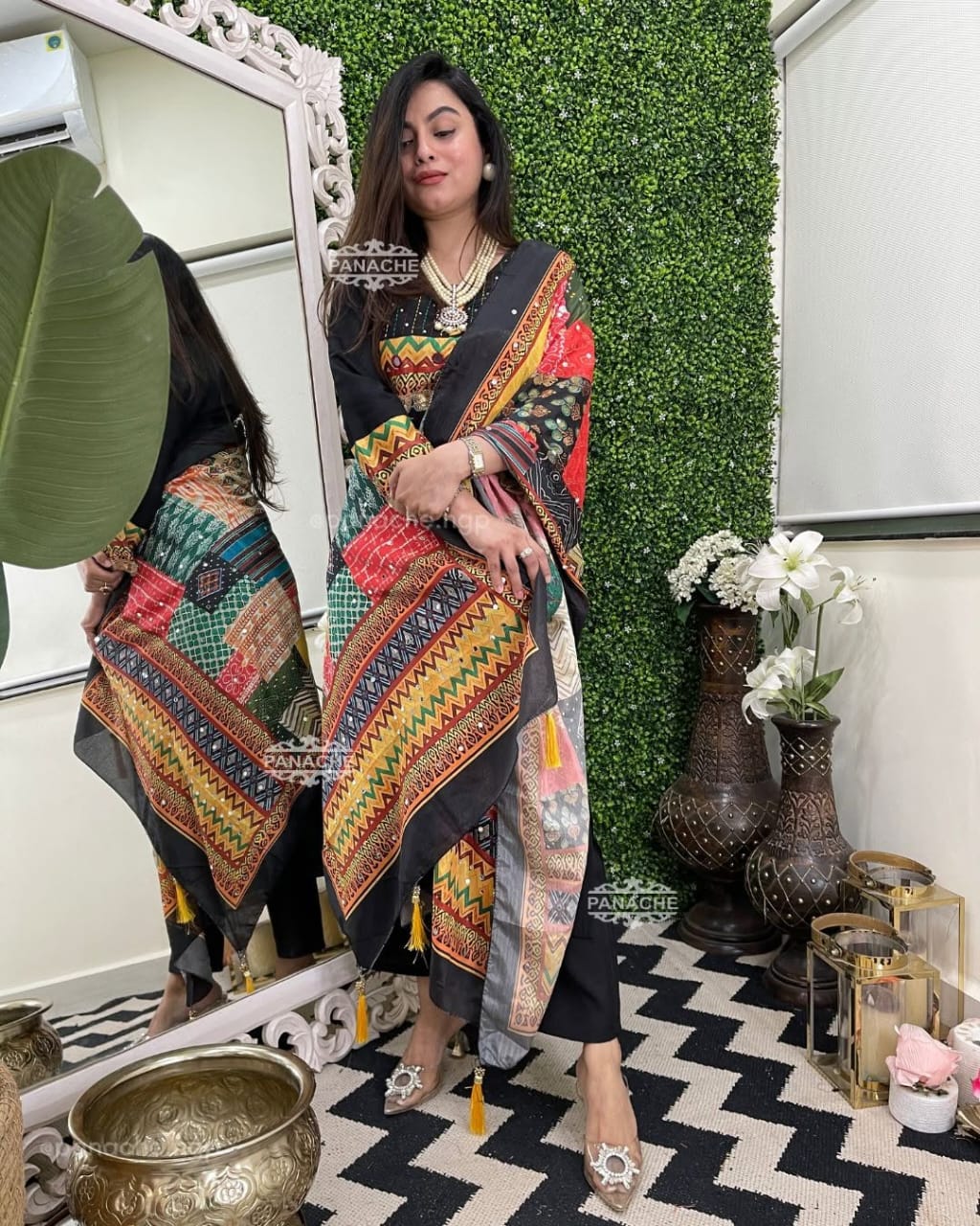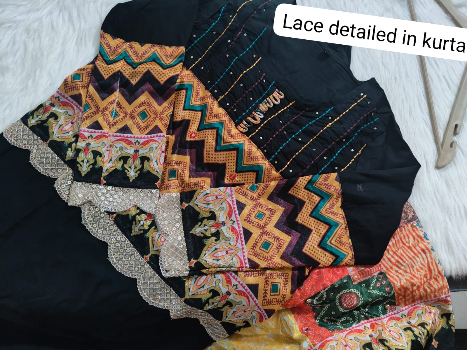The kurti features intricate hand-thread embroidery and lace detailing on a rich base, paired with straight-cut trousers for a sleek silhouette. The highlight of this ensemble is the vibrant dupatta, adorned with eclectic geometric and traditional prints, finished with tassels for a playful touch. Designed to blend tradition with modern artistry, this set is perfect for festive gatherings, cultural occasions, or chic evening outings.