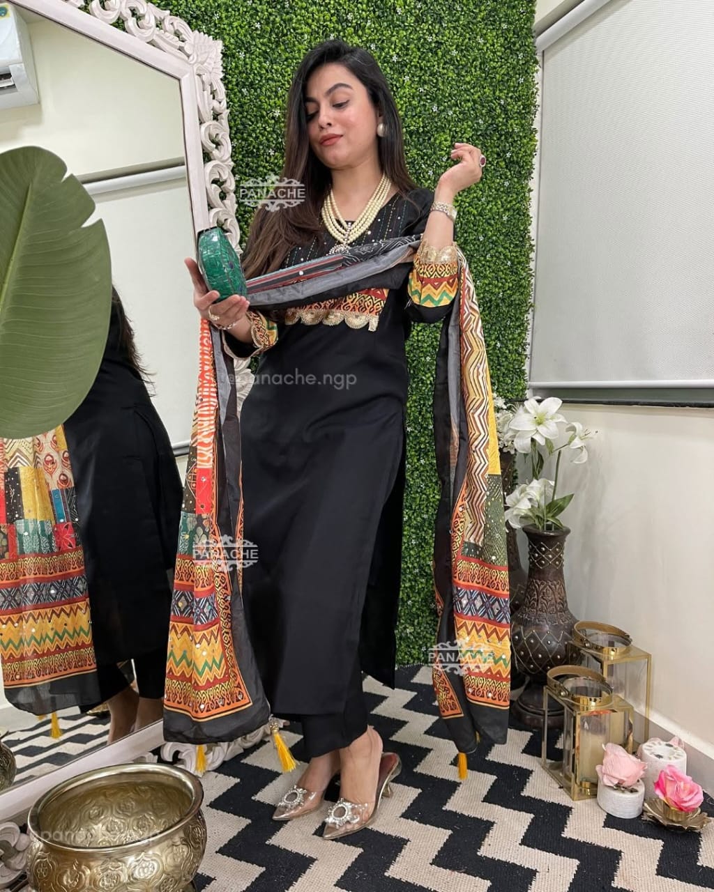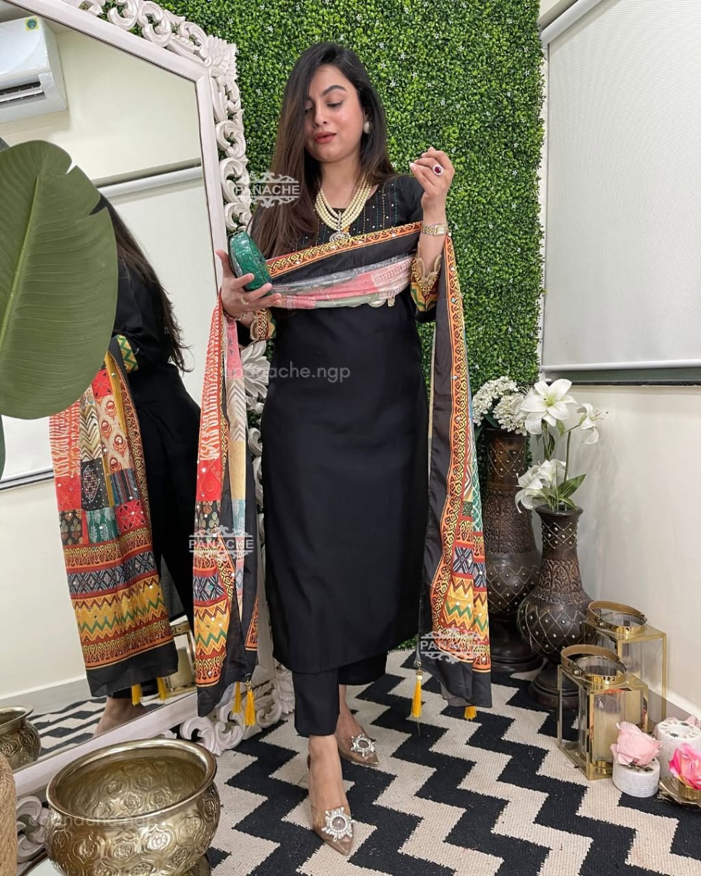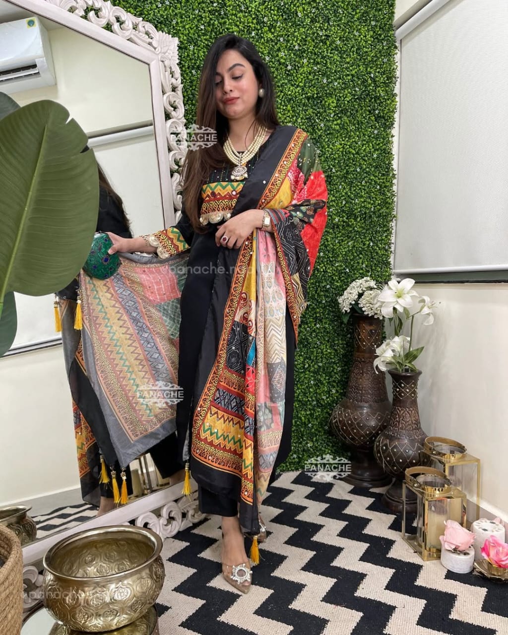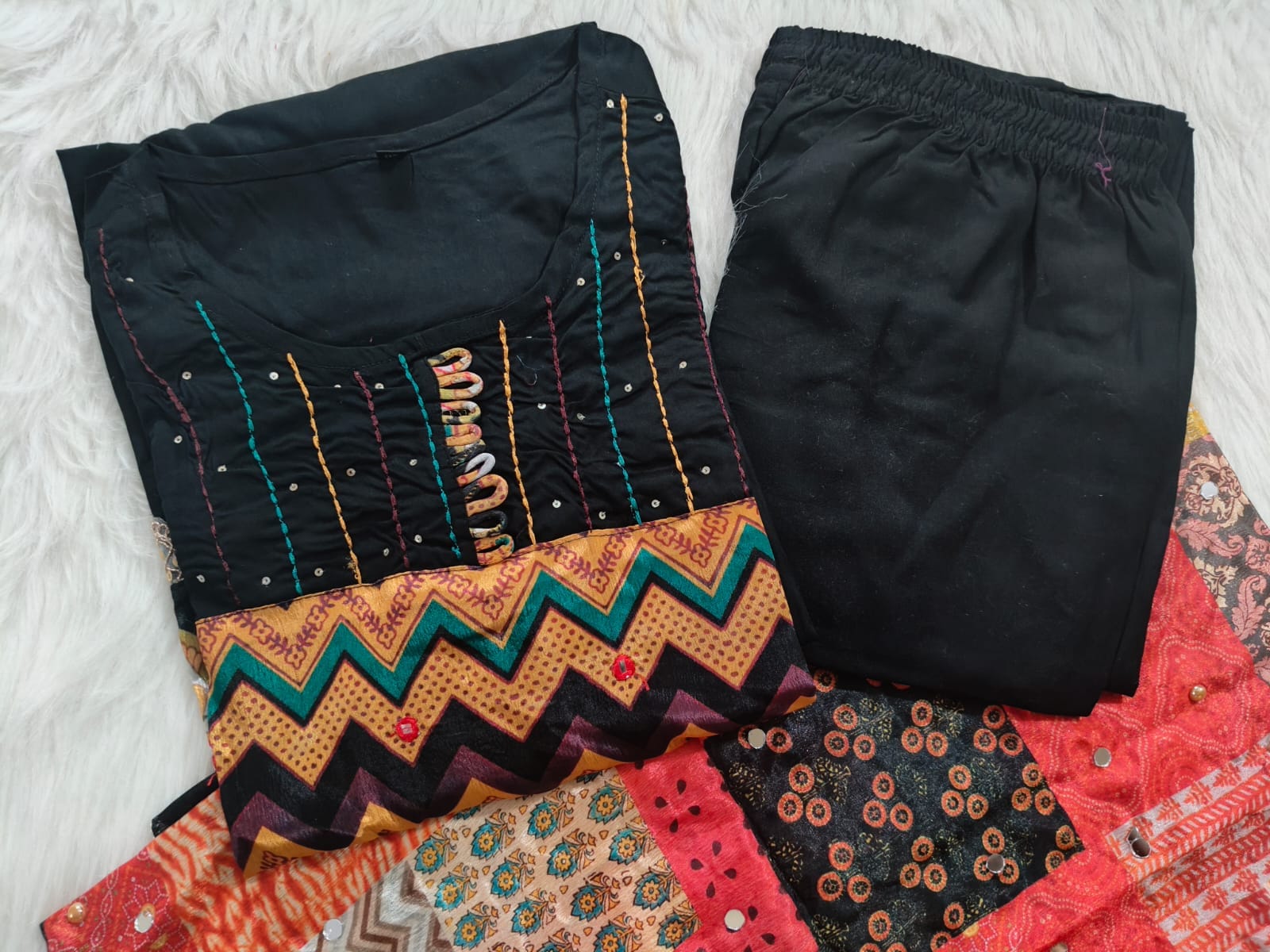 Black Rayon Kurti Set with Embroidered Detailing & Printed Dupatta